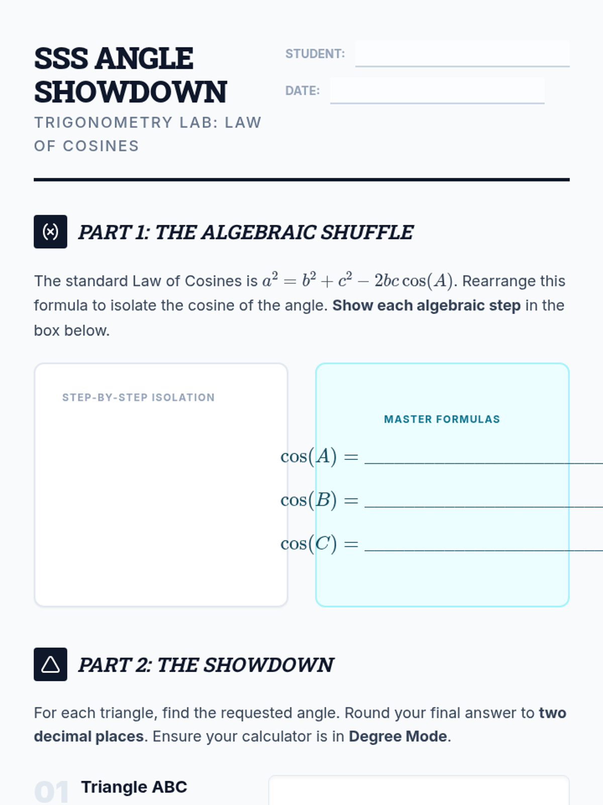 A worksheet for students to practice rearranging the Law of Cosines formula and applying it to solve three SSS triangle problems, including a final logic check.