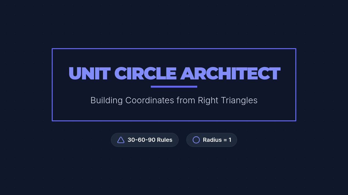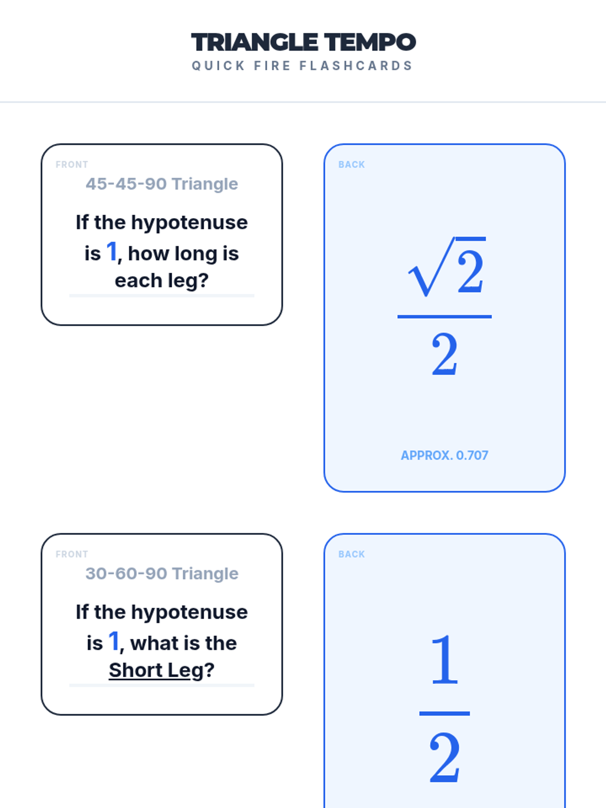A set of quick-fire flashcards for students to build fluency with special right triangle ratios when the hypotenuse is 1. Covers 45-45-90 and 30-60-90 ratios and a key strategy for handling variable conflicts in problems.