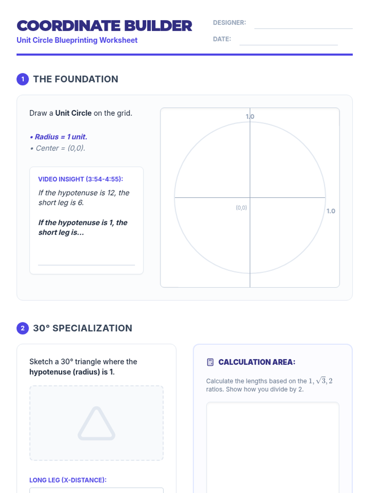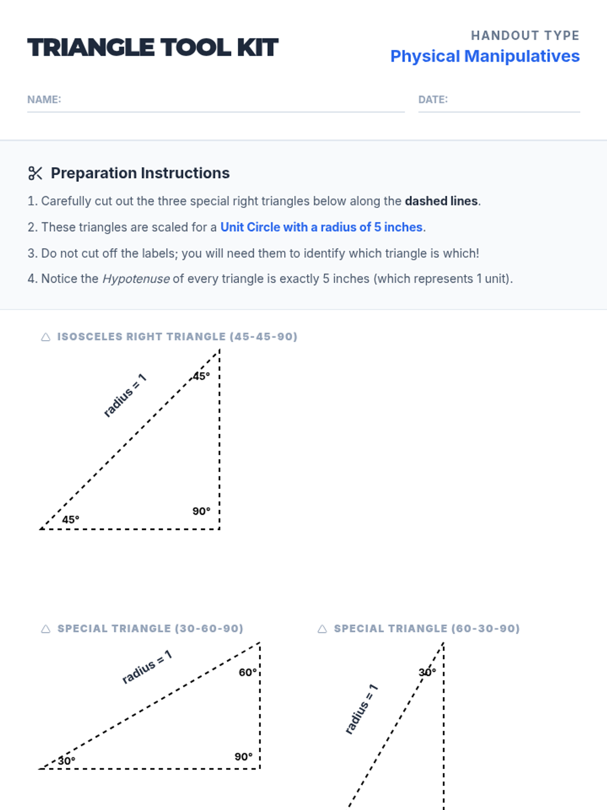 A set of printable, scaled special right triangles for hands-on unit circle construction. Includes 45-45-90 and 30-60-90 triangles with hypotenuse length 1, clearly labeled with their geometric ratios to facilitate coordinate discovery.