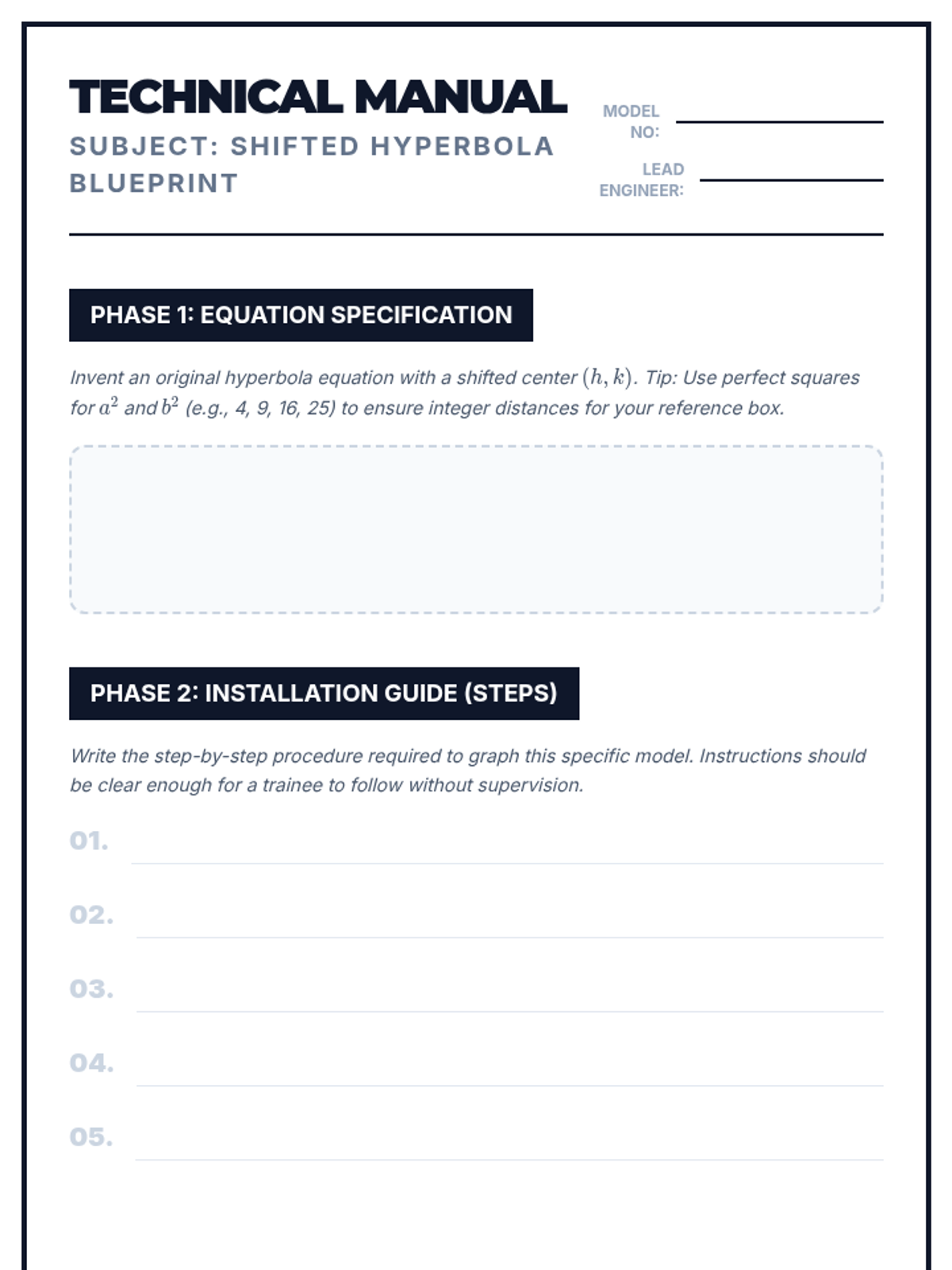 Answer key for the Master Sketcher project, detailing the full algebraic transformation and final standard form for the given hyperbola.