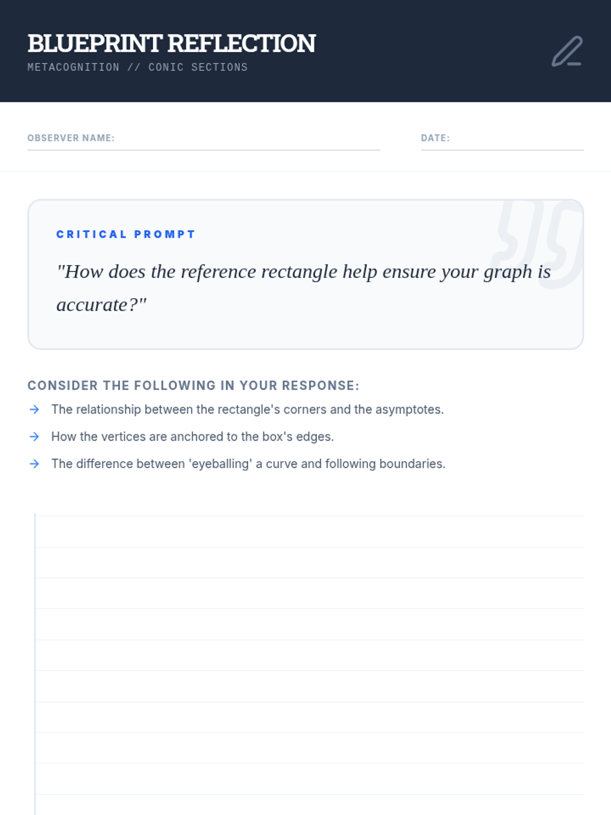 Planning and drafting sheet for the Blueprint Challenge project, featuring a coordinate grid for logo sketching and sections for documenting both standard and general conic equations.