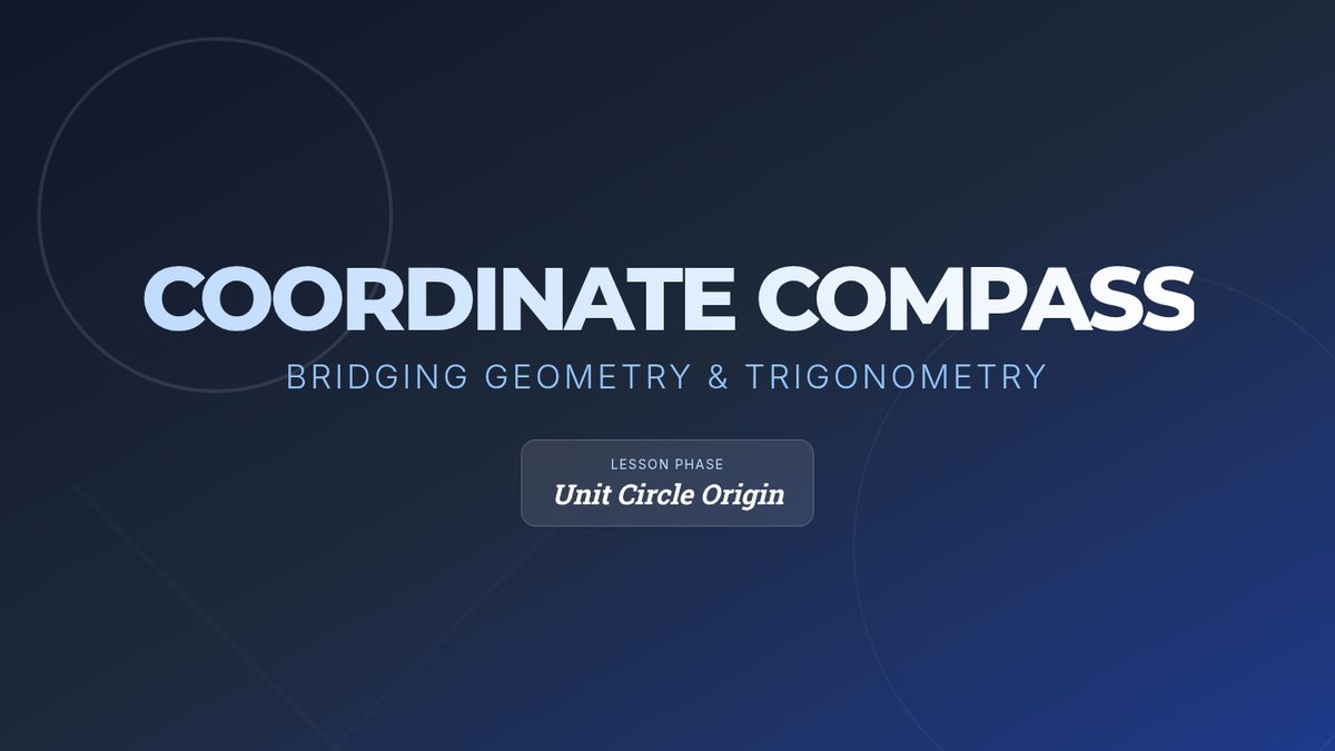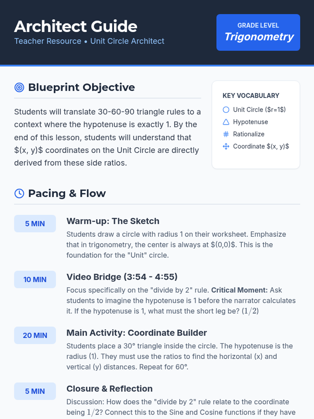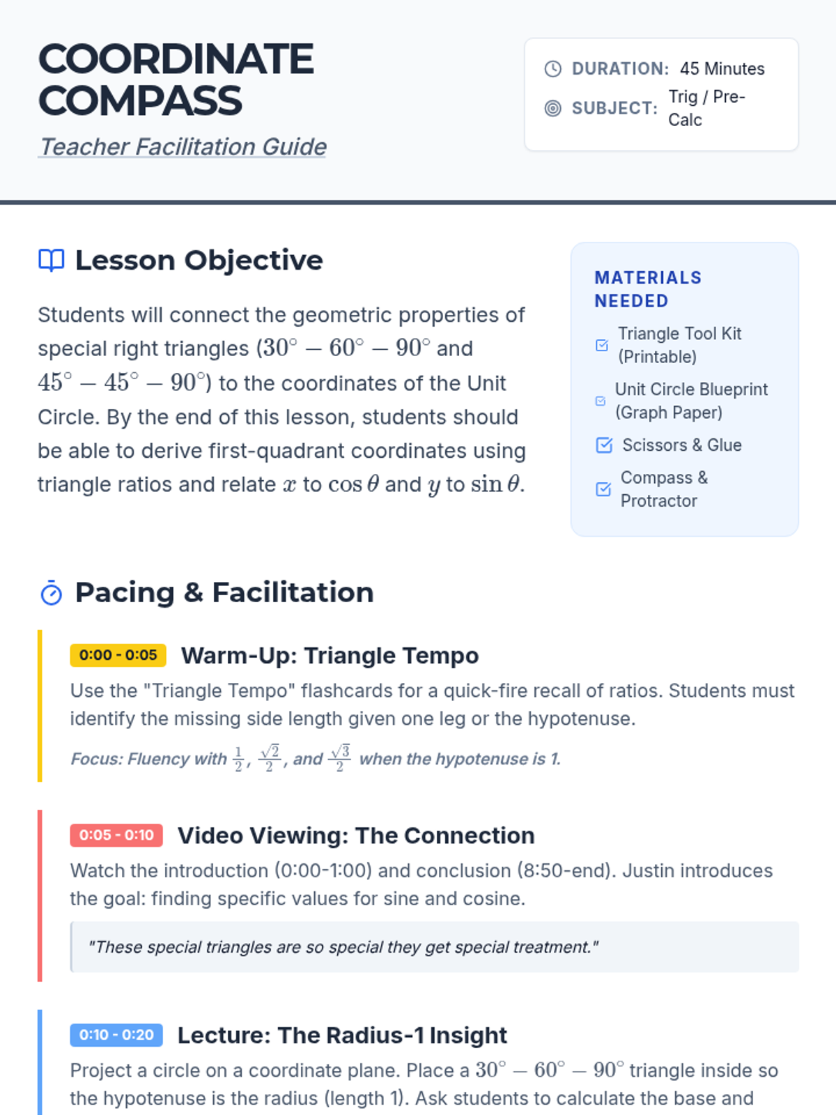 A comprehensive teacher guide for the Coordinate Compass lesson, featuring a 45-minute pacing guide, discussion prompts, an answer key for the unit circle first quadrant, and pedagogical tips on scale and common student misconceptions.