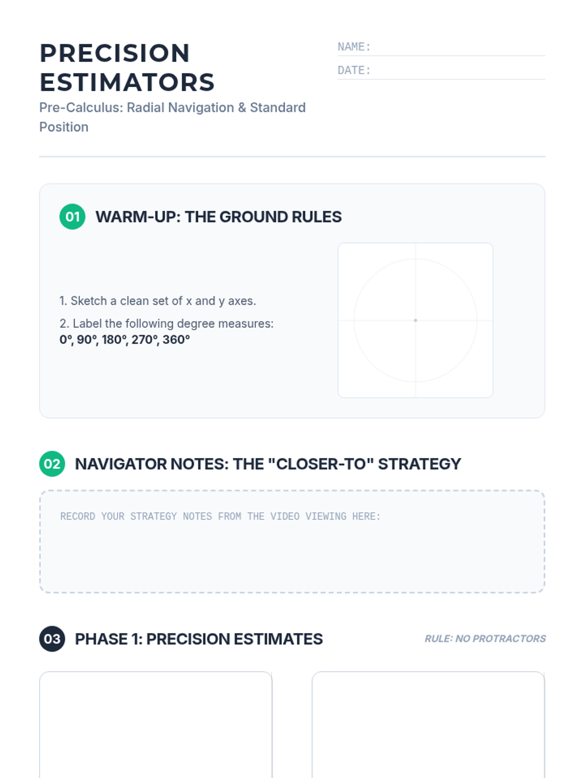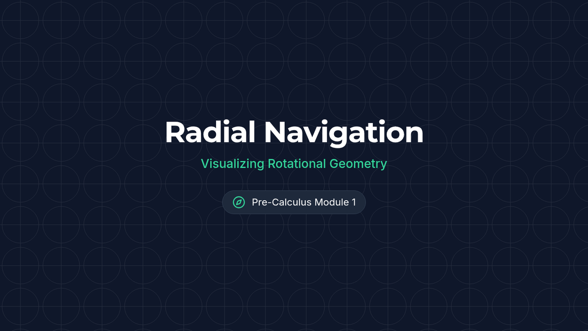 Visual presentation for the 'Radial Navigation' lesson, featuring interactive warm-up instructions, a video placeholder for standard position angles, and the 'Closer-To' strategy for logical estimation.