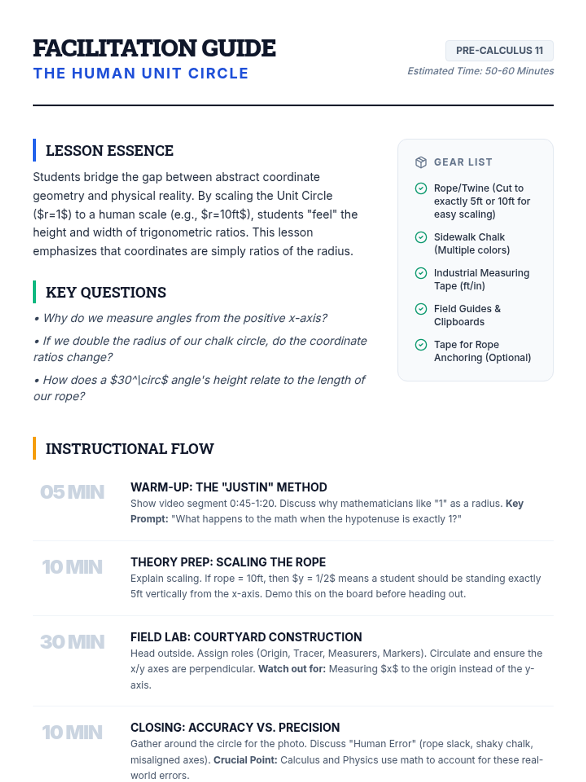 A comprehensive facilitator's guide for the Human Unit Circle lesson, including prep checklists, pacing, scaling guides, and common pitfalls.