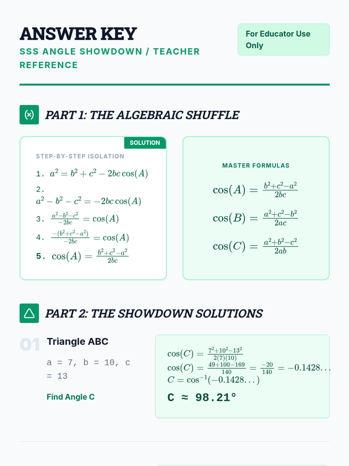 A complete answer key for the SSS Angle Showdown worksheet, including step-by-step algebraic rearrangement and full solutions for all problems.