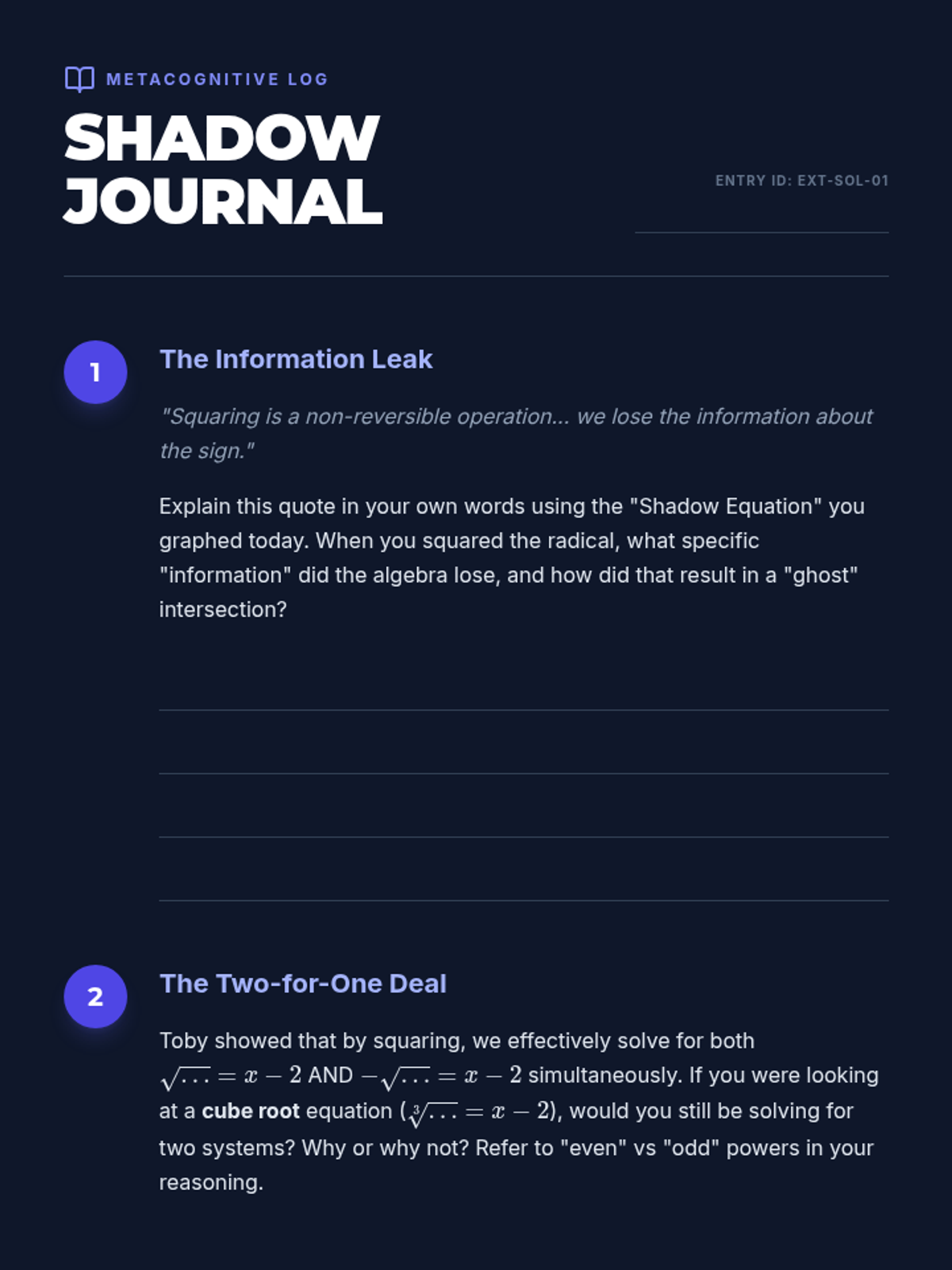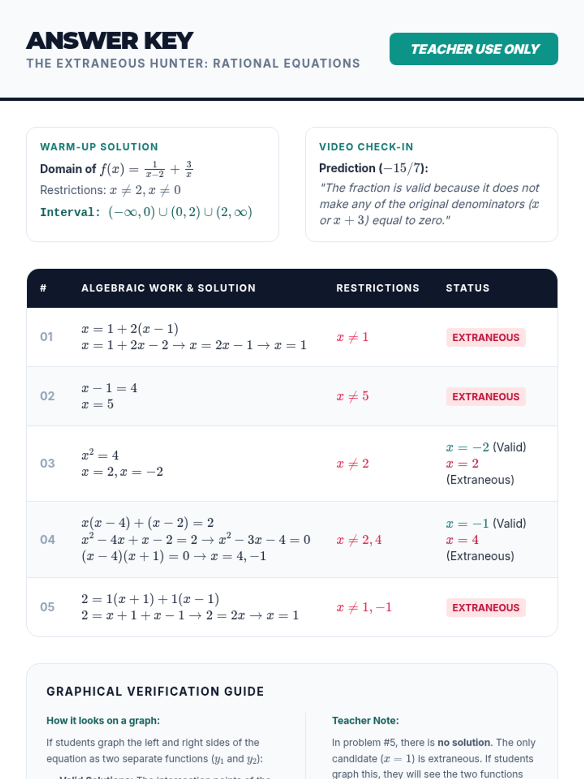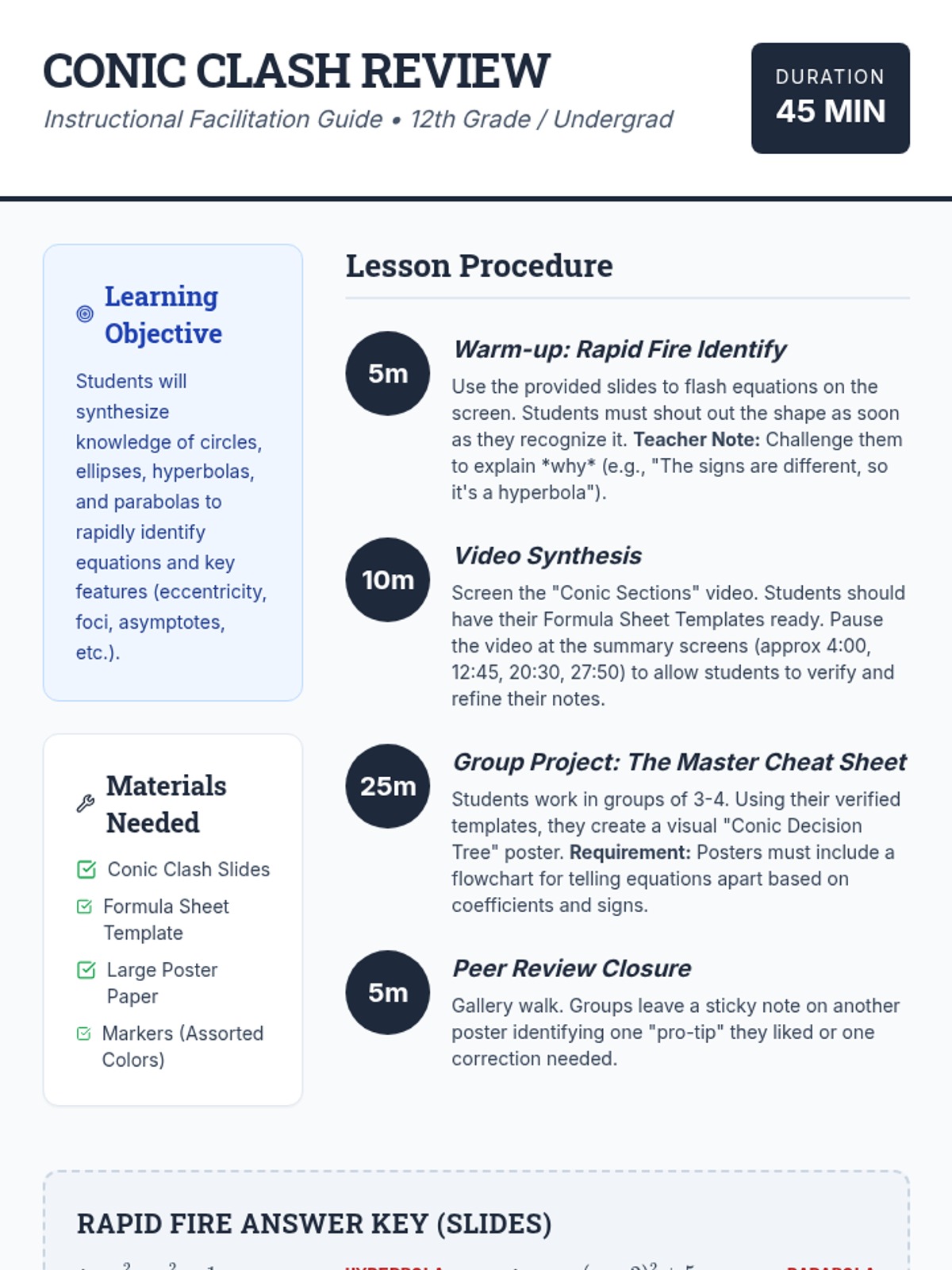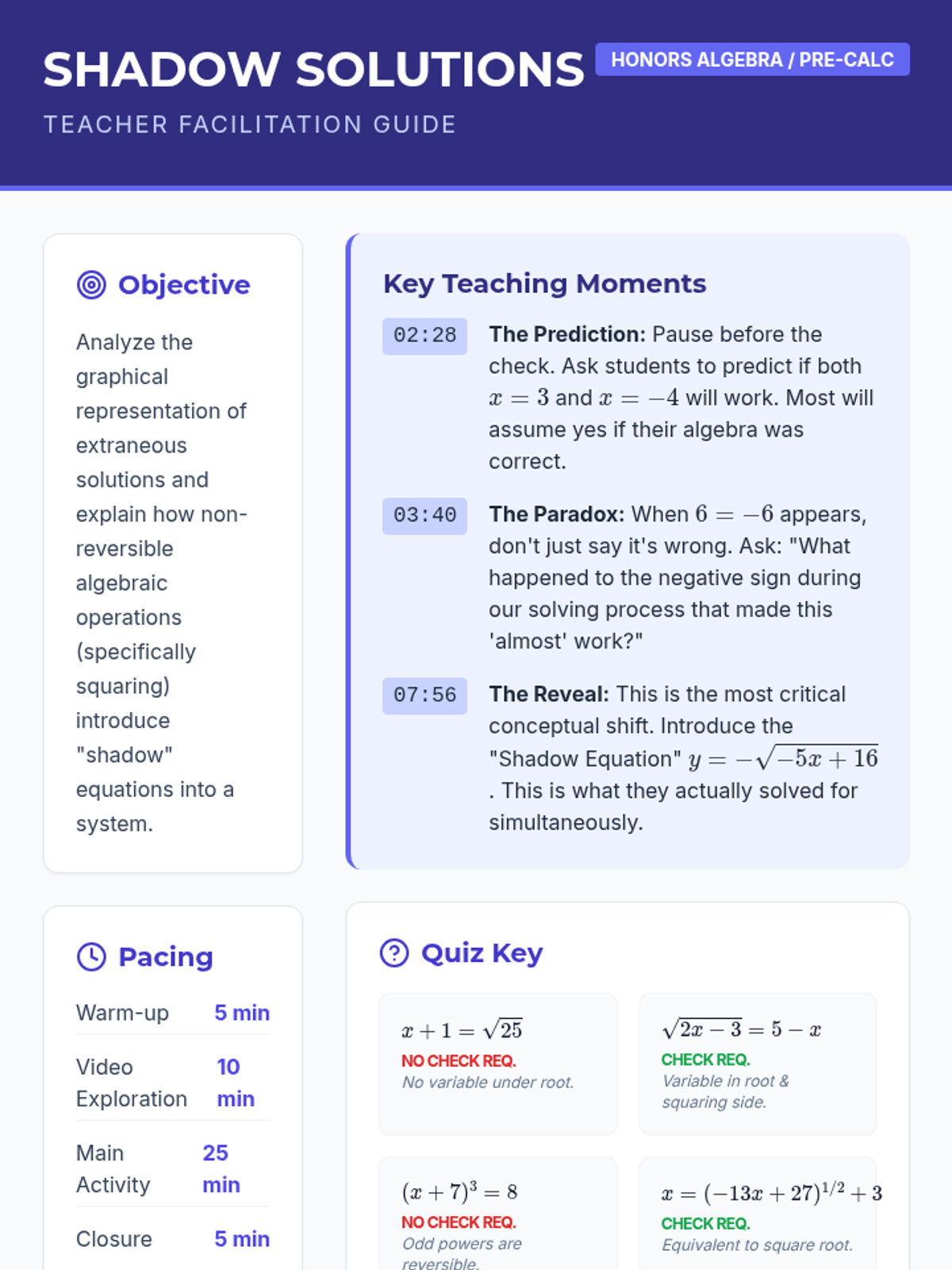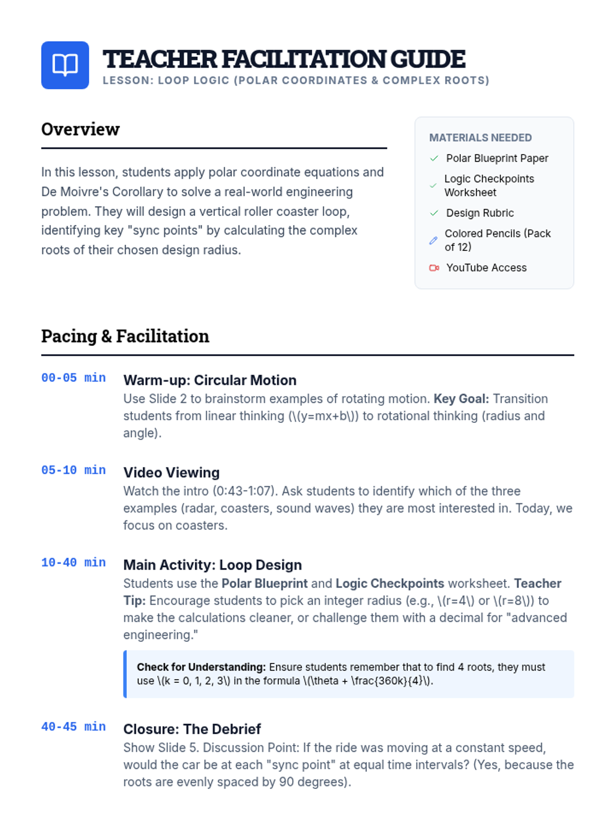 A comprehensive teacher facilitation guide for the Loop Logic lesson. Includes pacing, materials list, teaching tips, and a sample answer key for the complex root calculations.