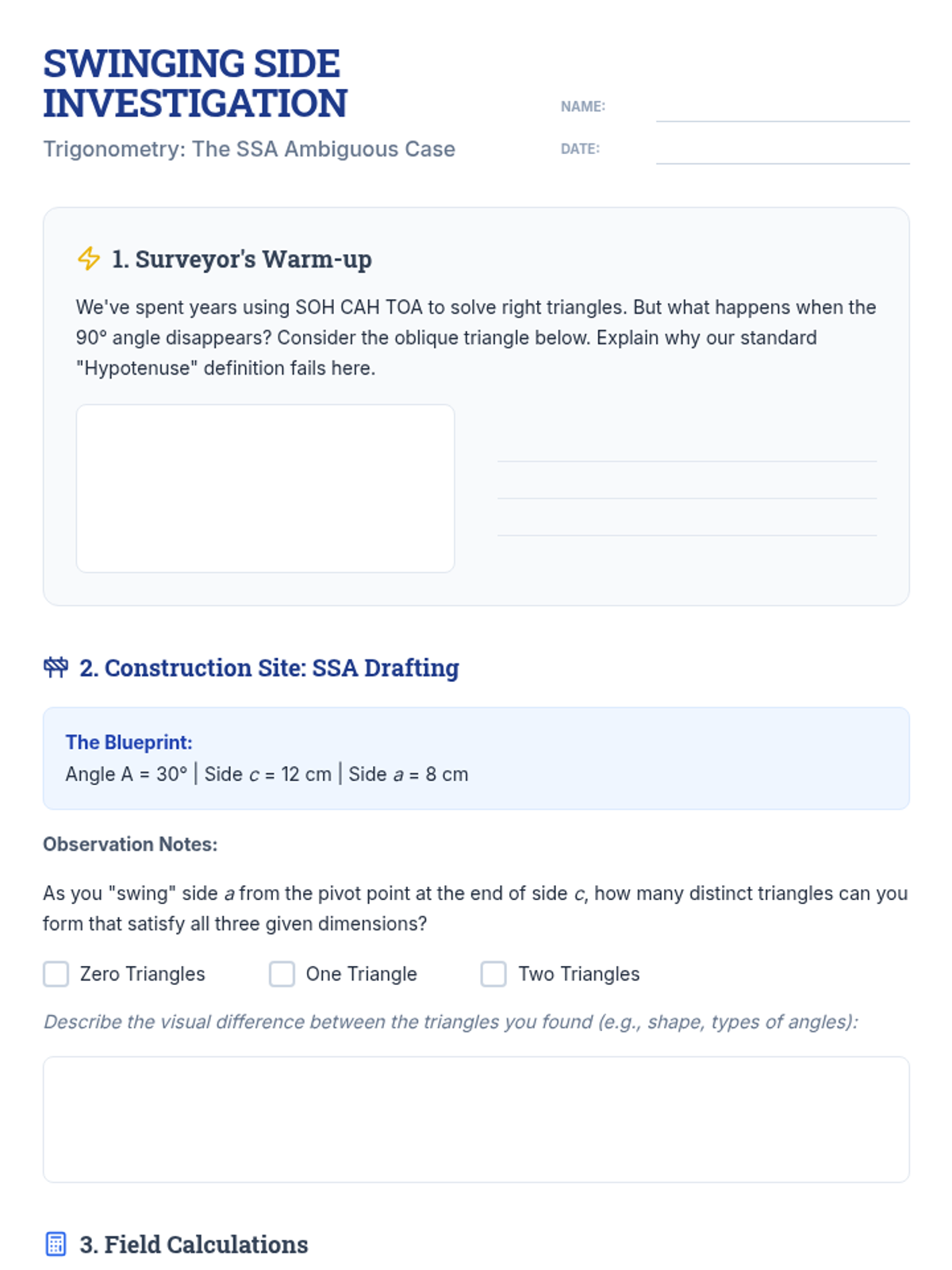 A student investigation worksheet for the physical SSA construction activity, including sections for warm-up, observations, Law of Sines calculations, and a final reflection.