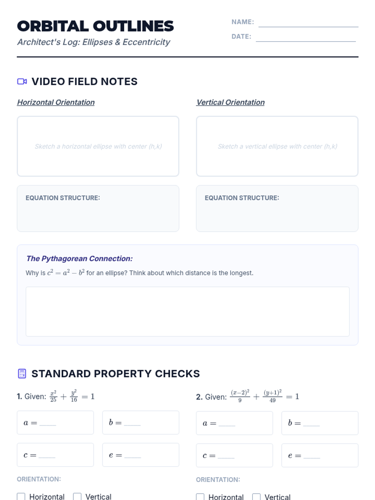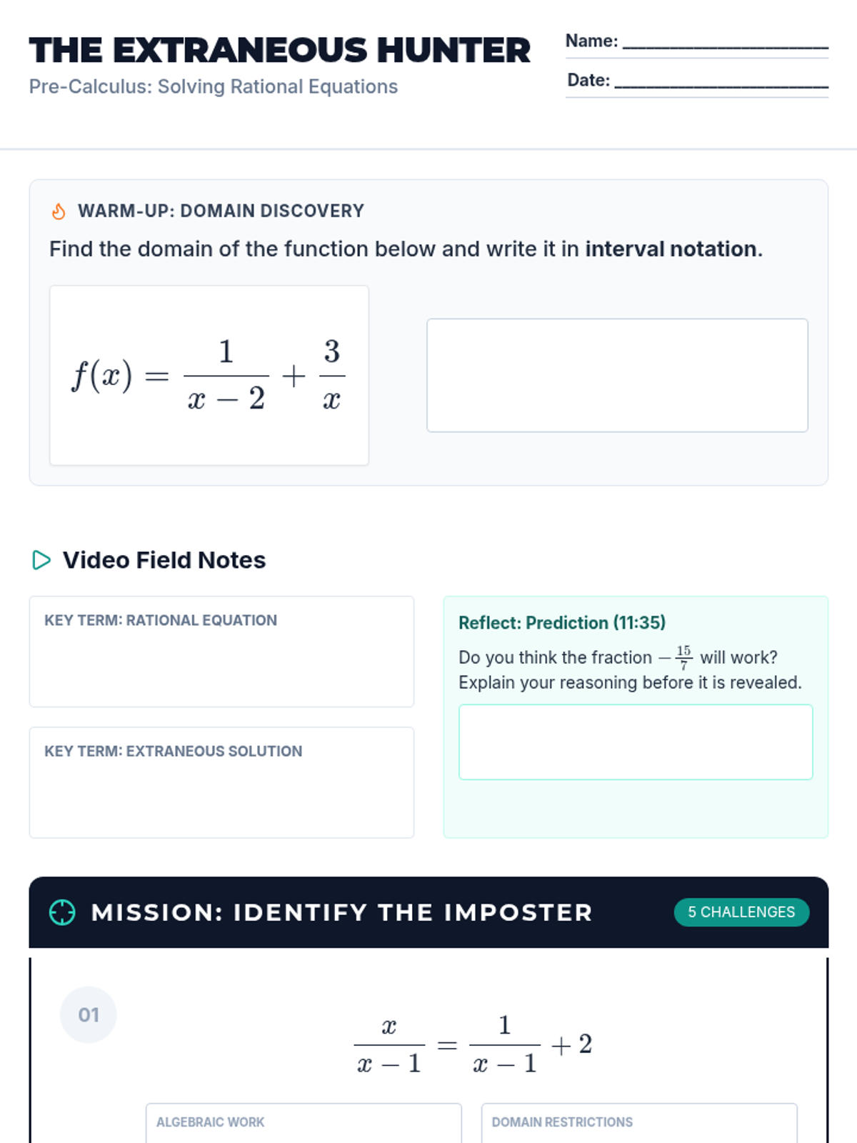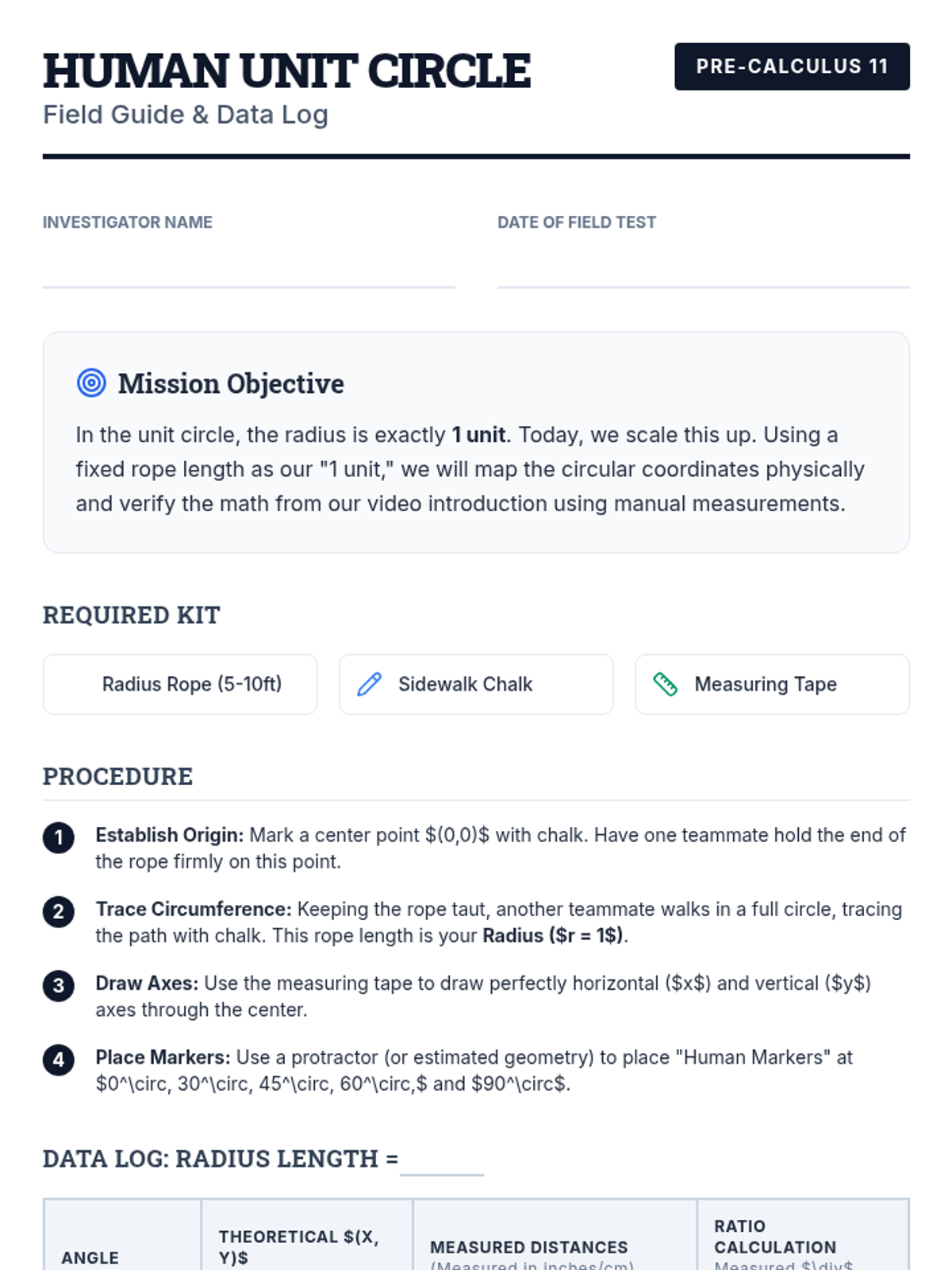 A field guide for students to use during the outdoor activity, including space for recording measurements, theoretical values, and reflection questions.