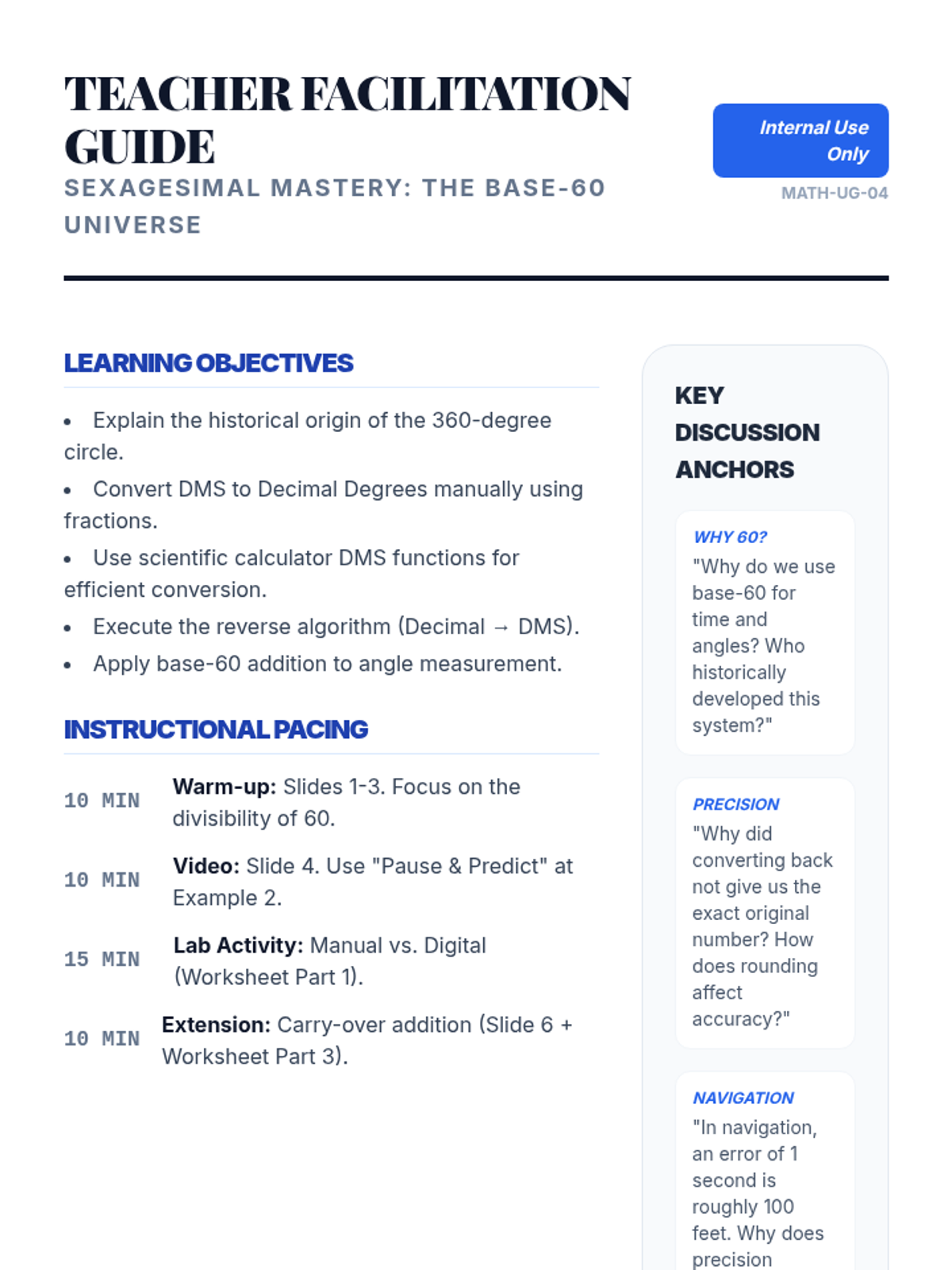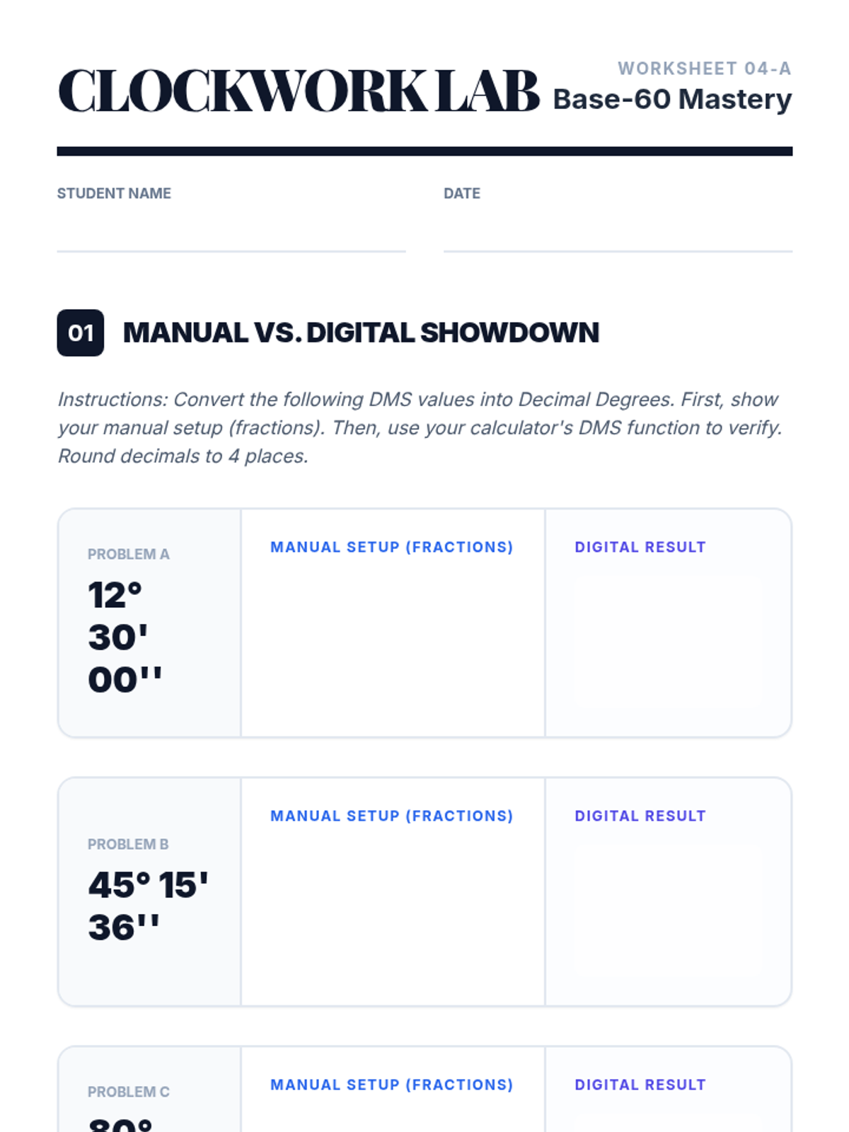 A comprehensive practice worksheet for base-60 conversions, featuring a "Manual vs. Digital" comparison activity, reverse algorithm practice, and angle addition extensions. Revised with expanded student work areas and clearer visual hierarchy.