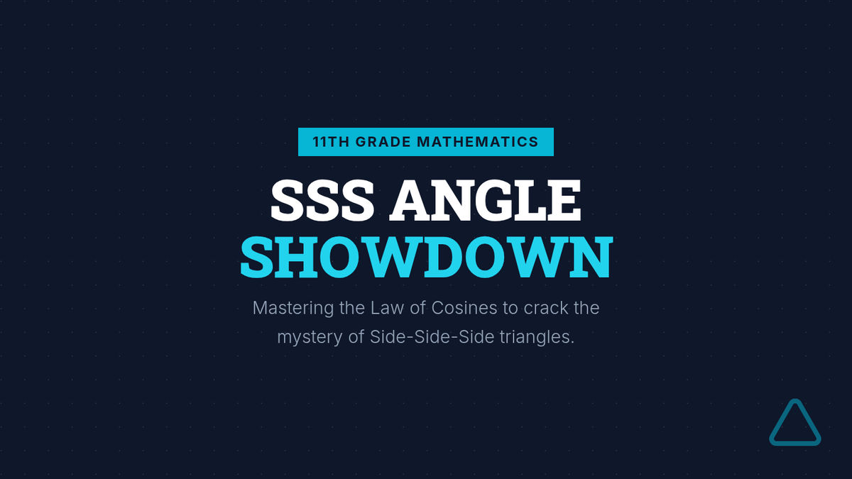 A presentation slide deck for teaching the Law of Cosines for SSS triangles, featuring an embedded video, algebraic rearrangement guides, and a final logic check slide.