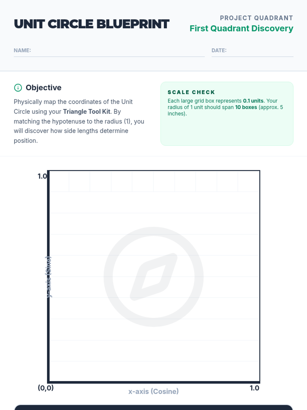 An activity worksheet for students to build the first quadrant of the unit circle. Features a large graph grid scaled for the Triangle Tool Kit, a coordinate mapping table, and a reflection prompt to connect triangle geometry to trigonometric functions.