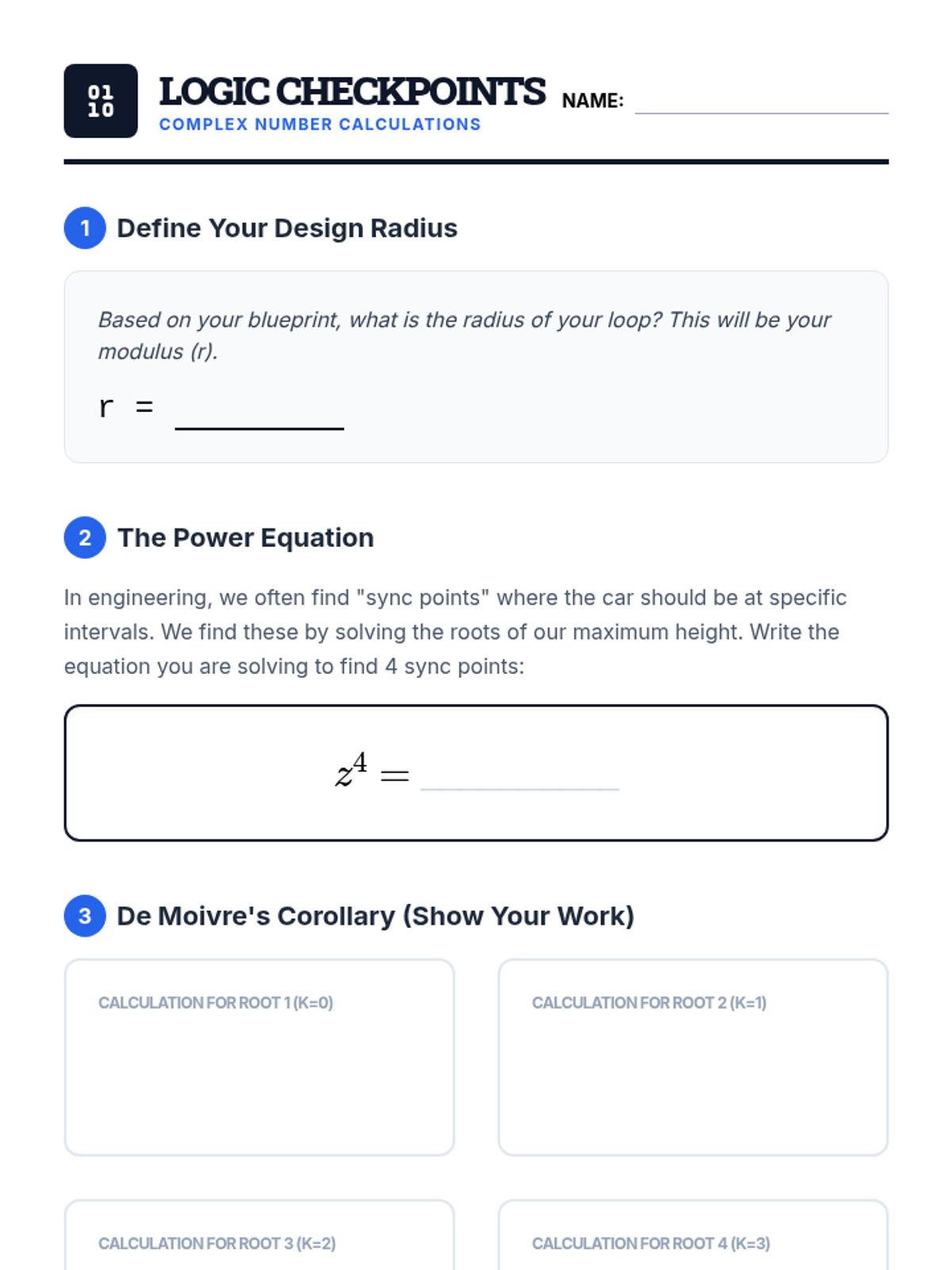 A student worksheet for calculating the complex roots of their roller coaster loop design. Provides structured steps for applying De Moivre's Corollary to find four symmetrical sync points.