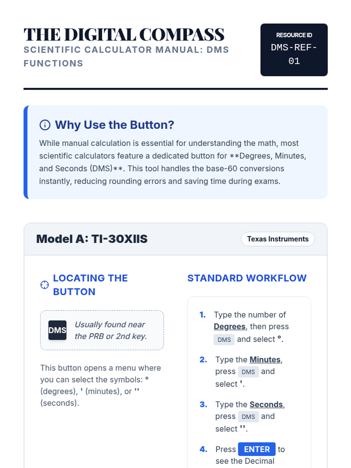 A reference guide for students on how to use the DMS (Degrees, Minutes, Seconds) functions on popular scientific calculator models like TI-30XIIS and Casio fx-300ES Plus.