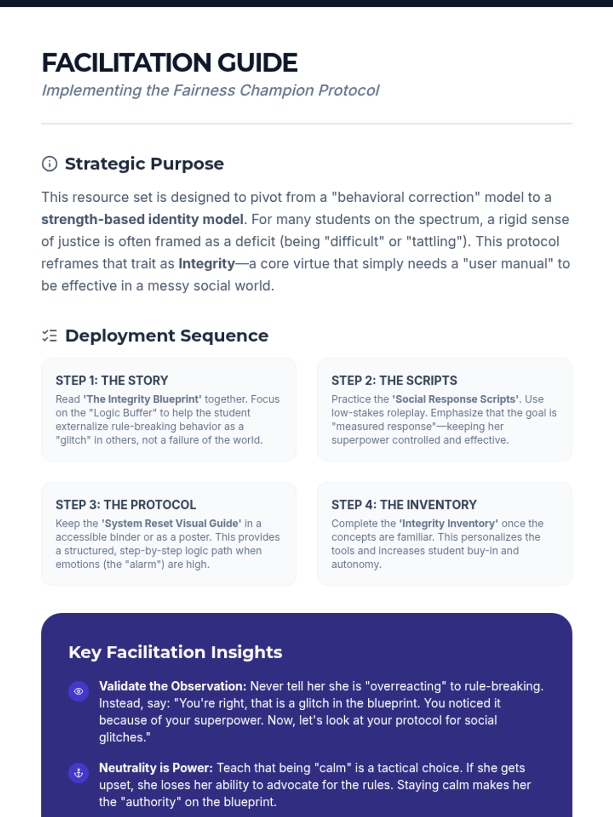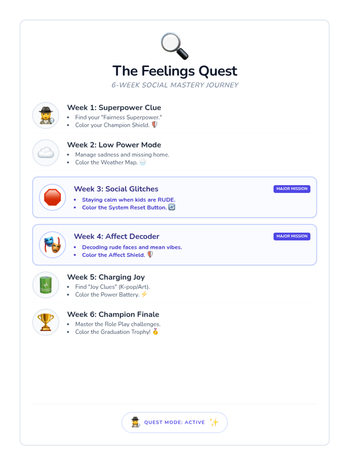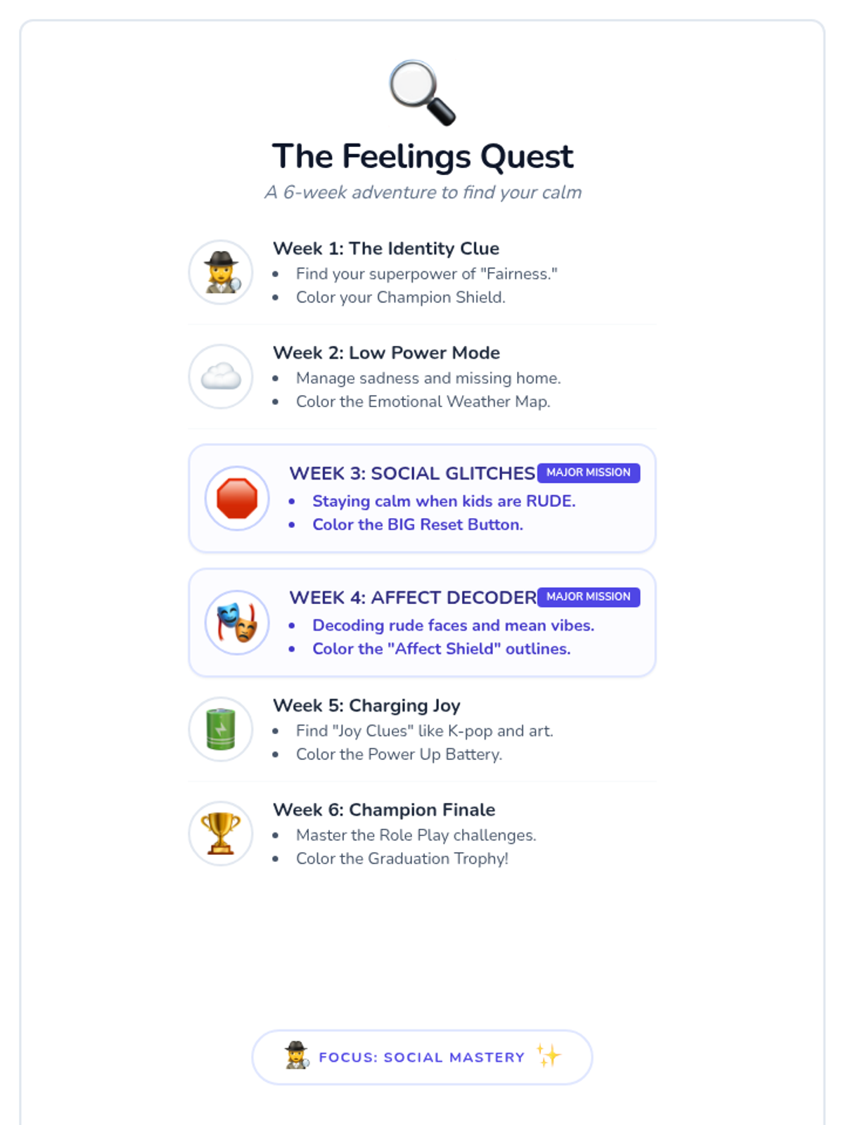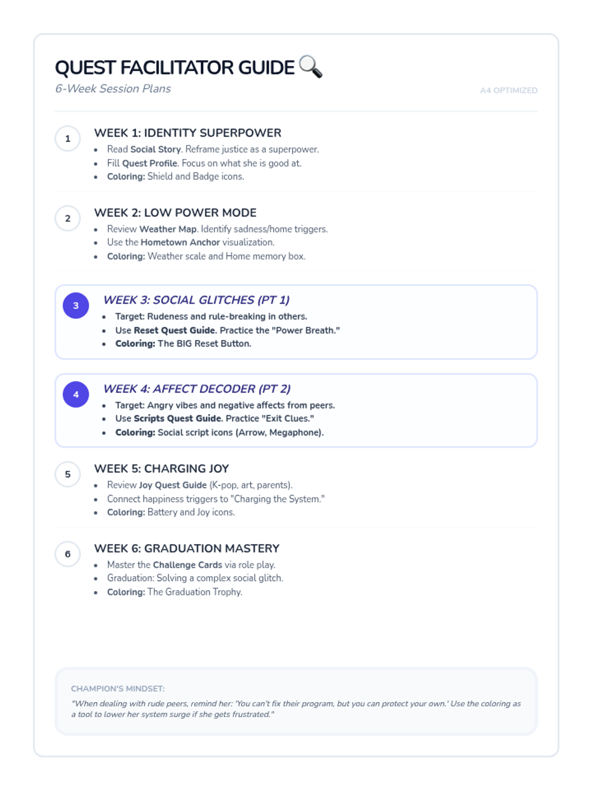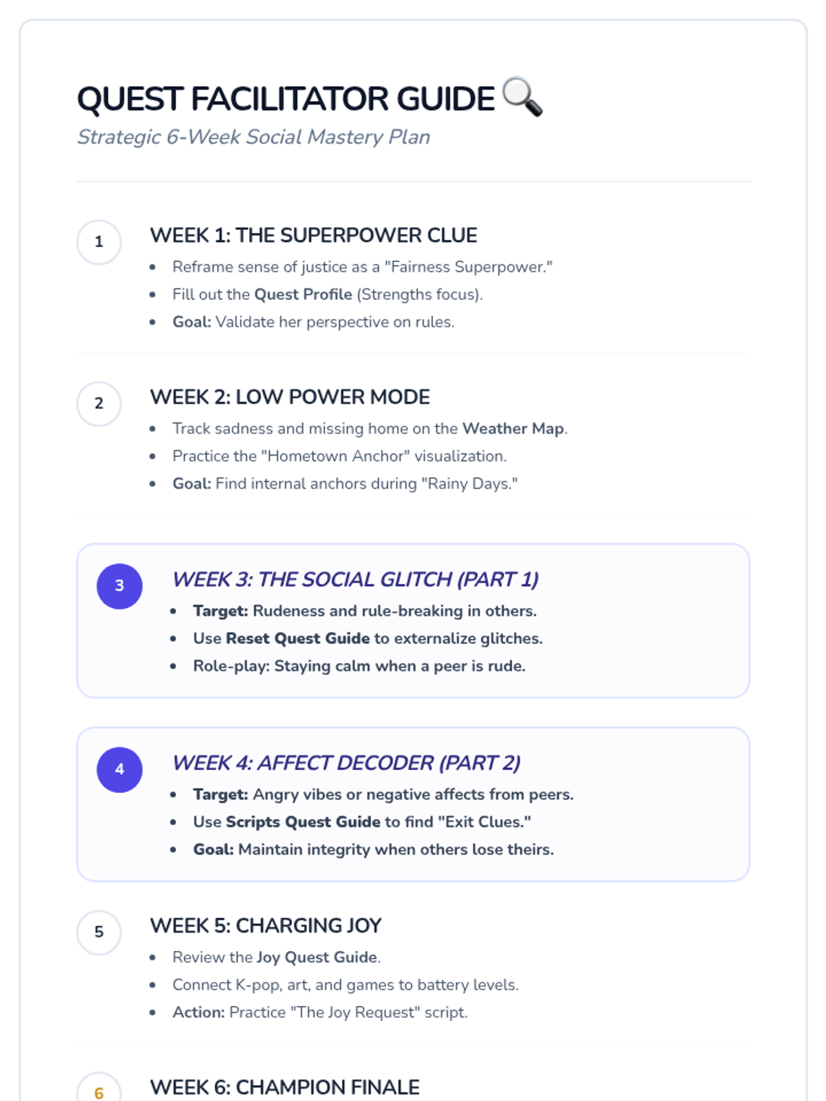 A 6-week social-emotional learning curriculum for a 13-year-old girl on the autism spectrum, focusing on managing specific triggers through a strength-based "Integrity Blueprint" lens.