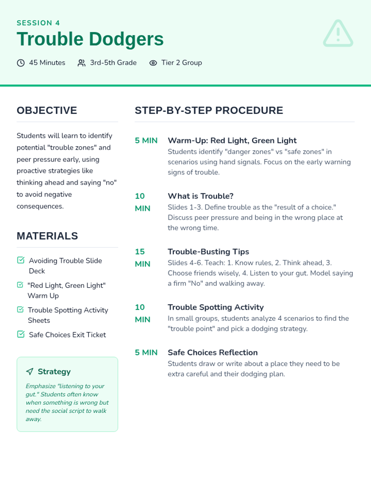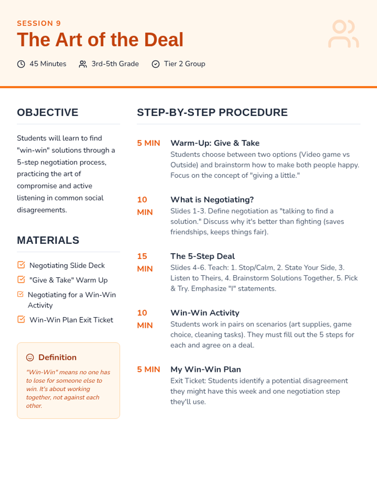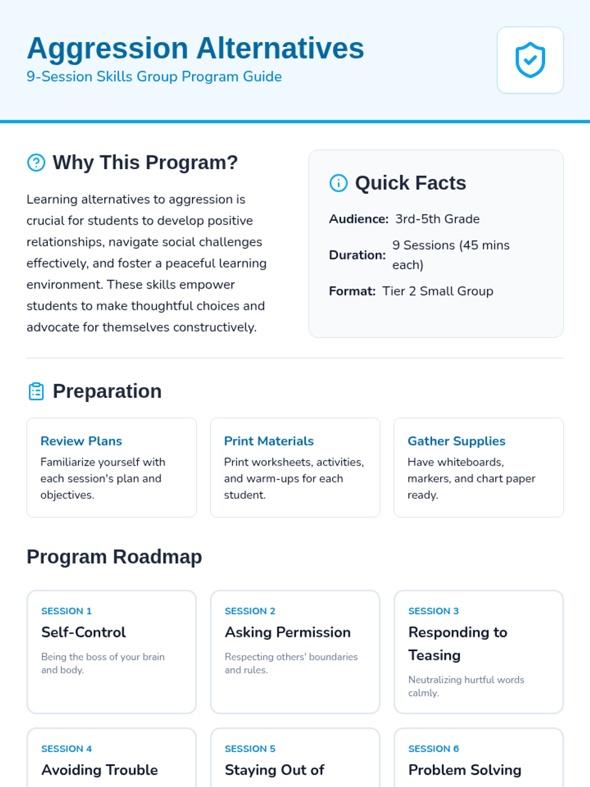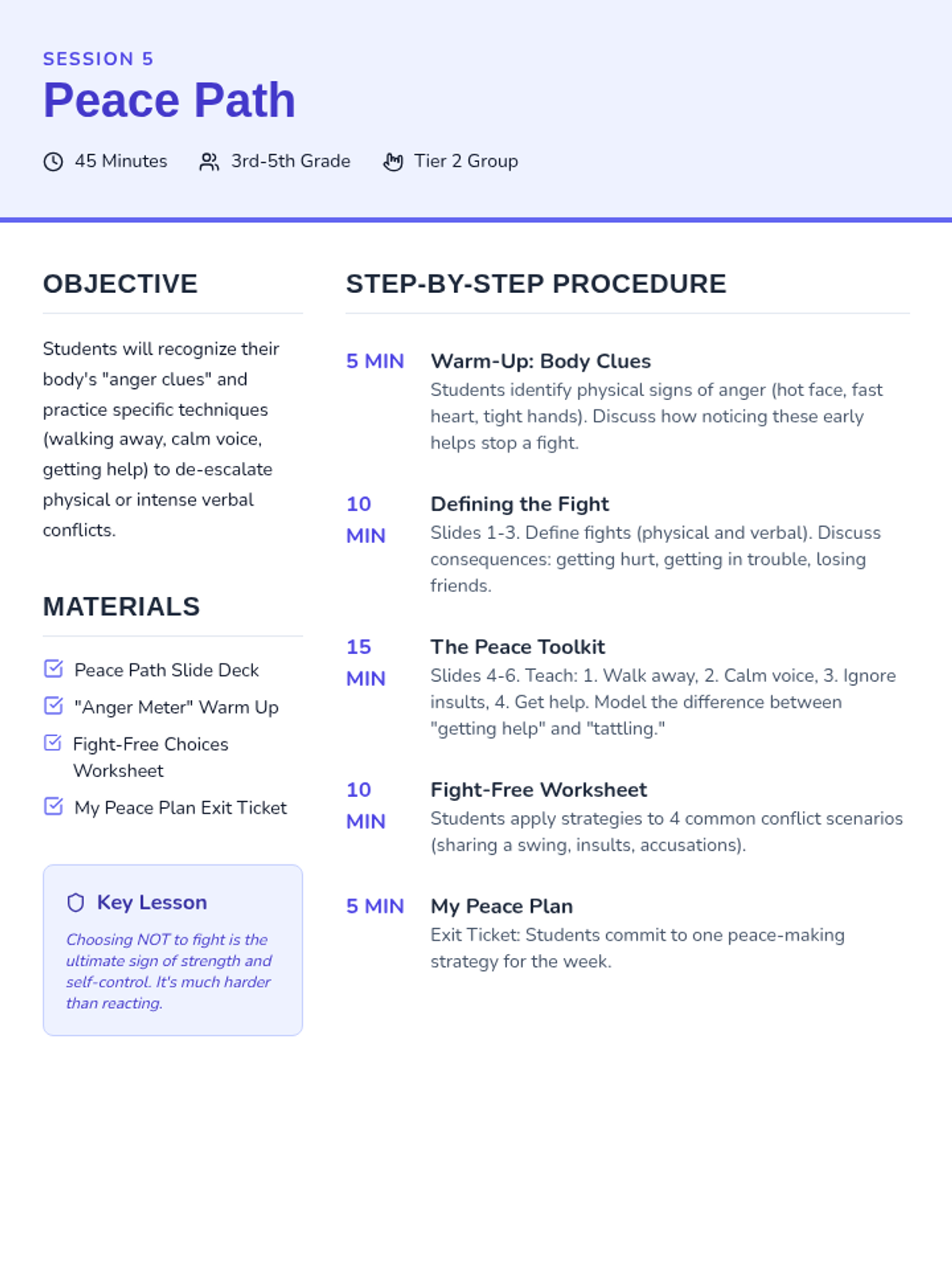 An 8-week (10-session) Tier 2 social skills program for 3rd-5th graders focusing on aggression alternatives, self-control, and peaceful conflict resolution.