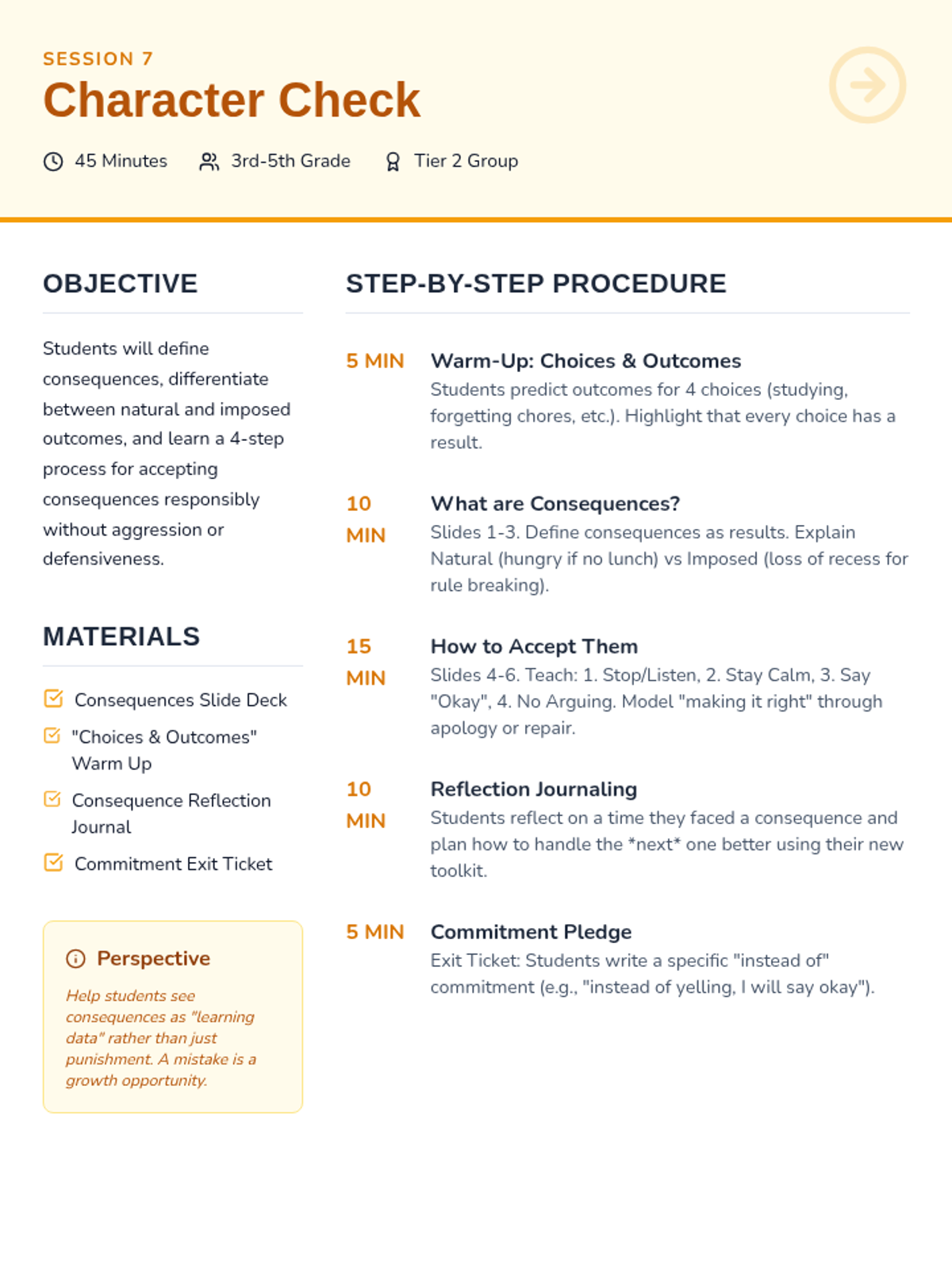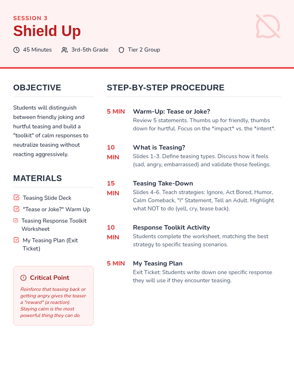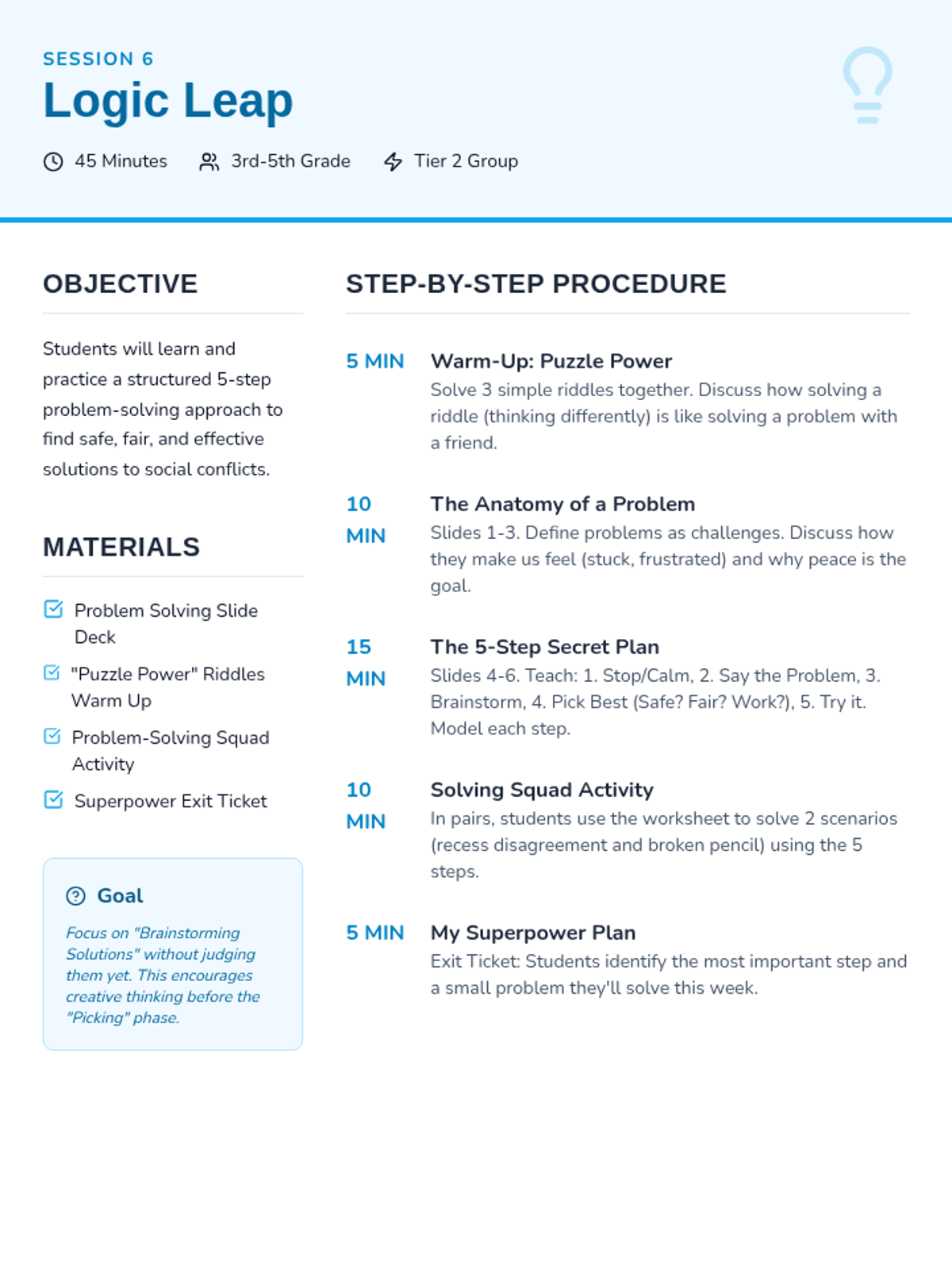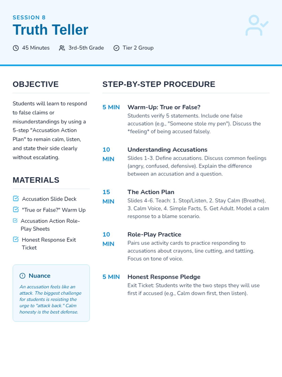 An 8-week (10-session) Tier 2 social skills program for 3rd-5th graders focusing on aggression alternatives, self-control, and peaceful conflict resolution.