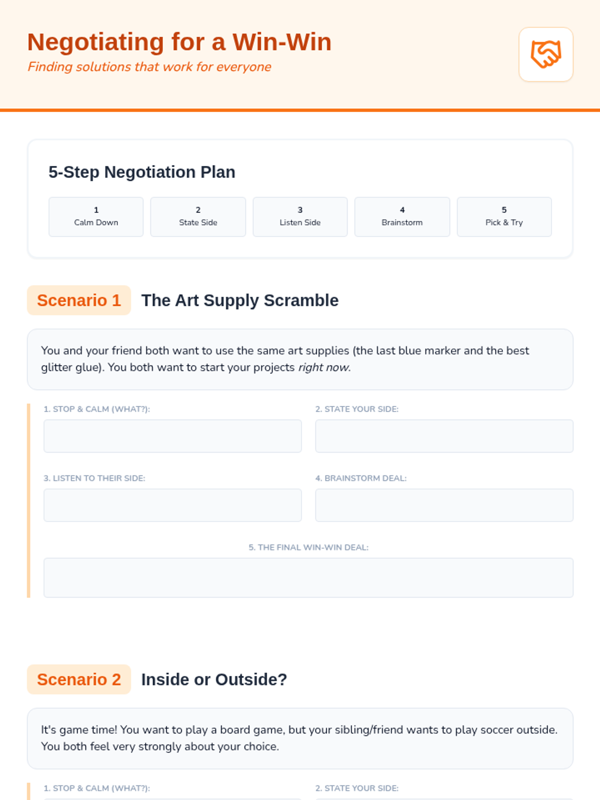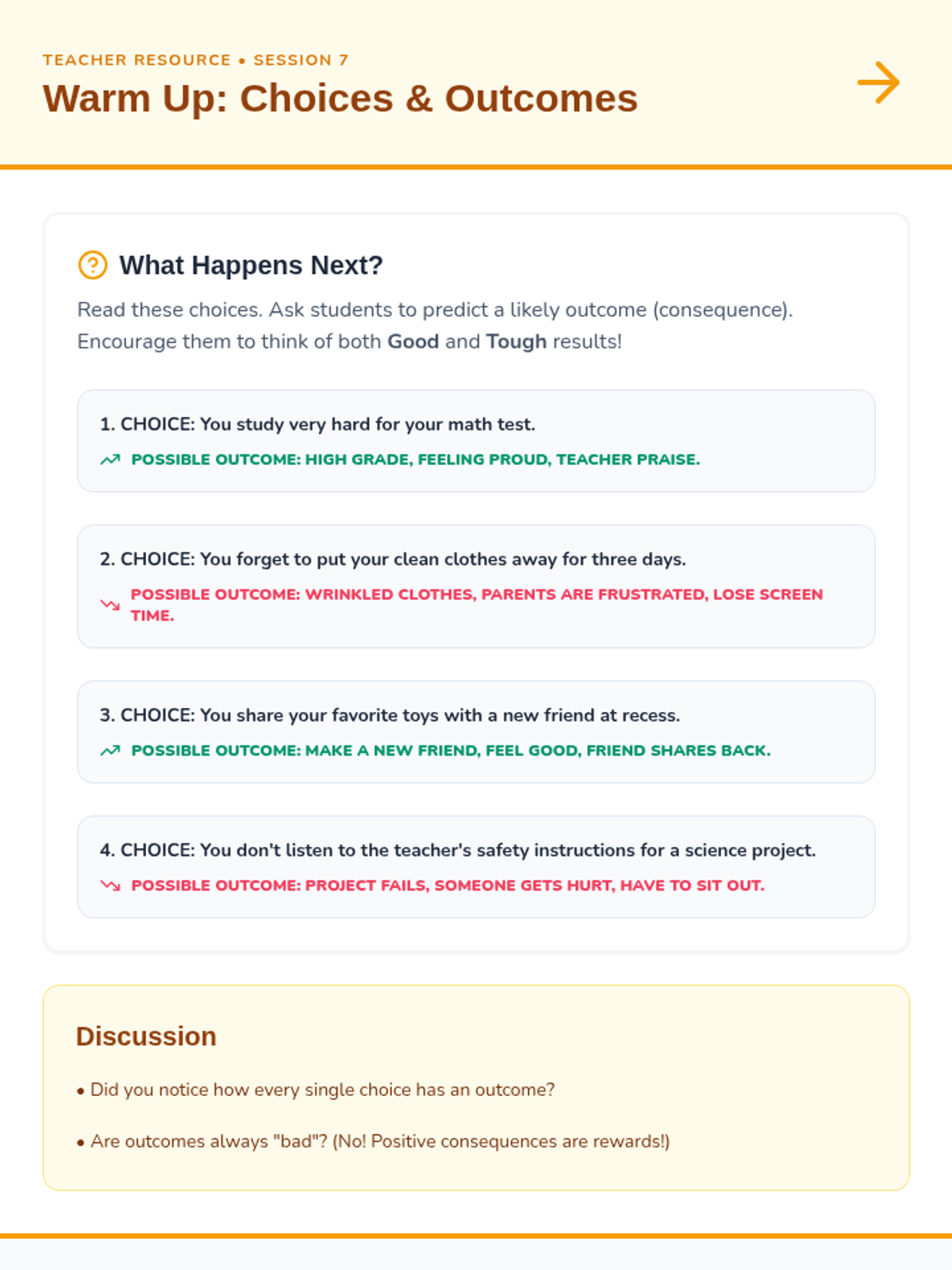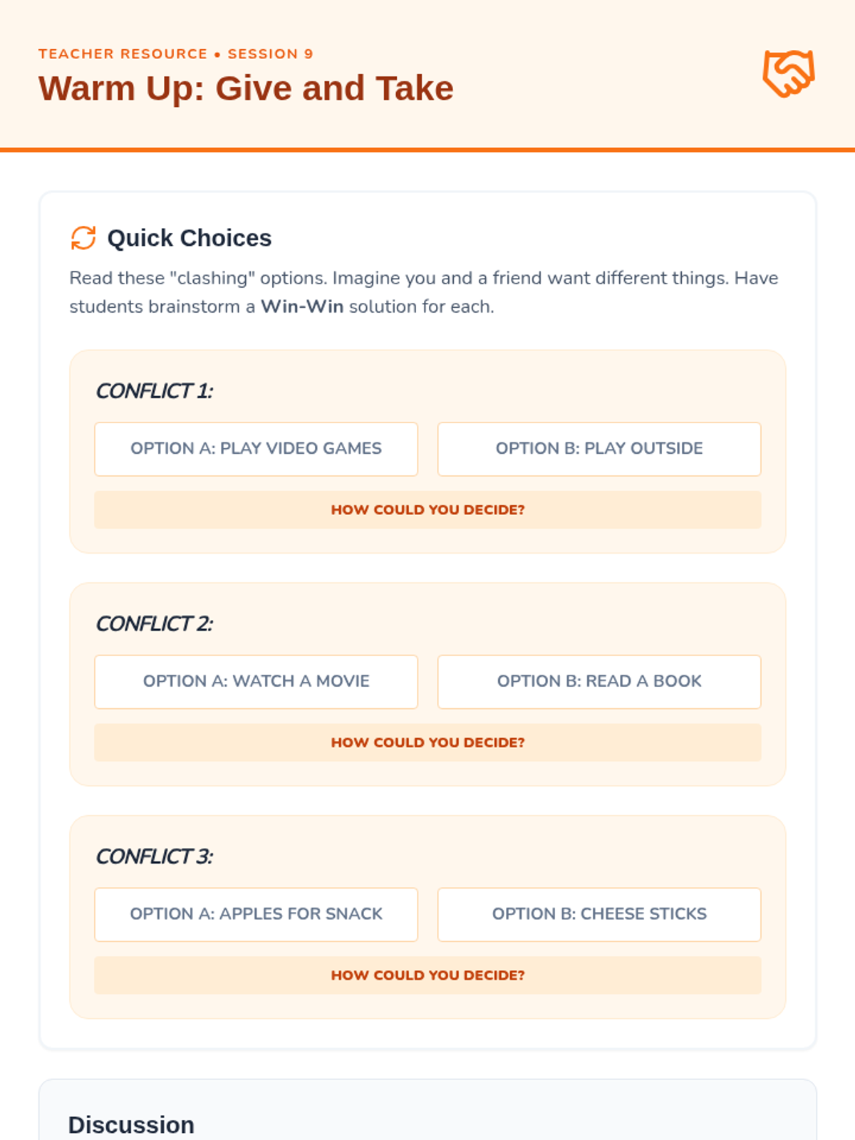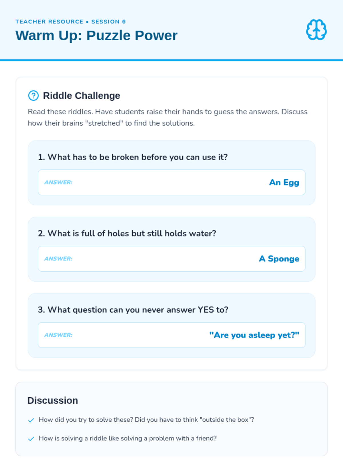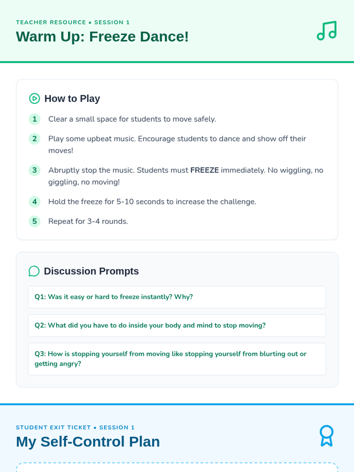 A series of interactive workshops designed for 5th-grade students to build emotional regulation, social cooperation, and critical thinking skills. Each workshop is structured for a 40-minute session led by a school psychologist or educator.