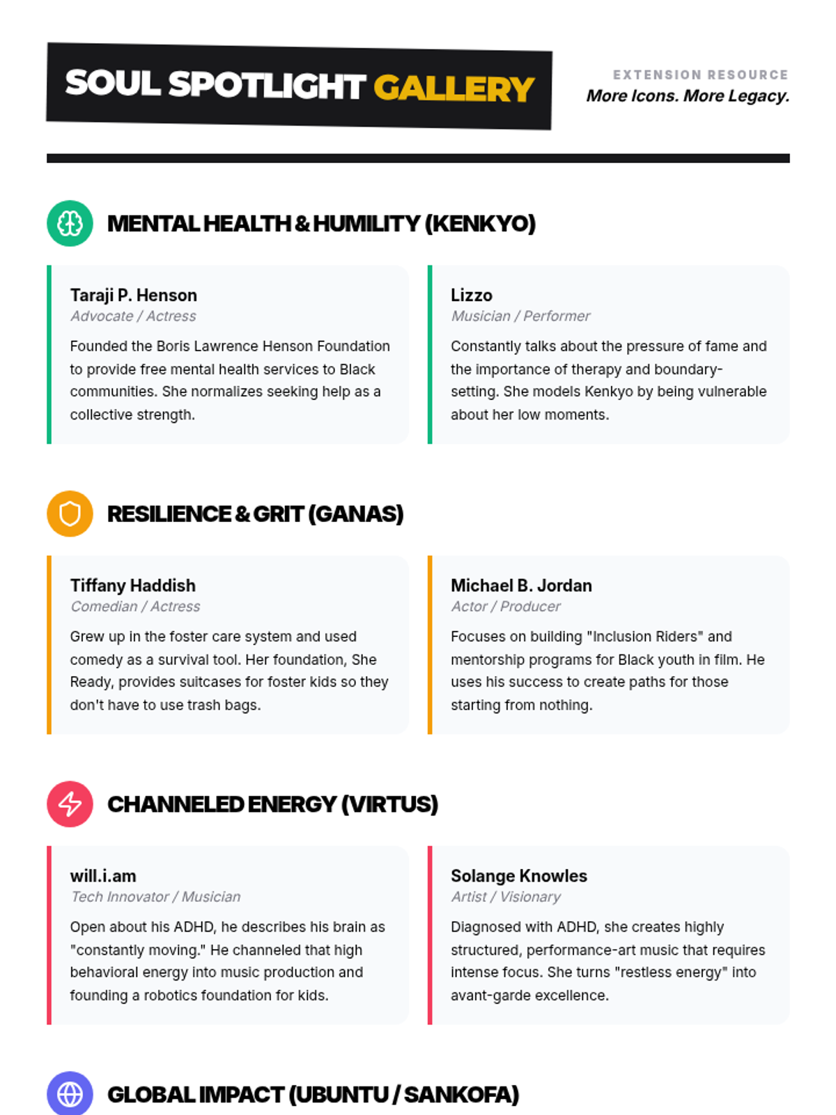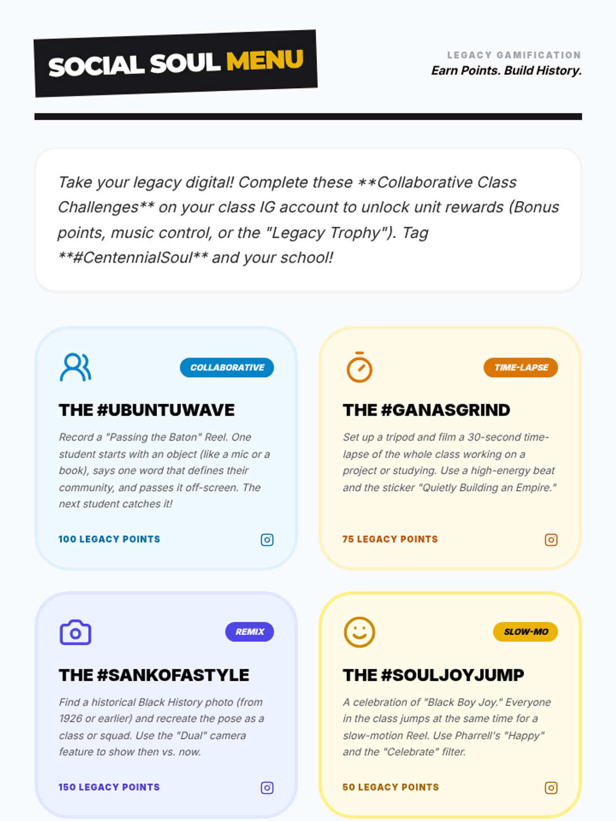 A 6-lesson sequence divided by grade level (5th, 6th, and 7th), celebrating 100 years of Black history through school values. Each grade explores two distinct lessons focusing on community joy, personal excellence, and mental health advocacy.