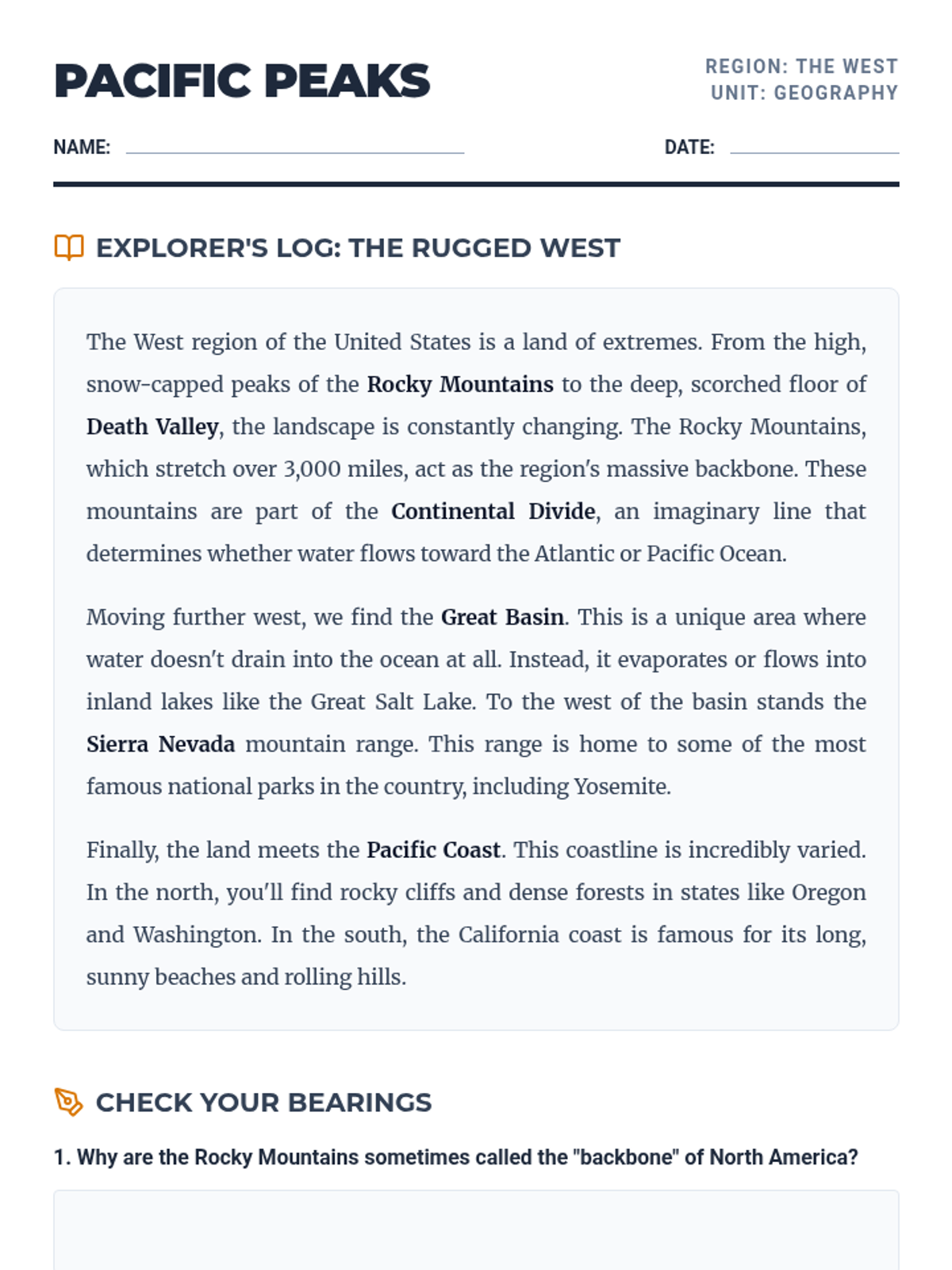 A comprehensive 5-lesson exploration of the West region of the United States, covering geography, climate, resources, culture, and states/capitals through reading passages and interactive activities.