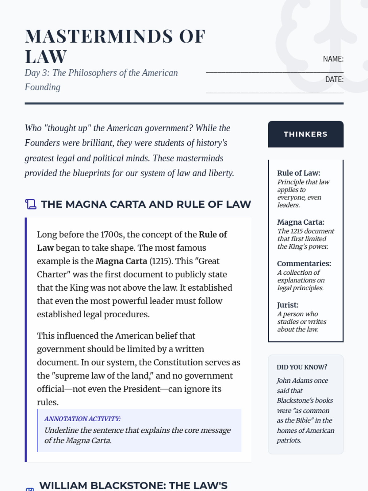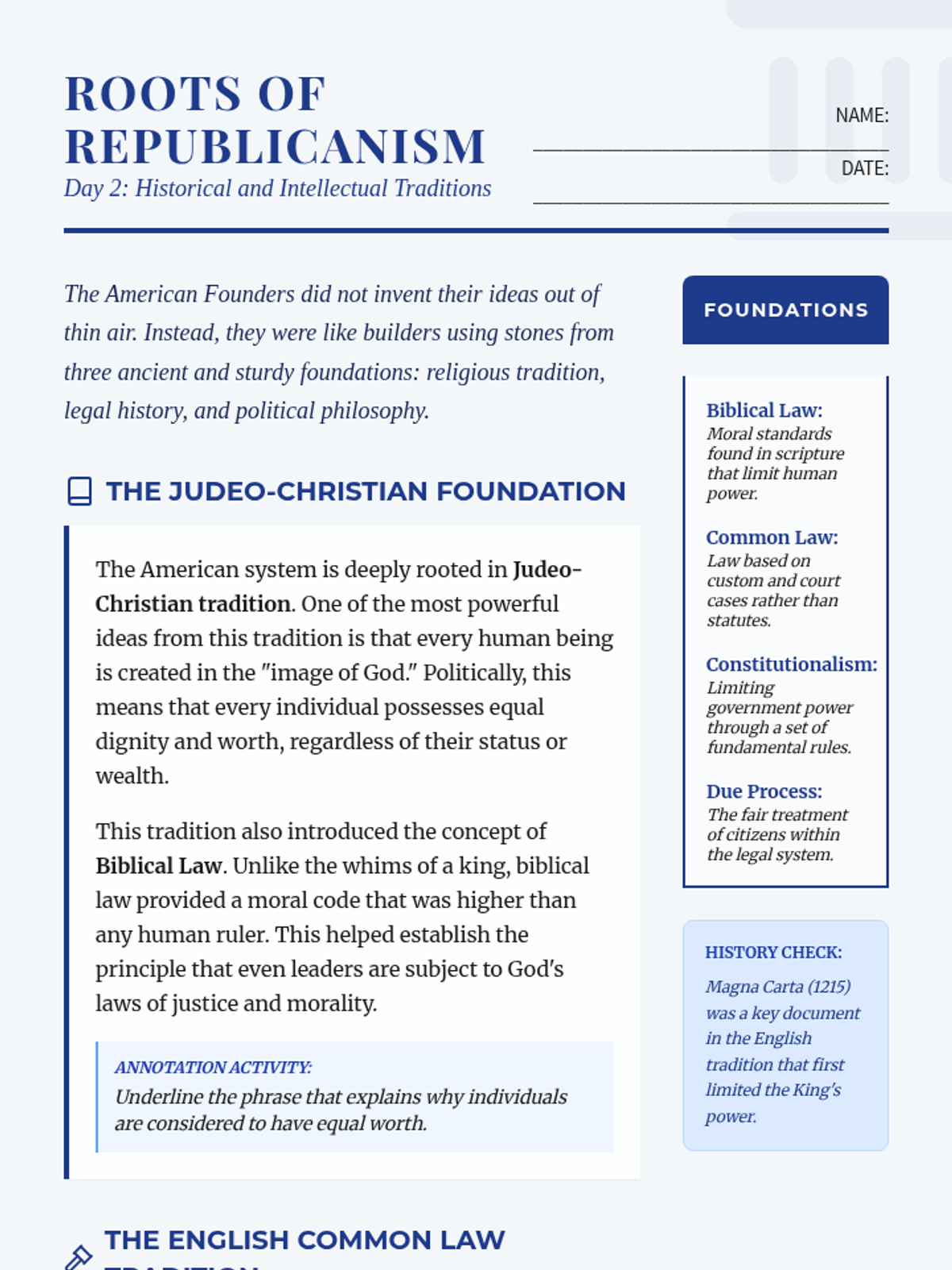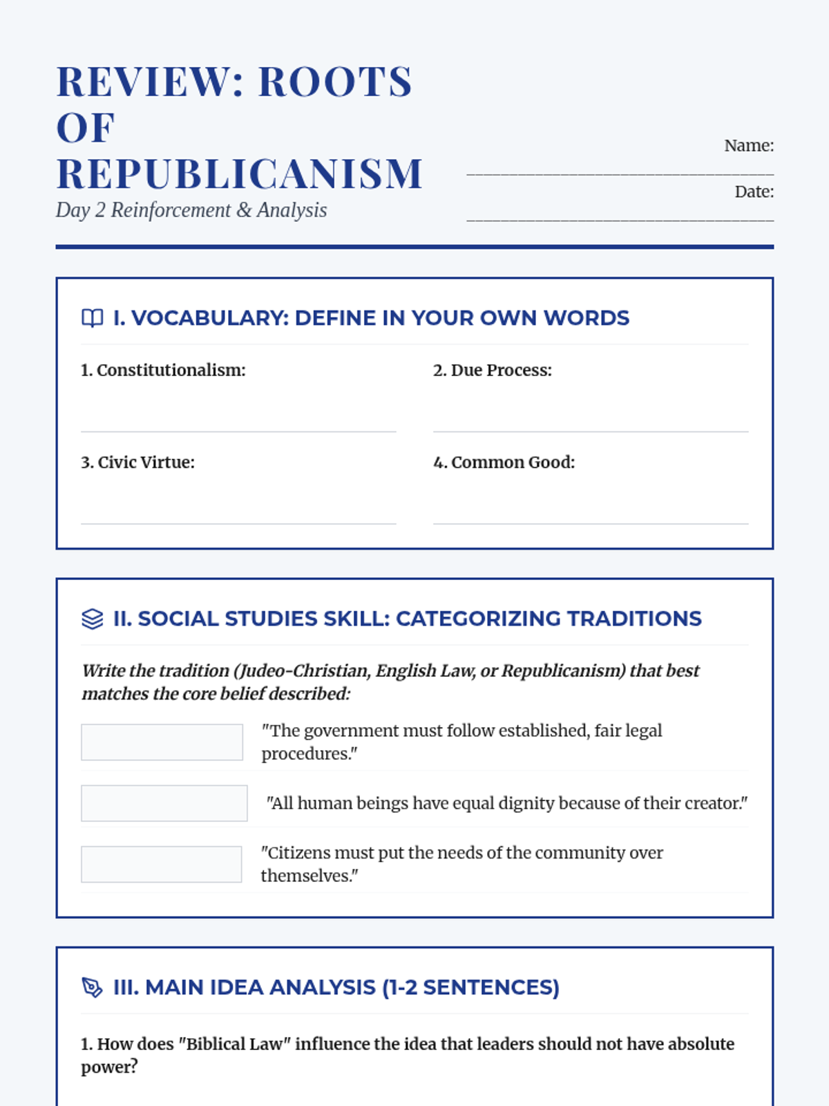 A 7-day comprehensive remediation sequence focused on the philosophical, historical, and individual foundations of American government. Designed for students needing mastery of TEKS 1 and 12B, the unit features structured readers, skill-building worksheets, and a cumulative assessment.