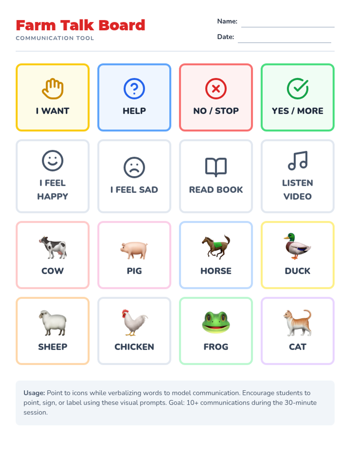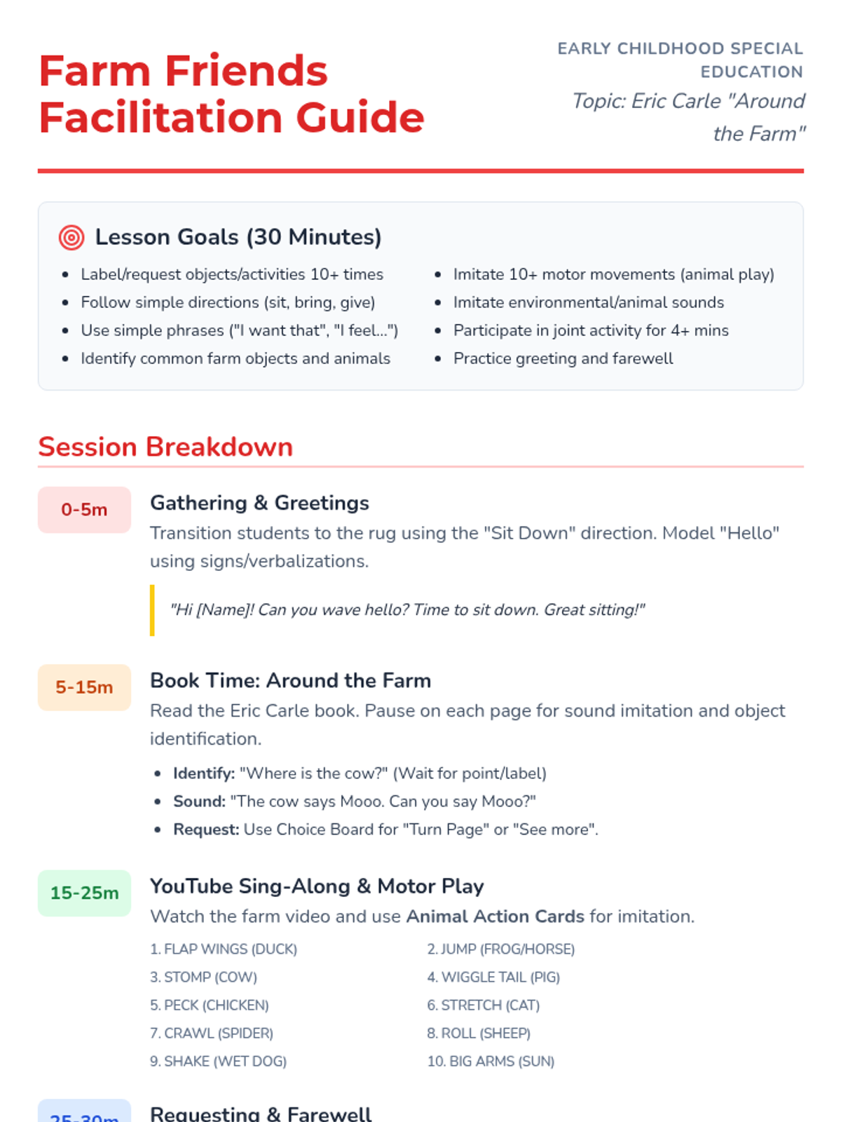 A comprehensive 30-minute interactive lesson plan focused on communication, motor skills, and social engagement for early childhood autistic students using Eric Carle's 'Around the Farm'.
