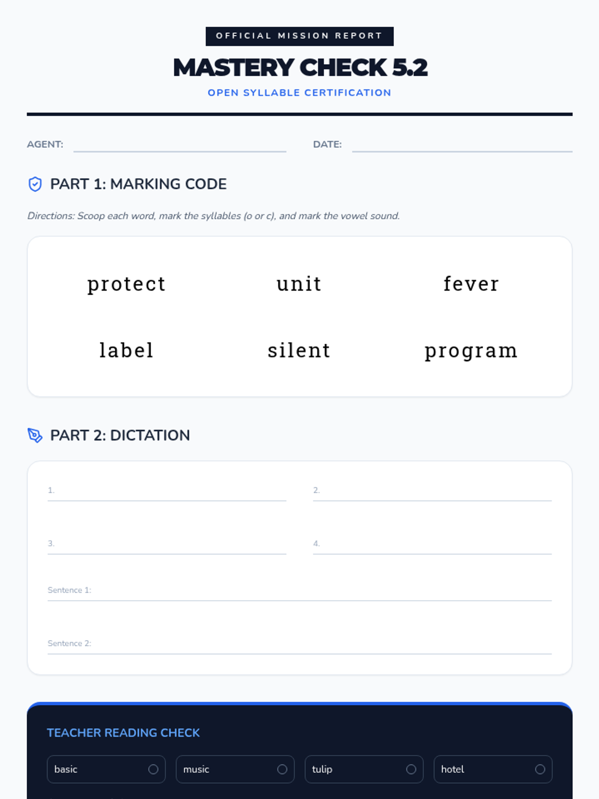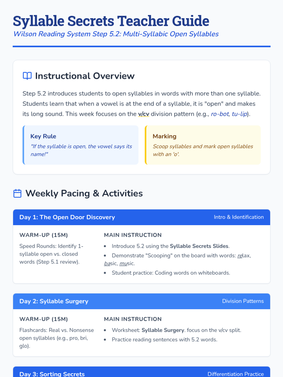 A comprehensive unit focused on Wilson Reading System Step 5.2, covering open syllables in multi-syllabic words. Includes instructional slides, hands-on activities, and a full week's teaching guide.
