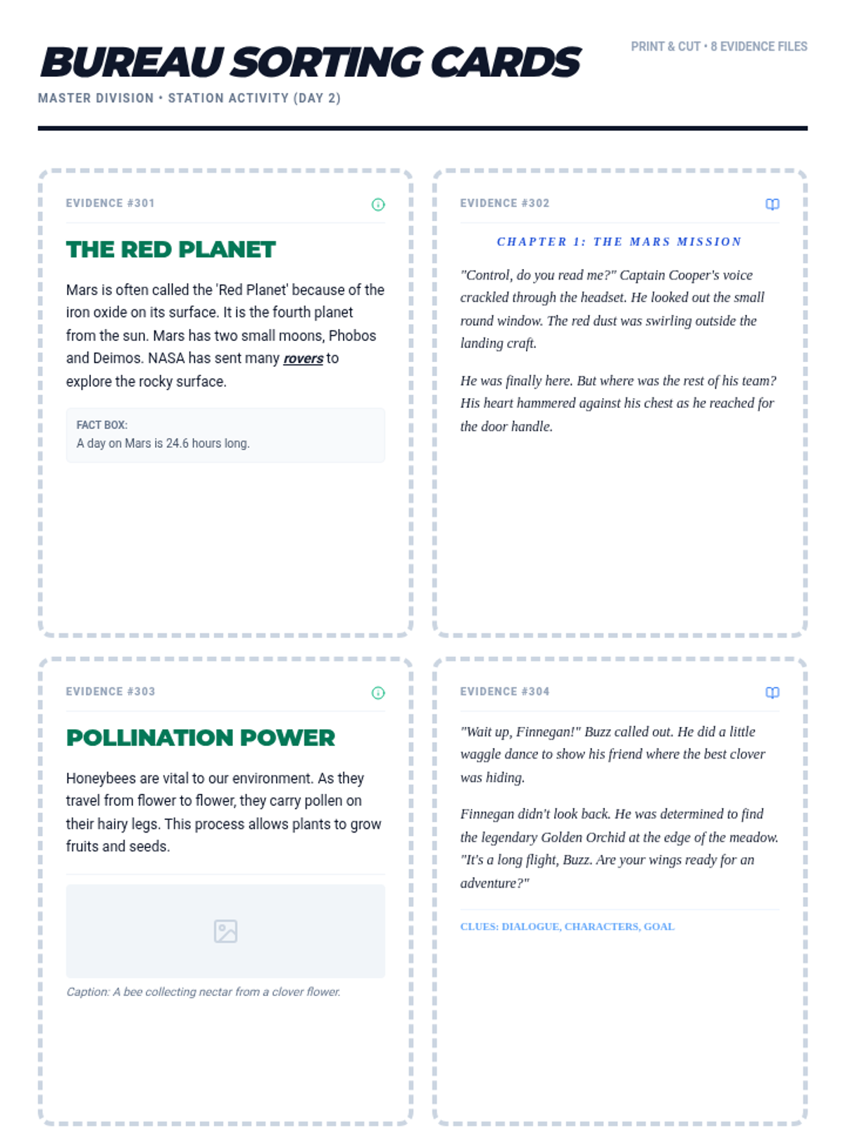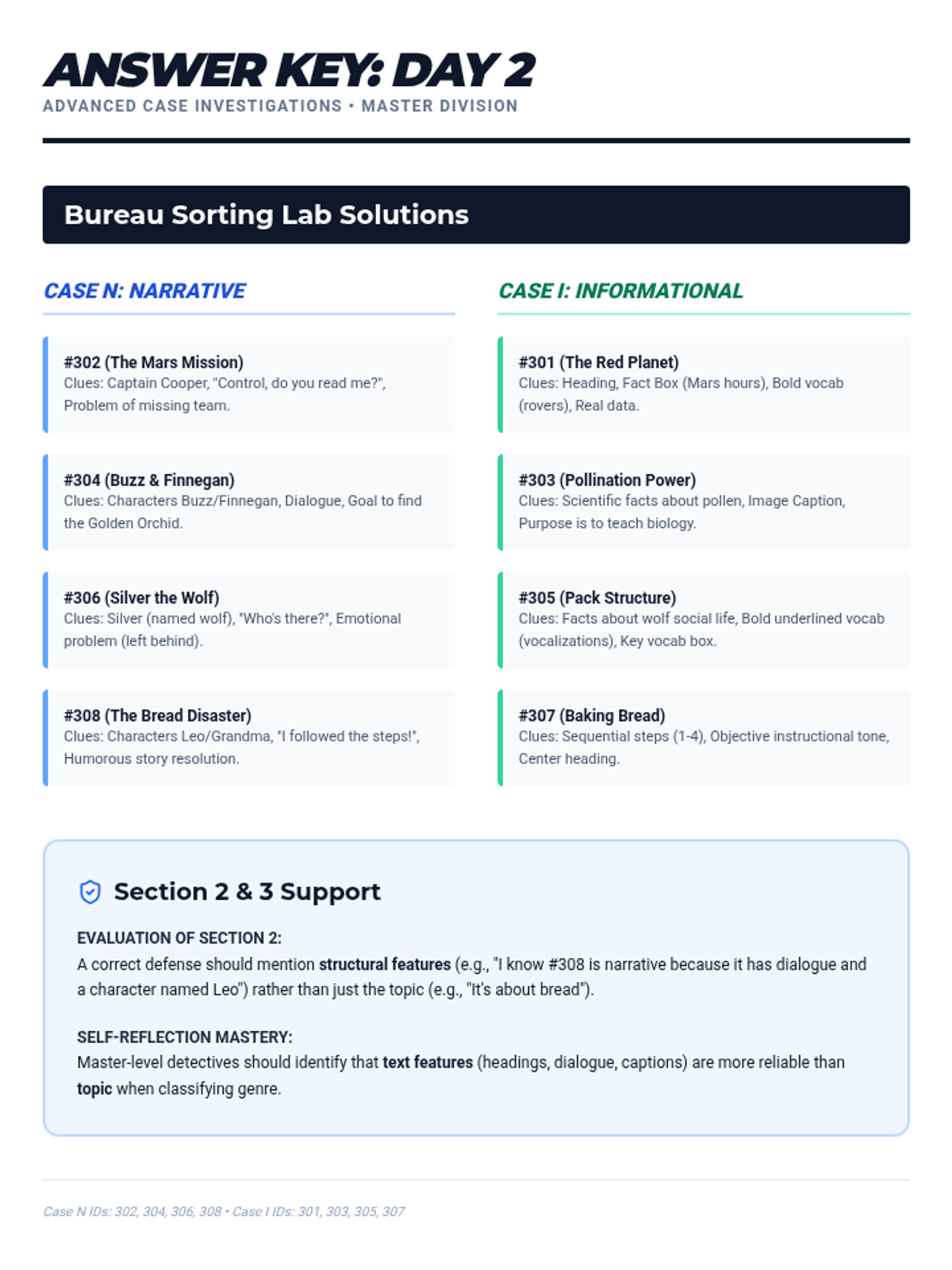 A two-day investigation where students master the ability to distinguish between narrative and informational texts using specific text features and clues.