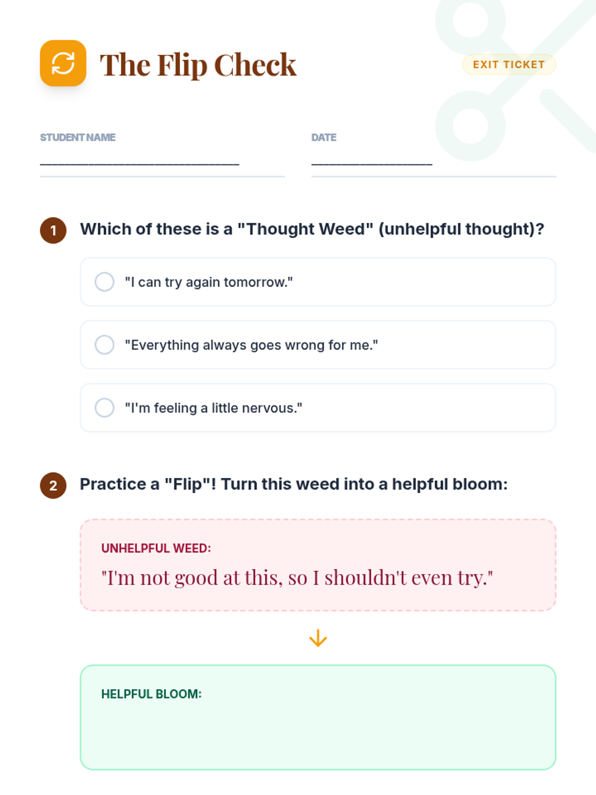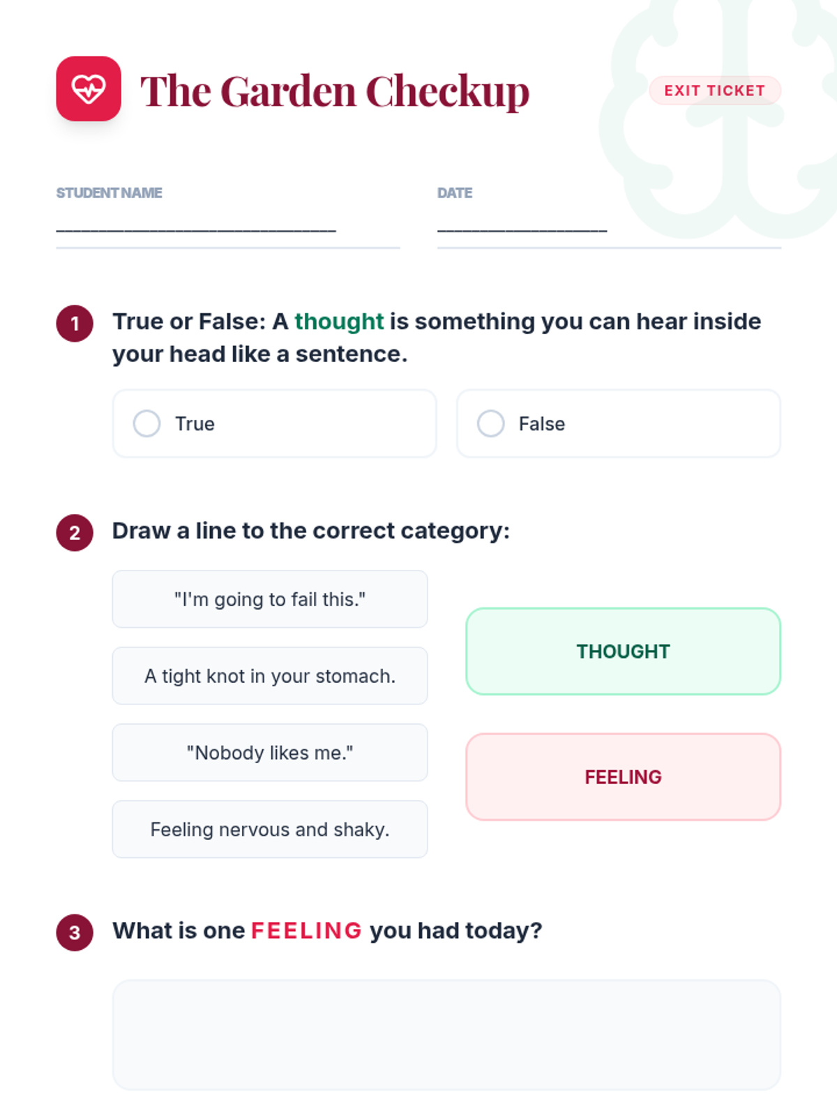 A 3-part CBT-based small group curriculum for 4th-grade girls focused on identifying thoughts and feelings, challenging unhelpful 'thought weeds', and practicing mindfulness for emotional regulation. The program uses a 'Mind Garden' theme to make complex psychological concepts accessible and engaging.