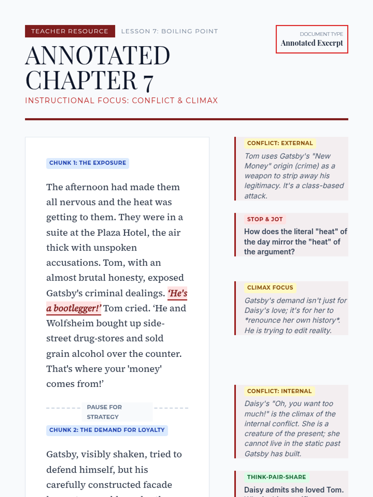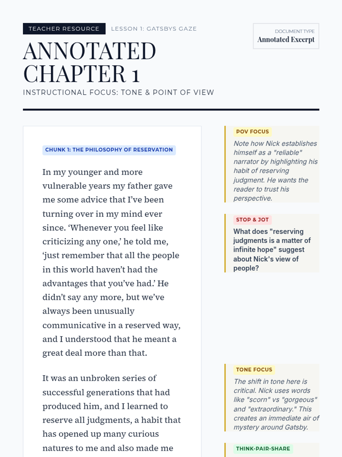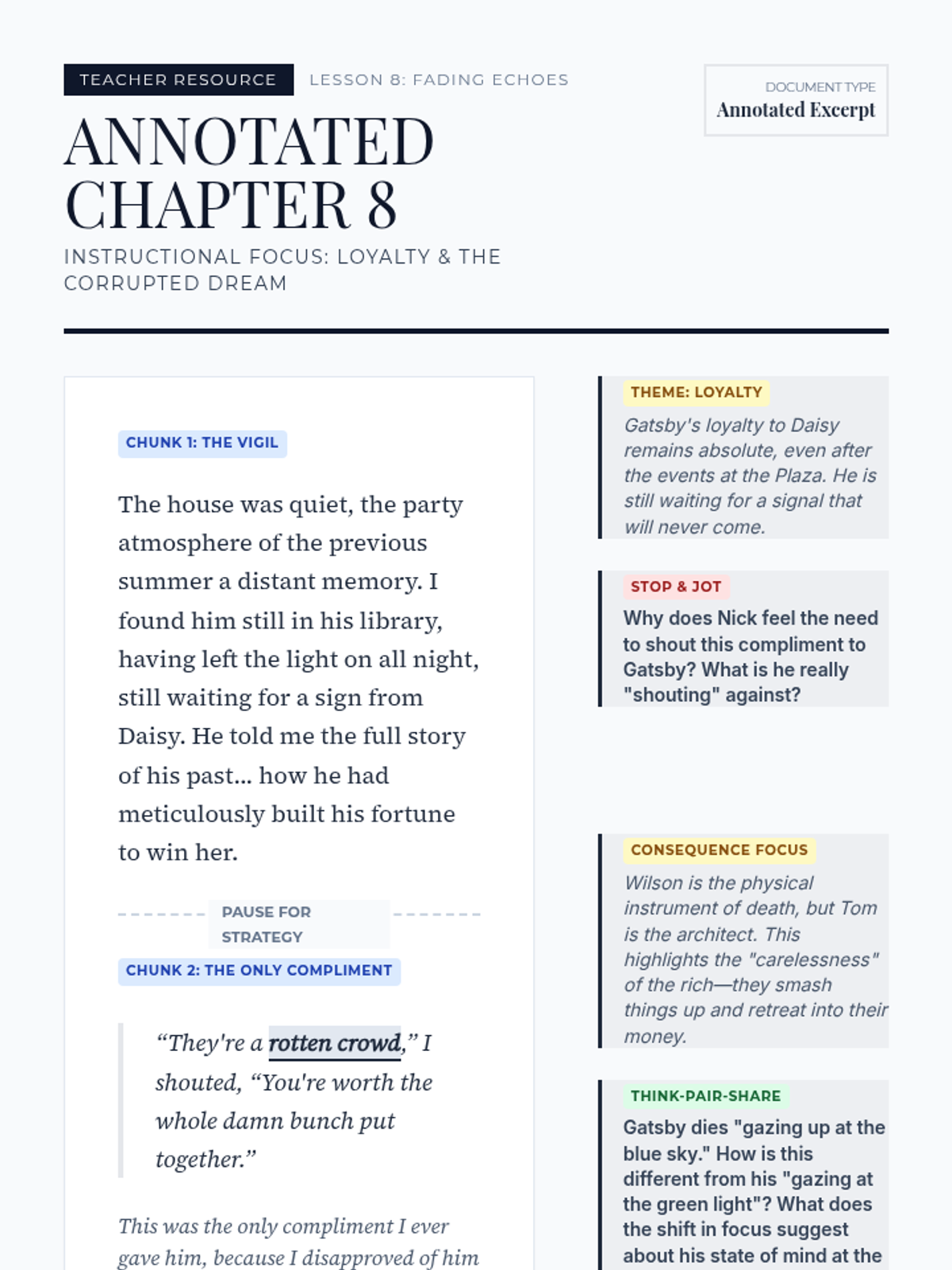 An 8-lesson unit for 11th-grade students exploring F. Scott Fitzgerald's 'The Great Gatsby' through close reading, literary analysis, and historical context. Students investigate themes of wealth, the American Dream, and social class while mastering concepts like tone, point of view, and symbolism.