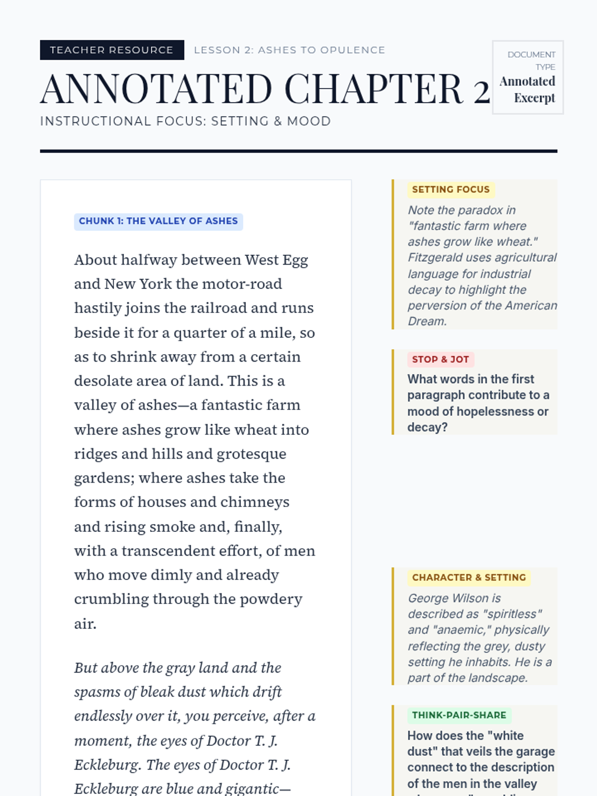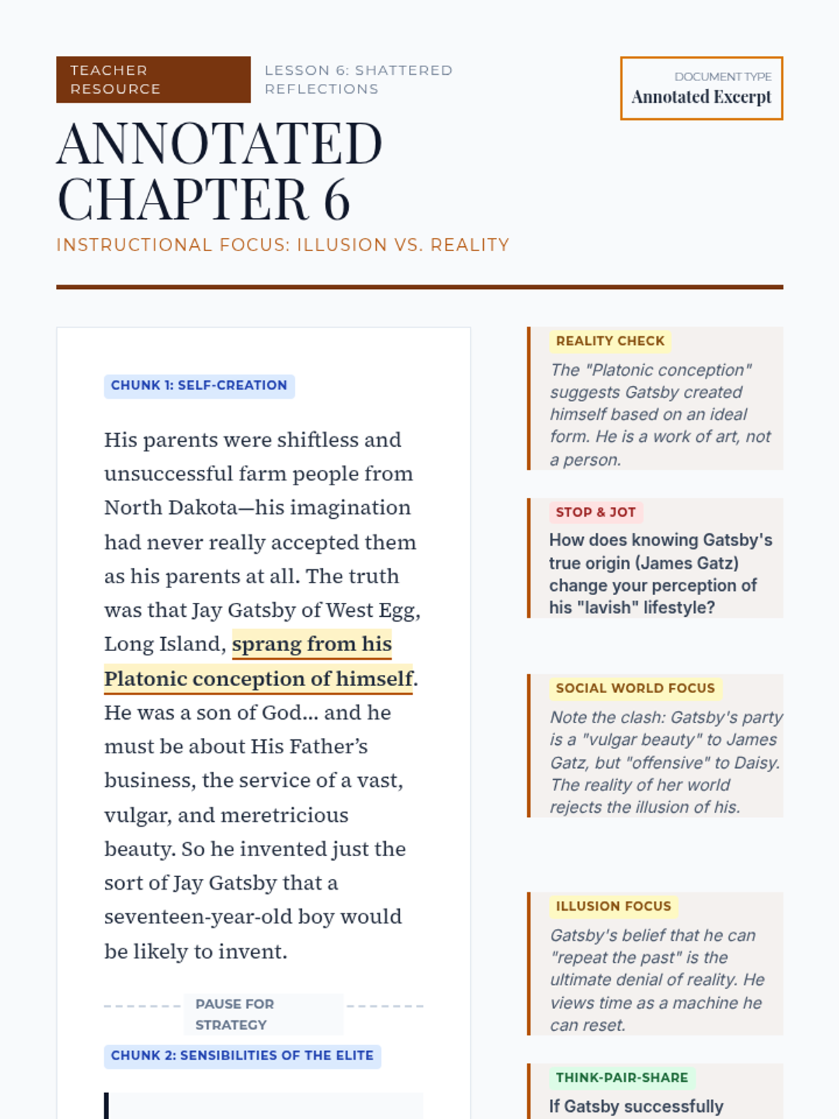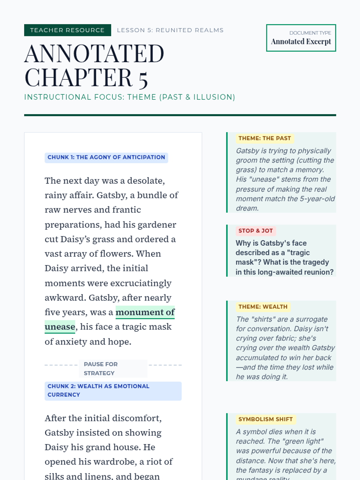 An 8-lesson unit for 11th-grade students exploring F. Scott Fitzgerald's 'The Great Gatsby' through close reading, literary analysis, and historical context. Students investigate themes of wealth, the American Dream, and social class while mastering concepts like tone, point of view, and symbolism.