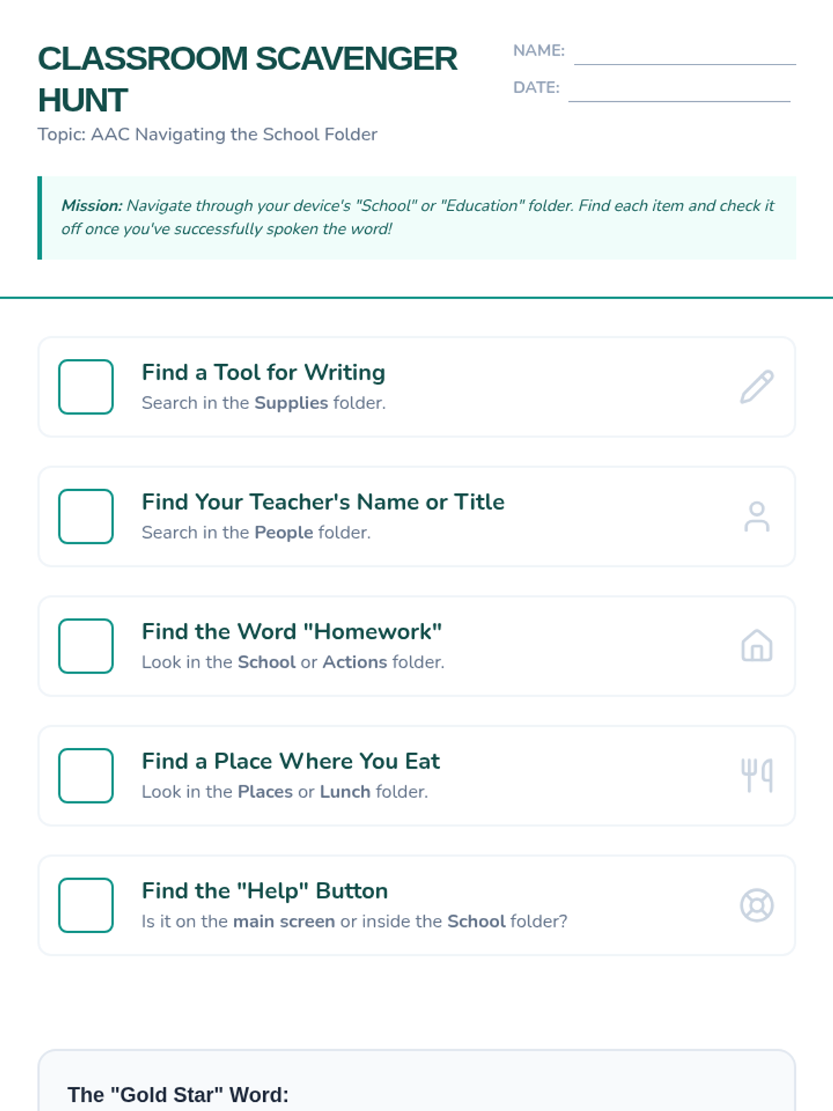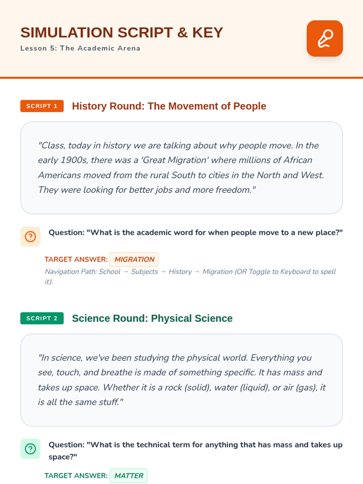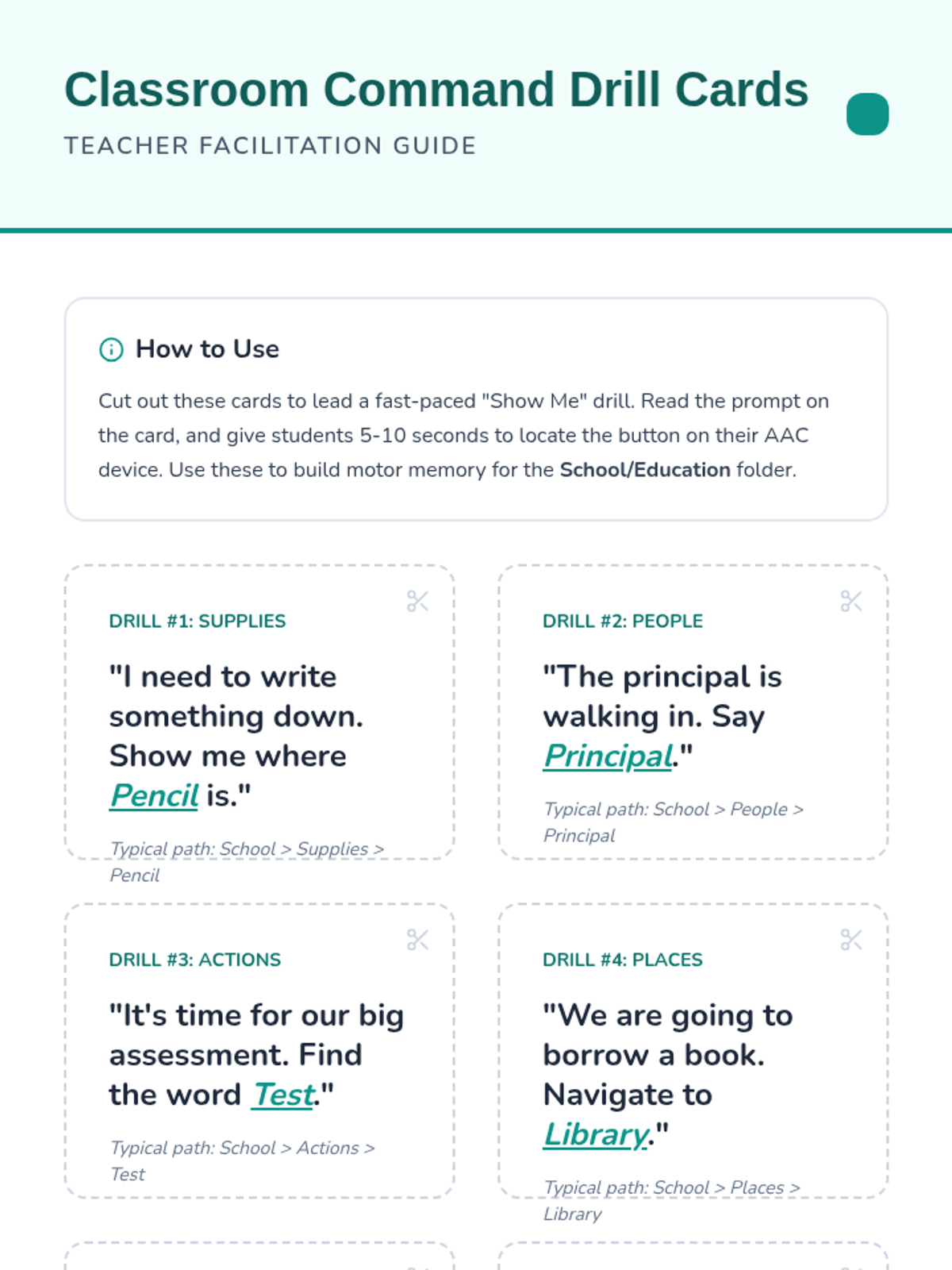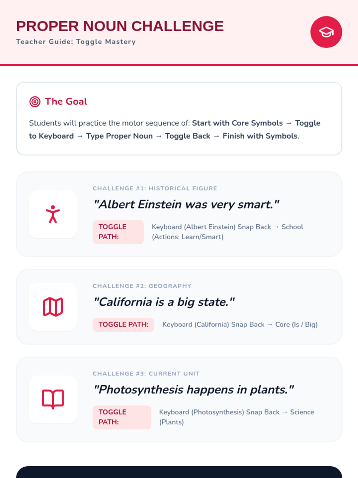 This sequence helps 8th-grade AAC users master the navigation of academic folders and subject-specific vocabulary. Students move from basic classroom commands to complex technical terms and keyboard integration, culminating in a real-time academic simulation.