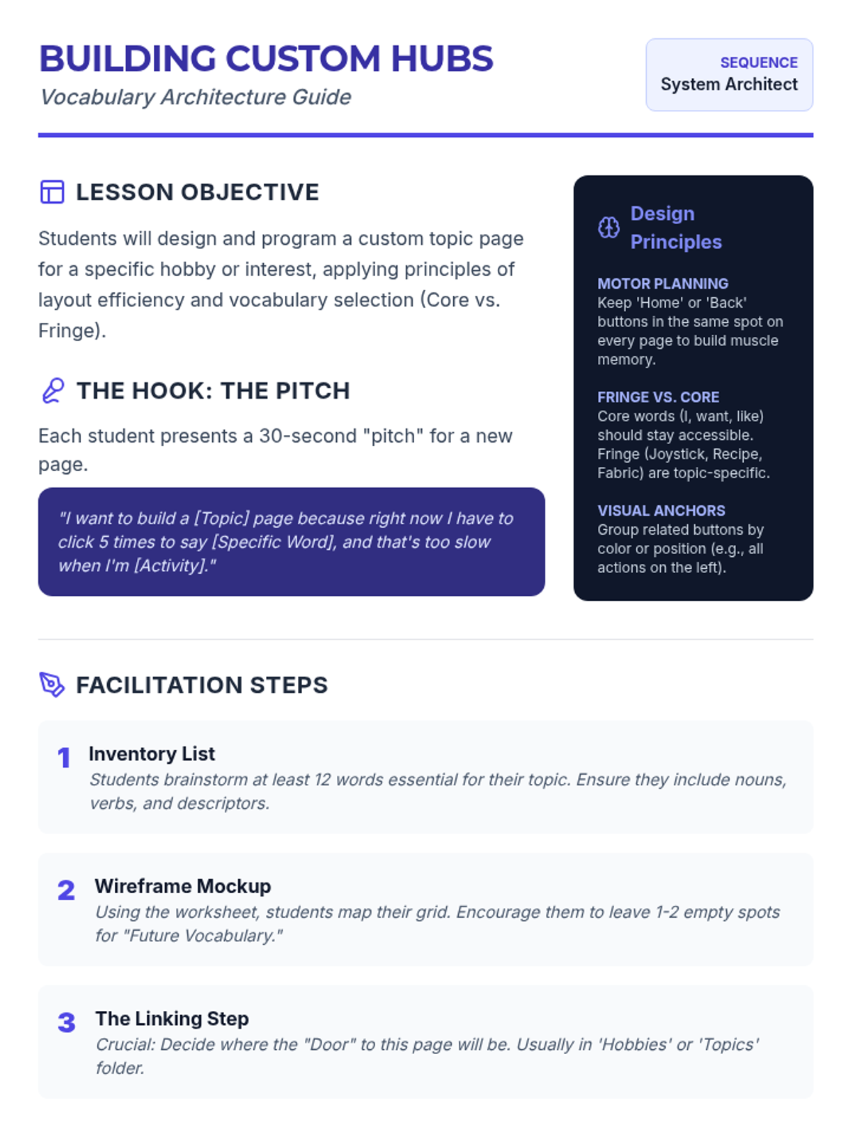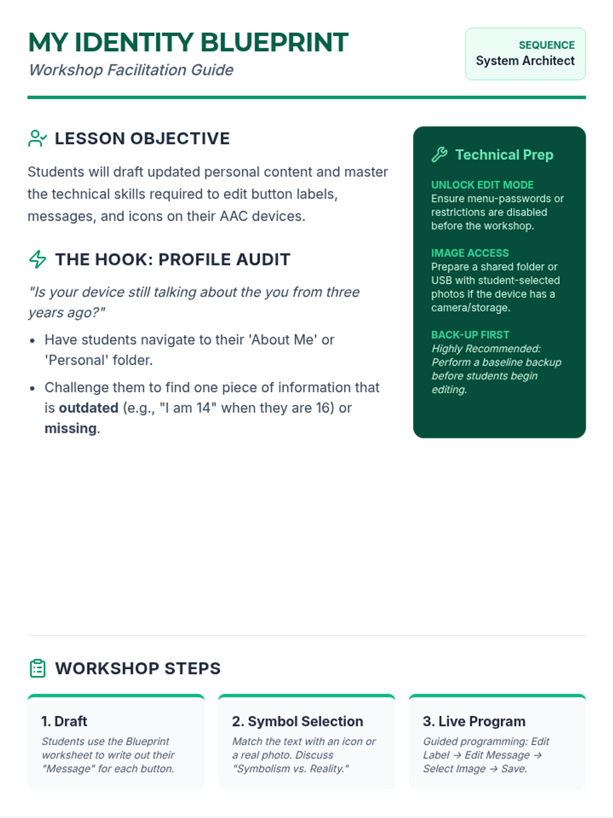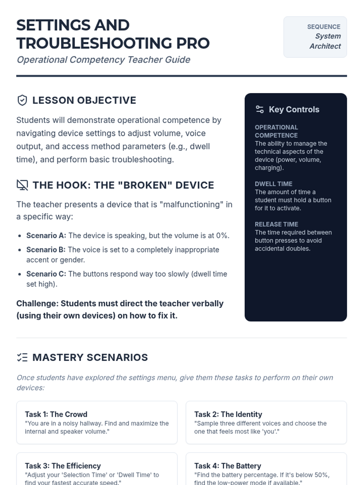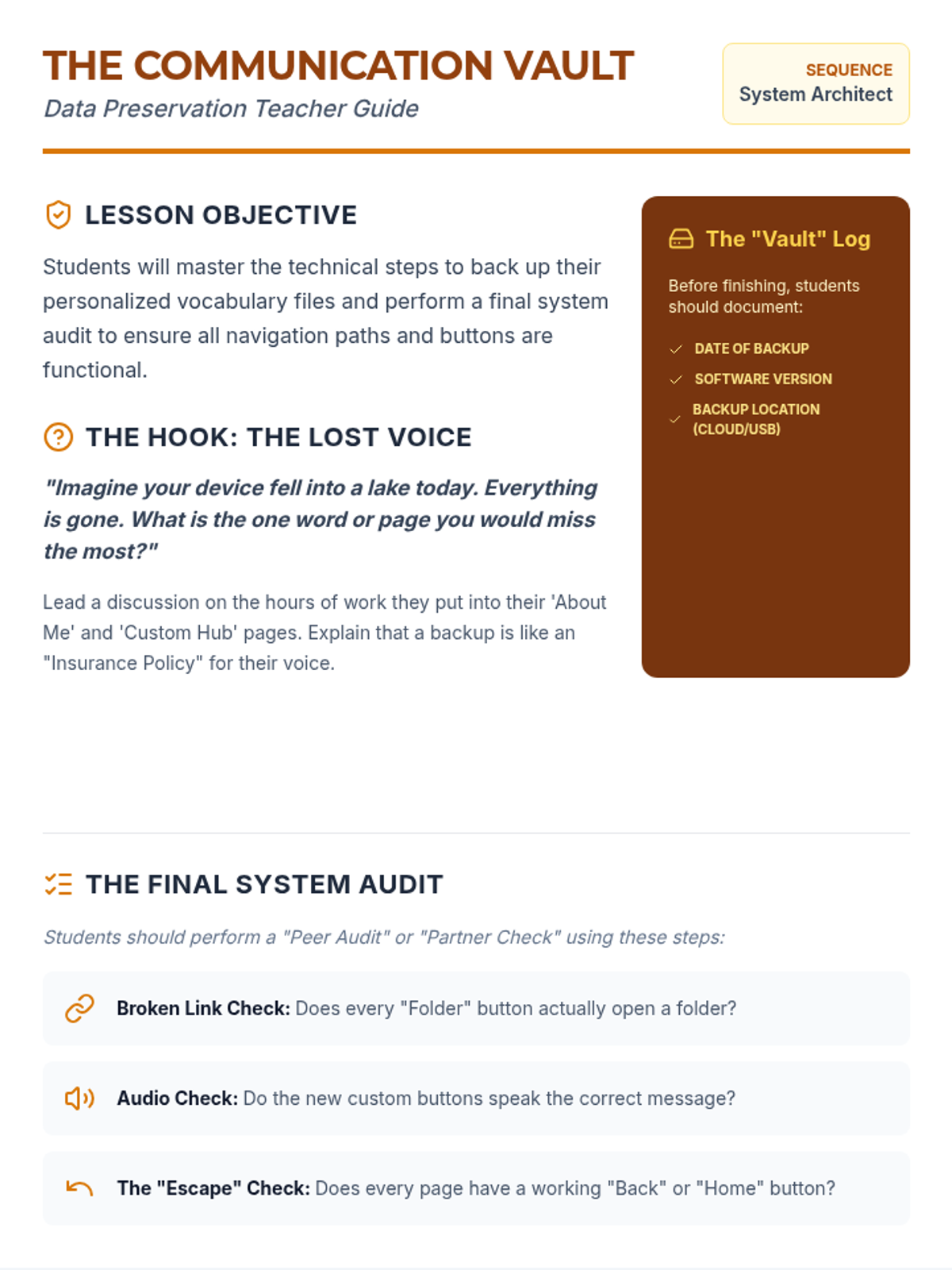 A comprehensive sequence for 11th-grade AAC users to transition from passive users to active system administrators by mastering folder logic, personalization, and system maintenance.