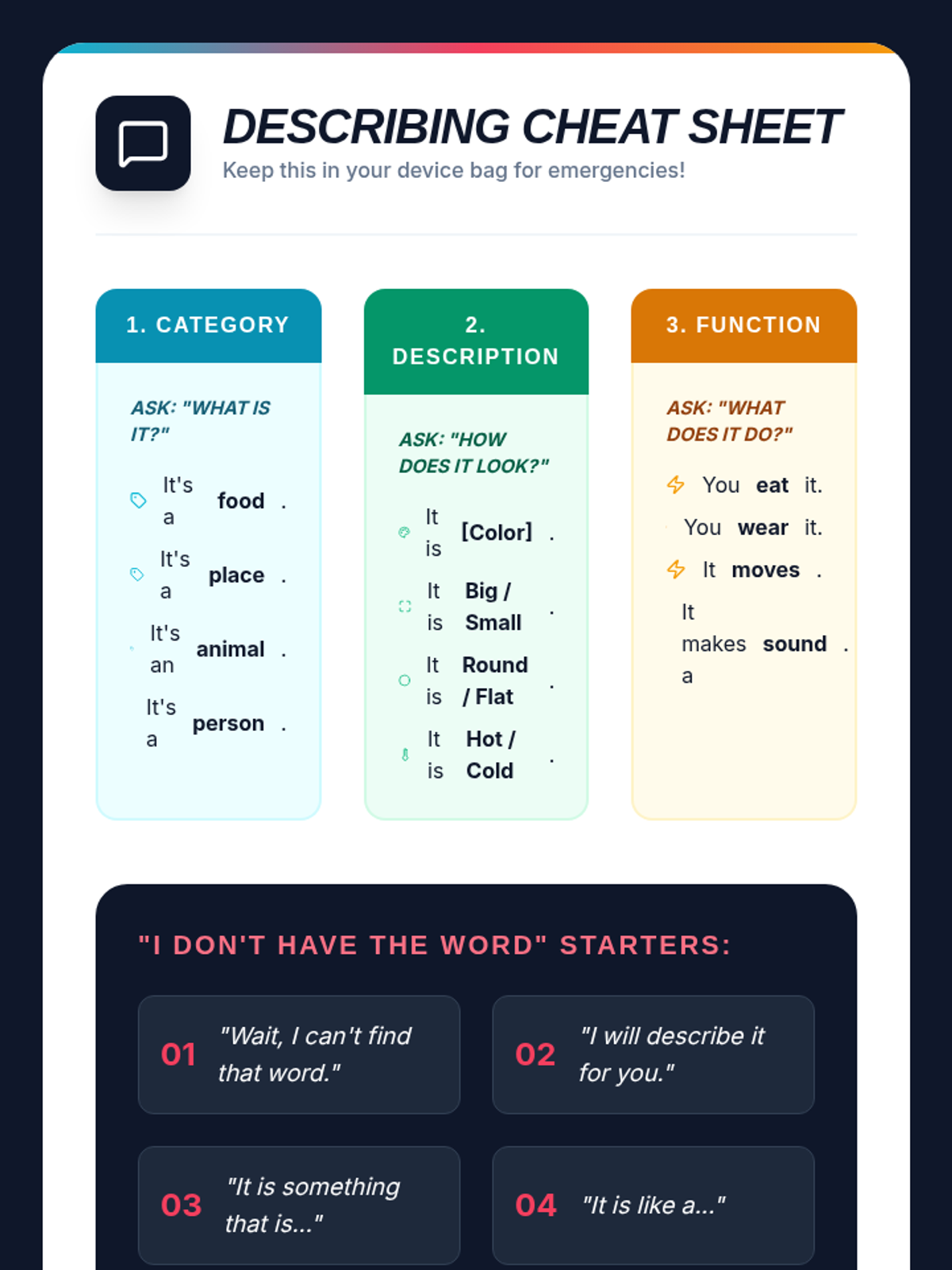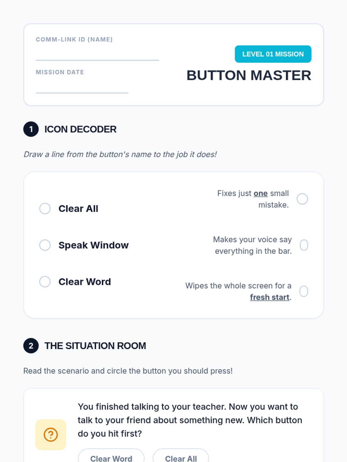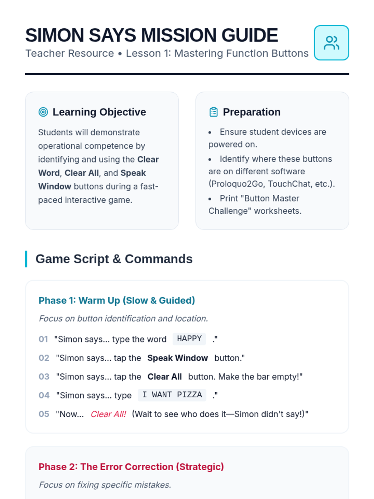 A comprehensive 5-lesson sequence for 5th-grade AAC users focused on operational device management, troubleshooting, and strategic communication. Students learn to manage function buttons, adjust volume for different environments, monitor battery health, use search tools, and employ circumlocution strategies.