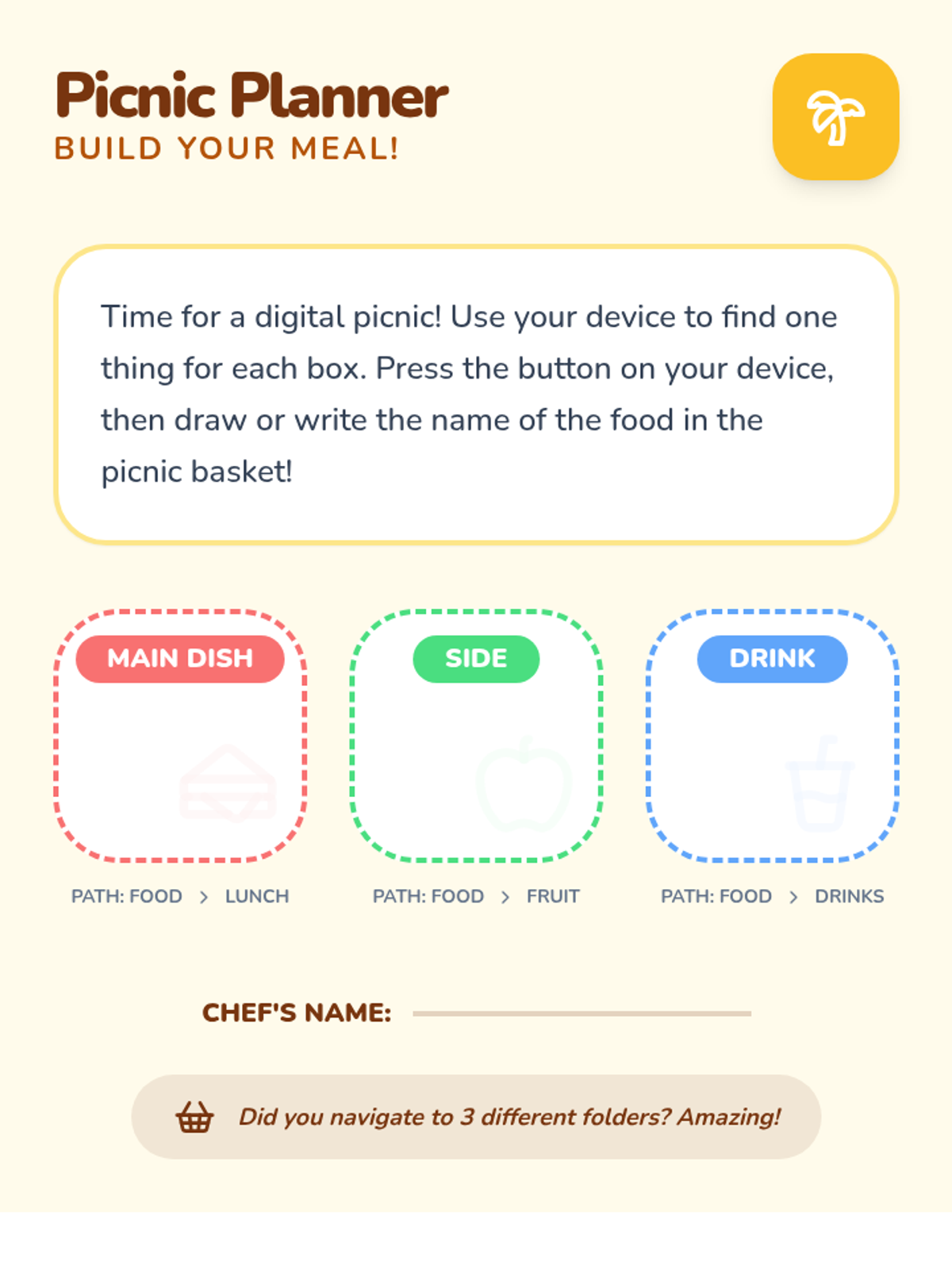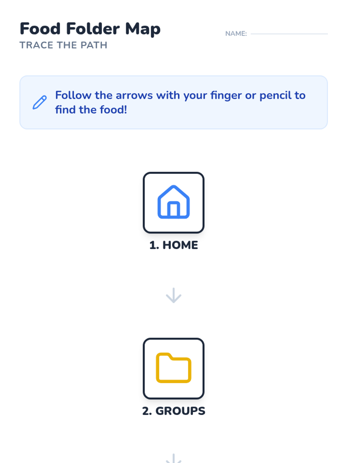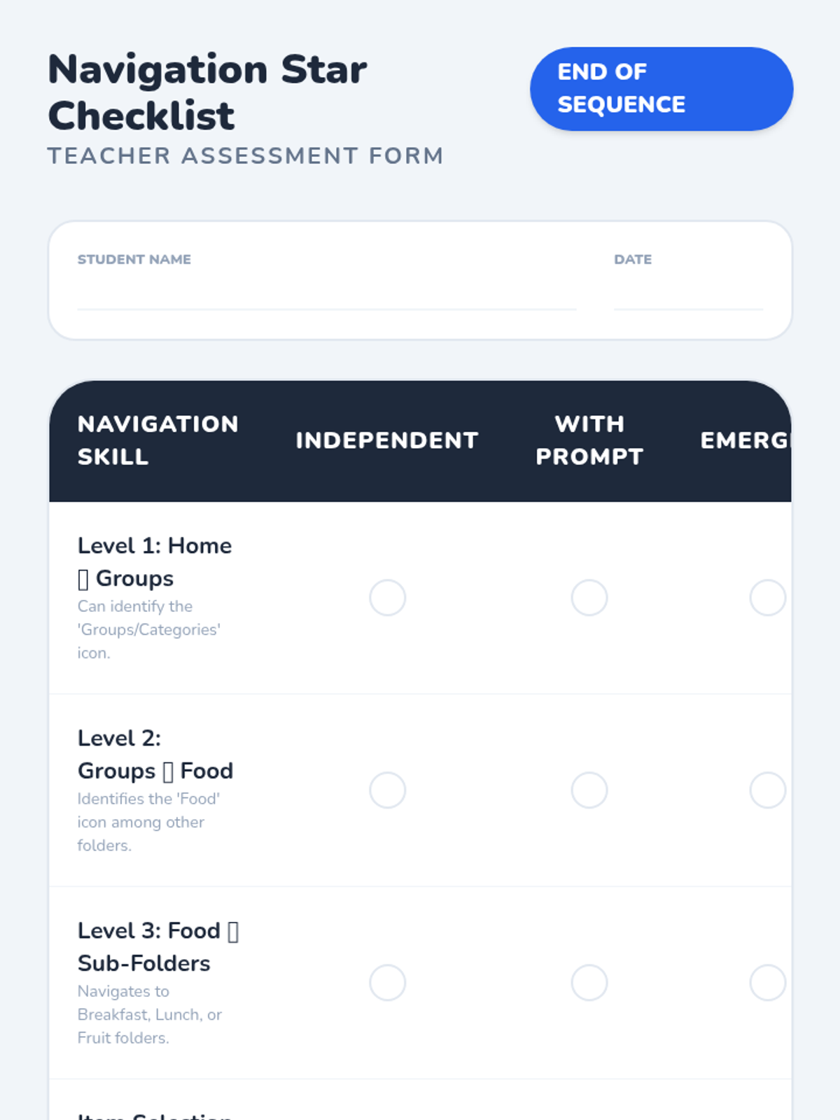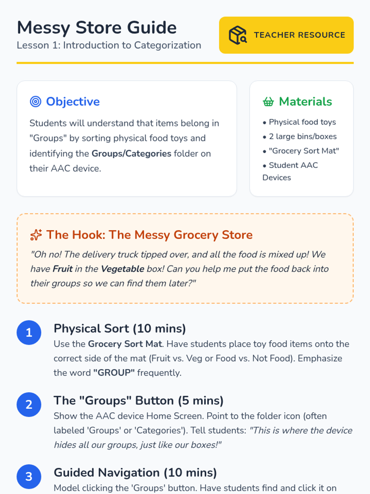 A Kindergarten sequence focused on teaching AAC device navigation through the lens of food categorization. Students progress from physical sorting to navigating three levels deep (Home -> Groups -> Food -> Sub-folder) to express mealtime preferences.