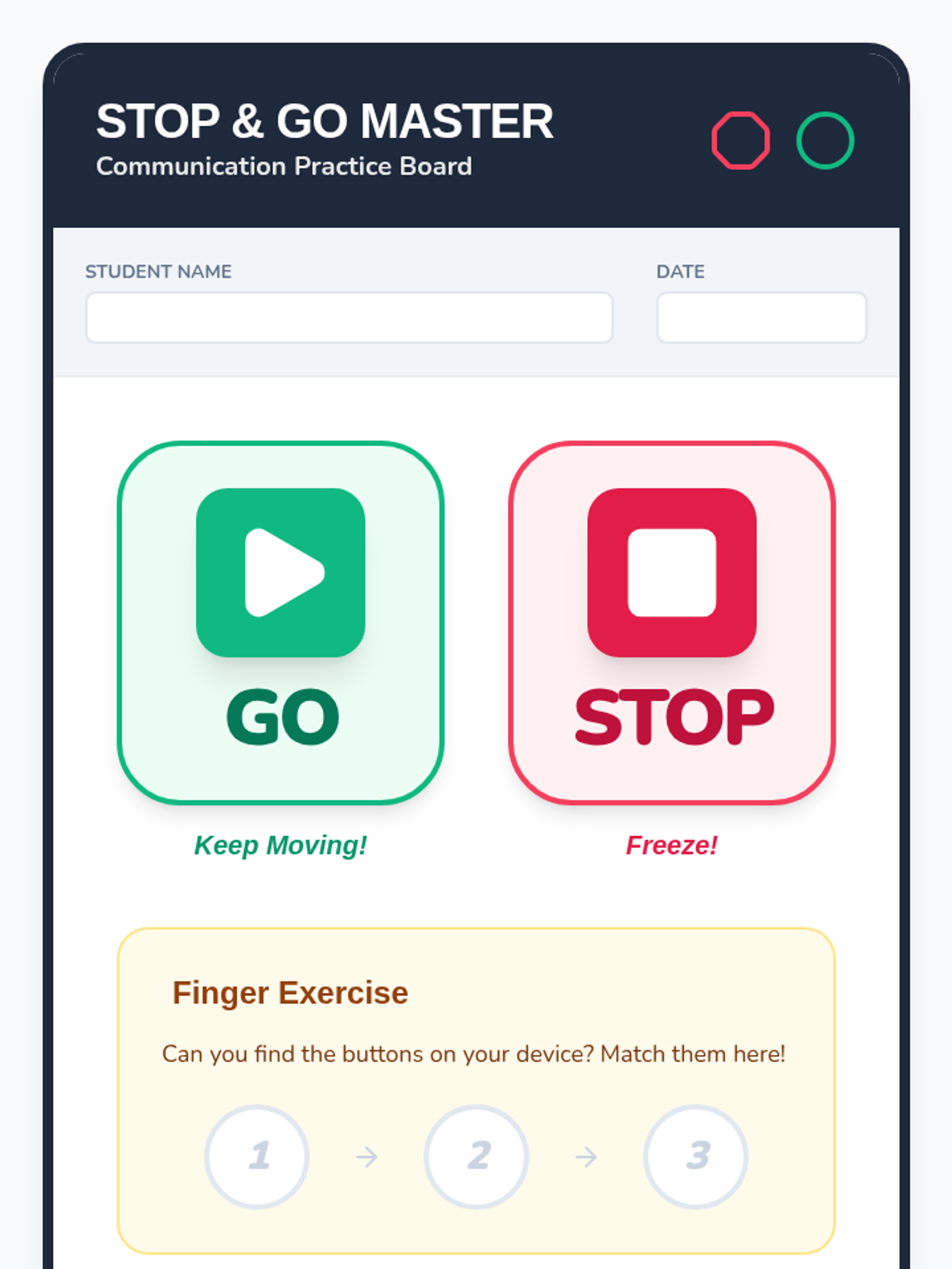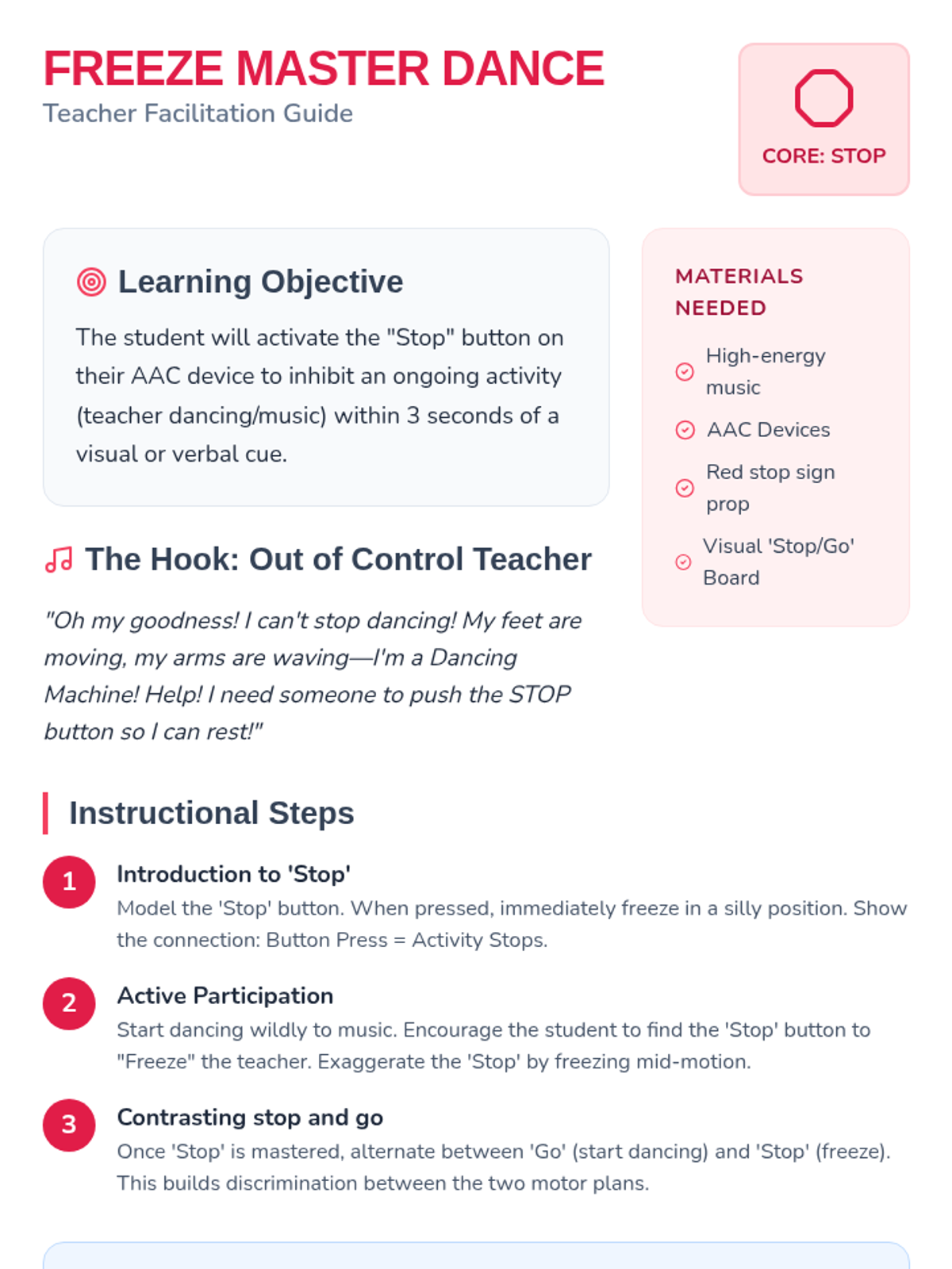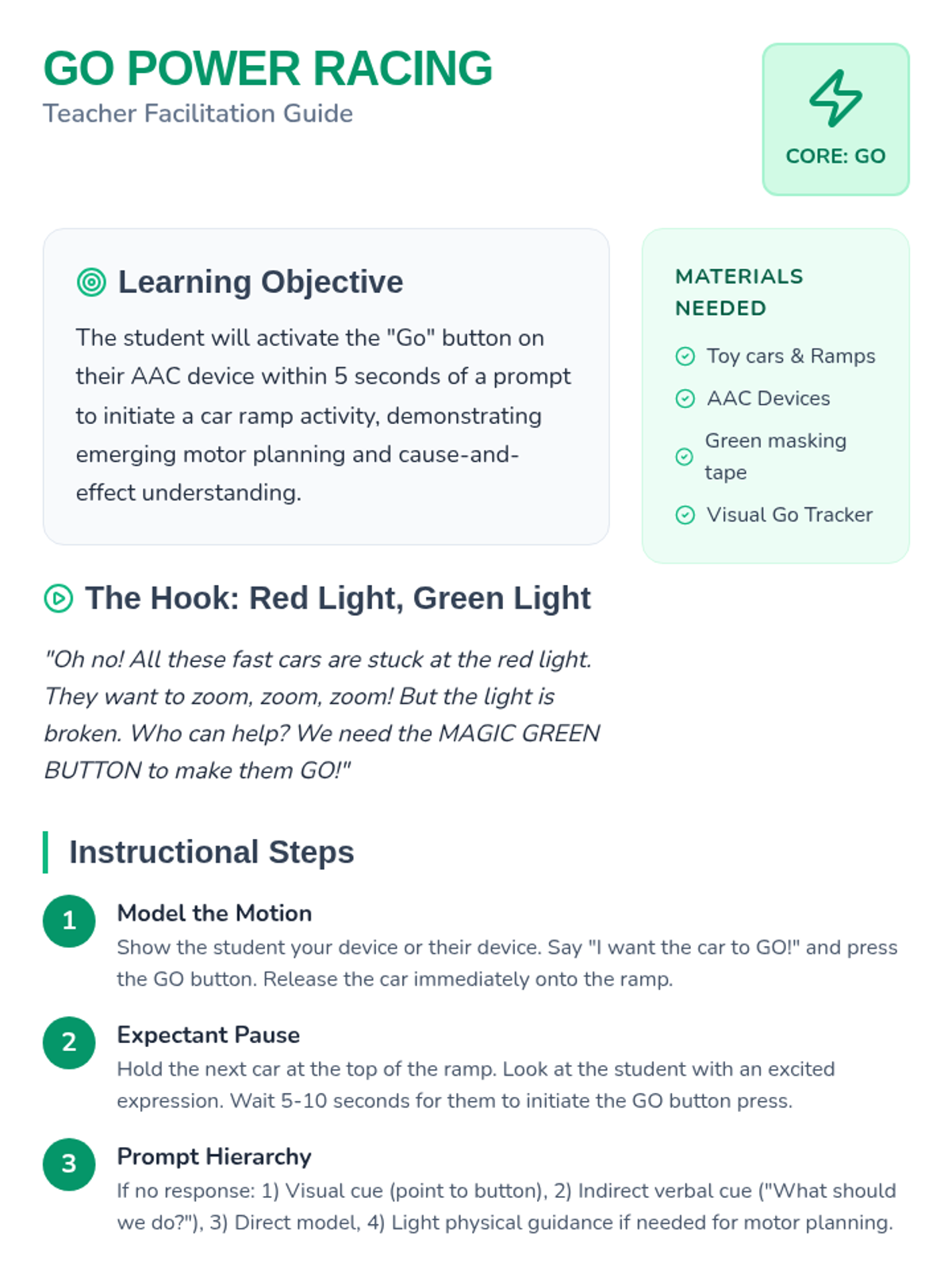 This sequence focuses on establishing consistent motor patterns for high-frequency core vocabulary words ('Go', 'Stop', 'More', 'Help', 'All Done') on an AAC device through high-motivation physical and sensory play.