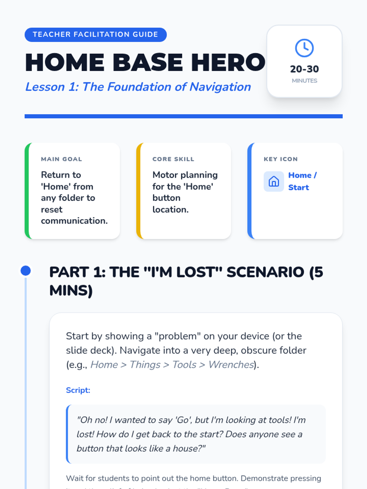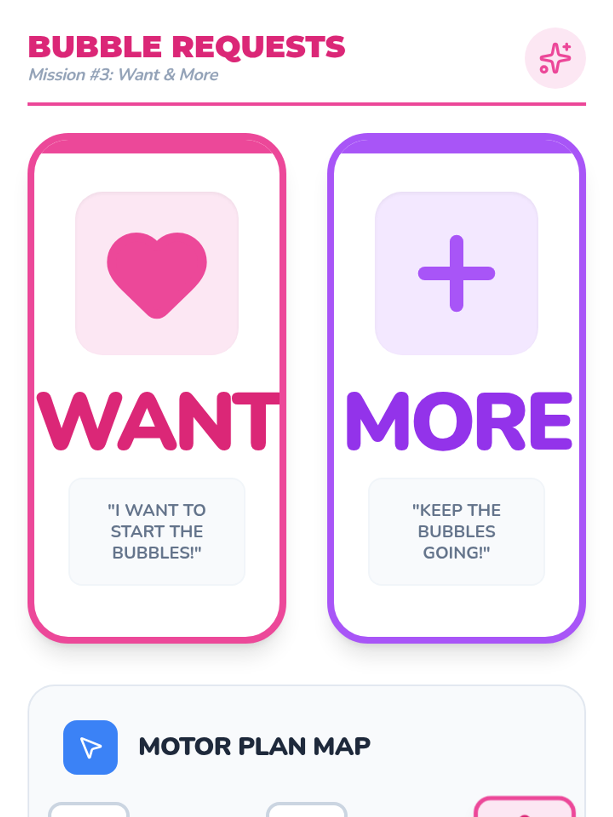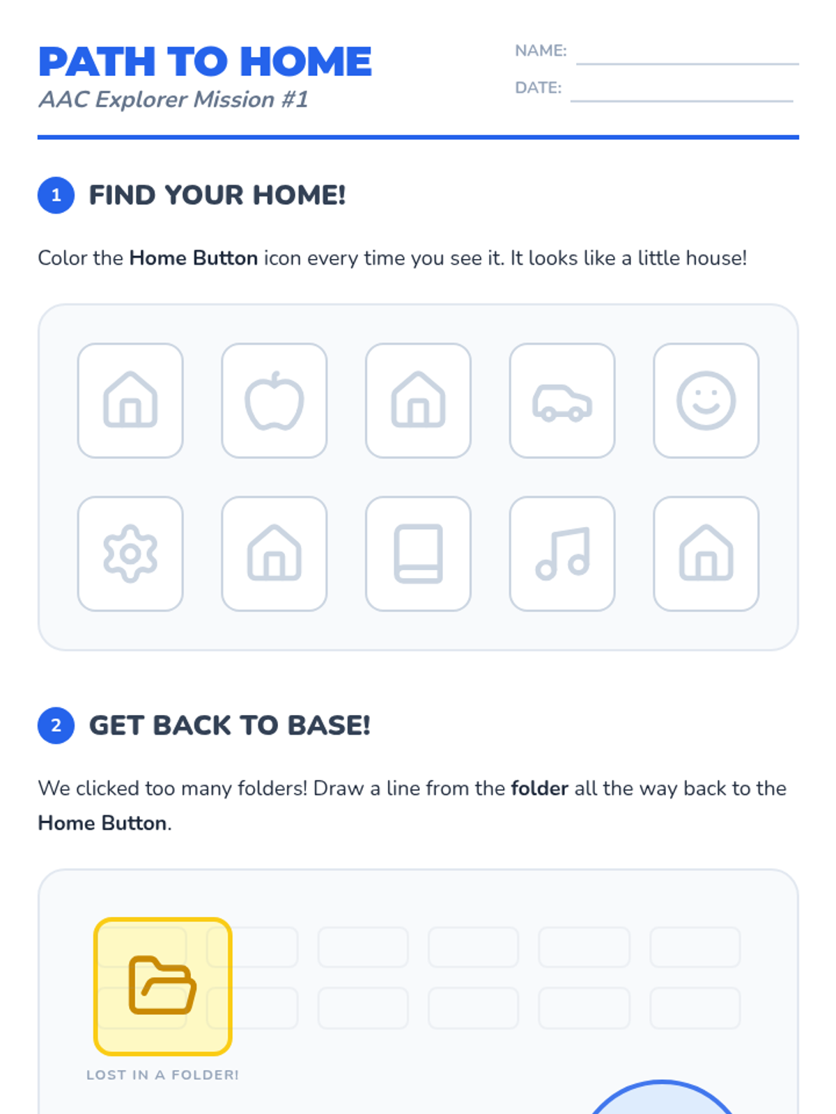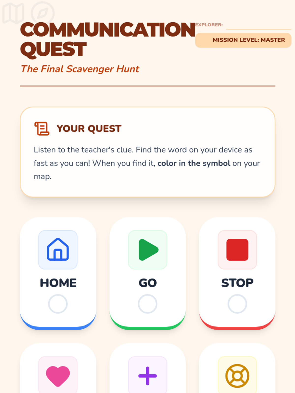 This sequence helps Kindergarten students build motor planning for core vocabulary on their AAC devices. Students learn to navigate 'Home' and access high-frequency words like 'go', 'stop', 'want', 'more', and 'help' through movement-based games and functional play.