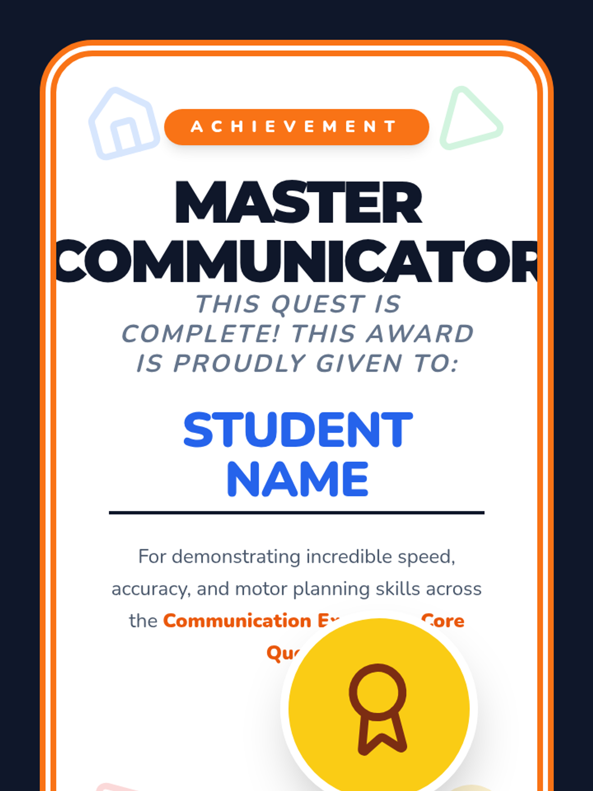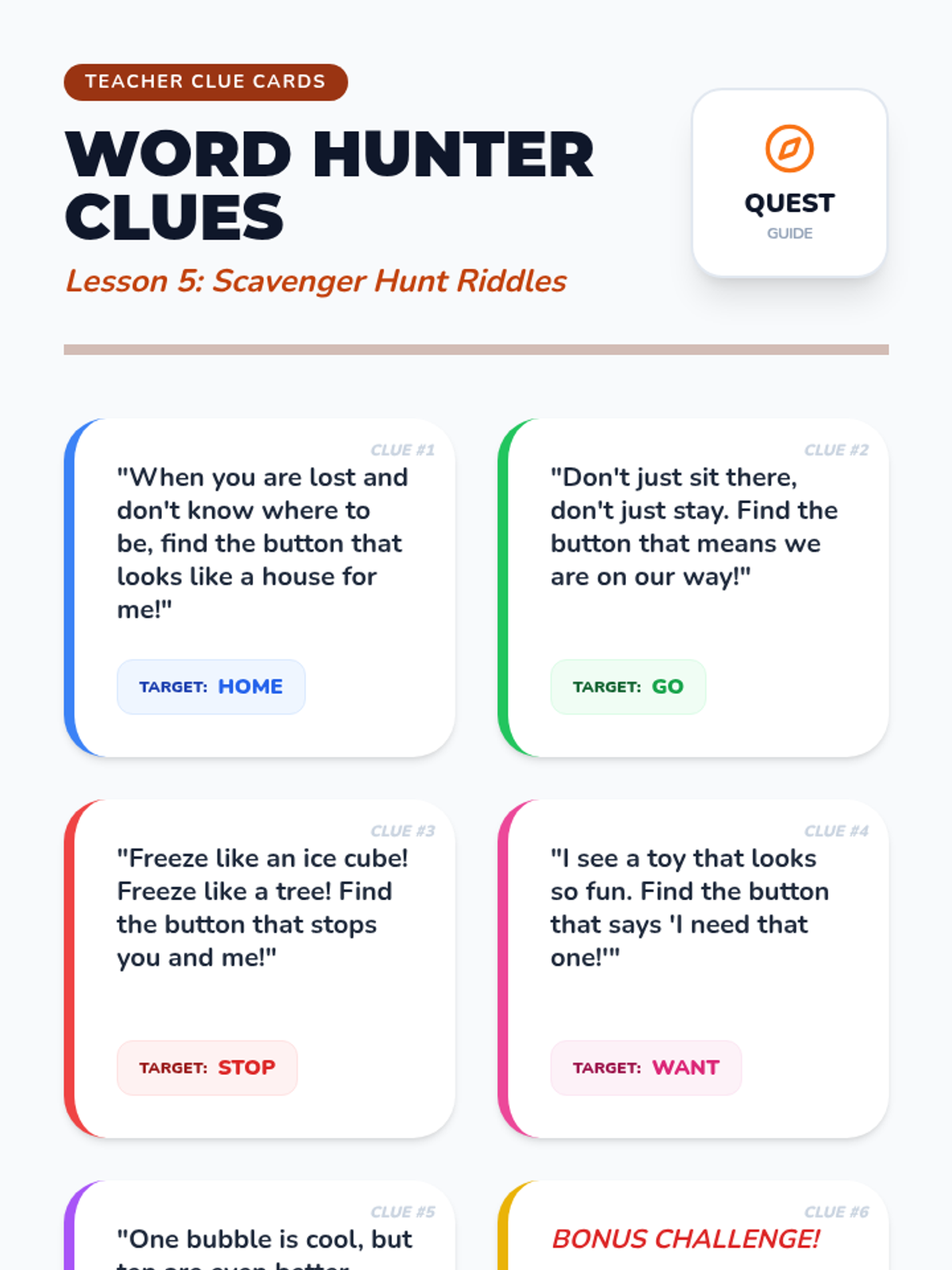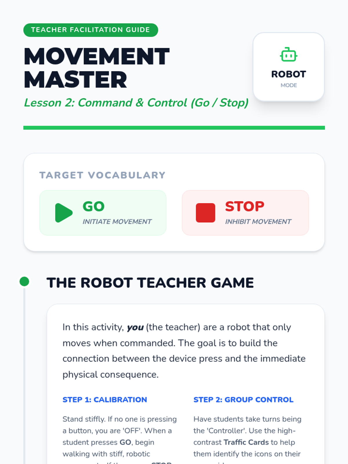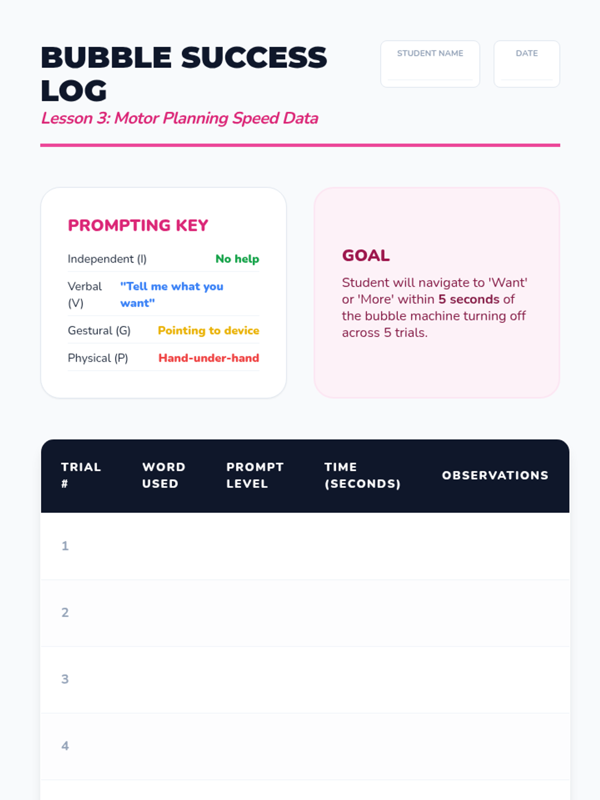 This sequence helps Kindergarten students build motor planning for core vocabulary on their AAC devices. Students learn to navigate 'Home' and access high-frequency words like 'go', 'stop', 'want', 'more', and 'help' through movement-based games and functional play.