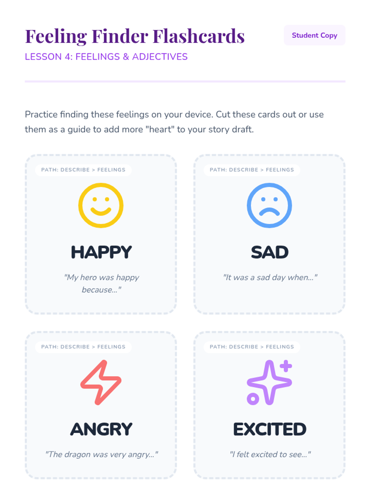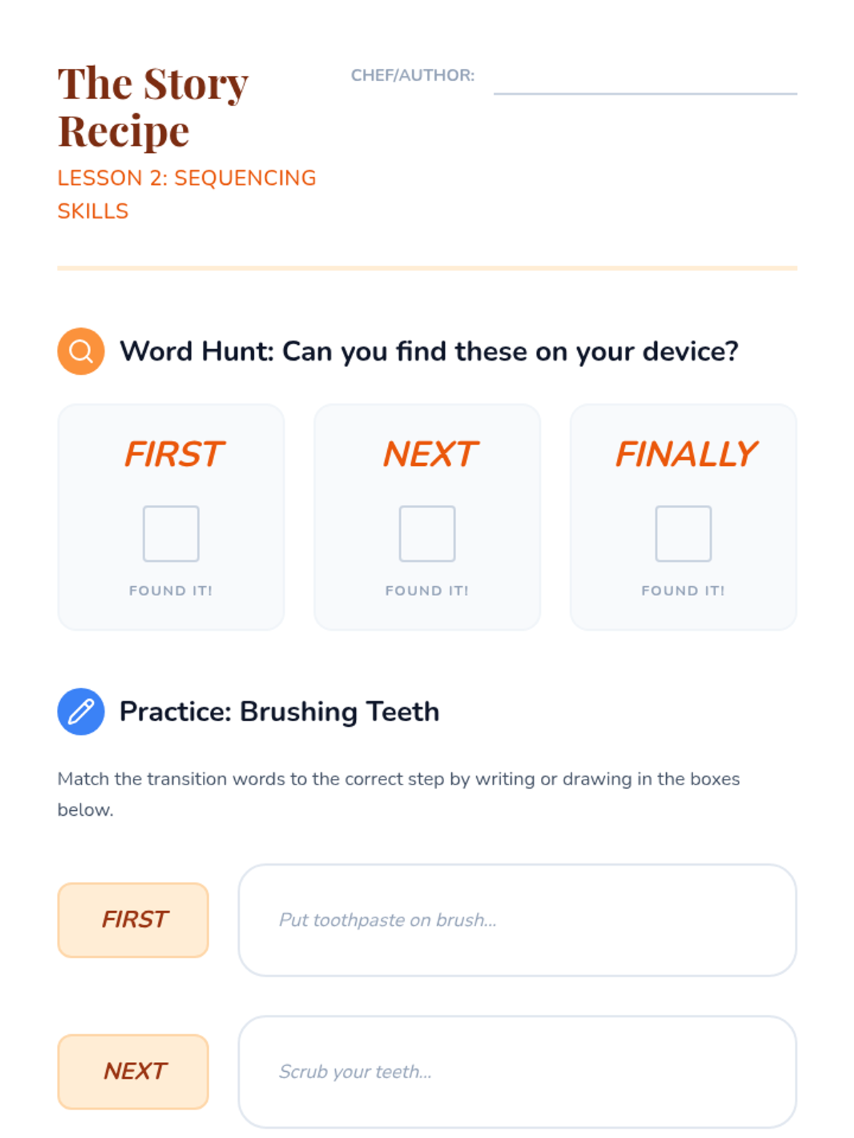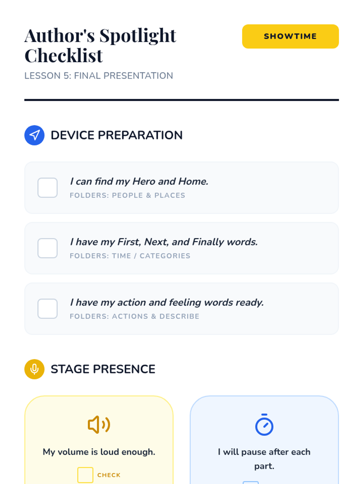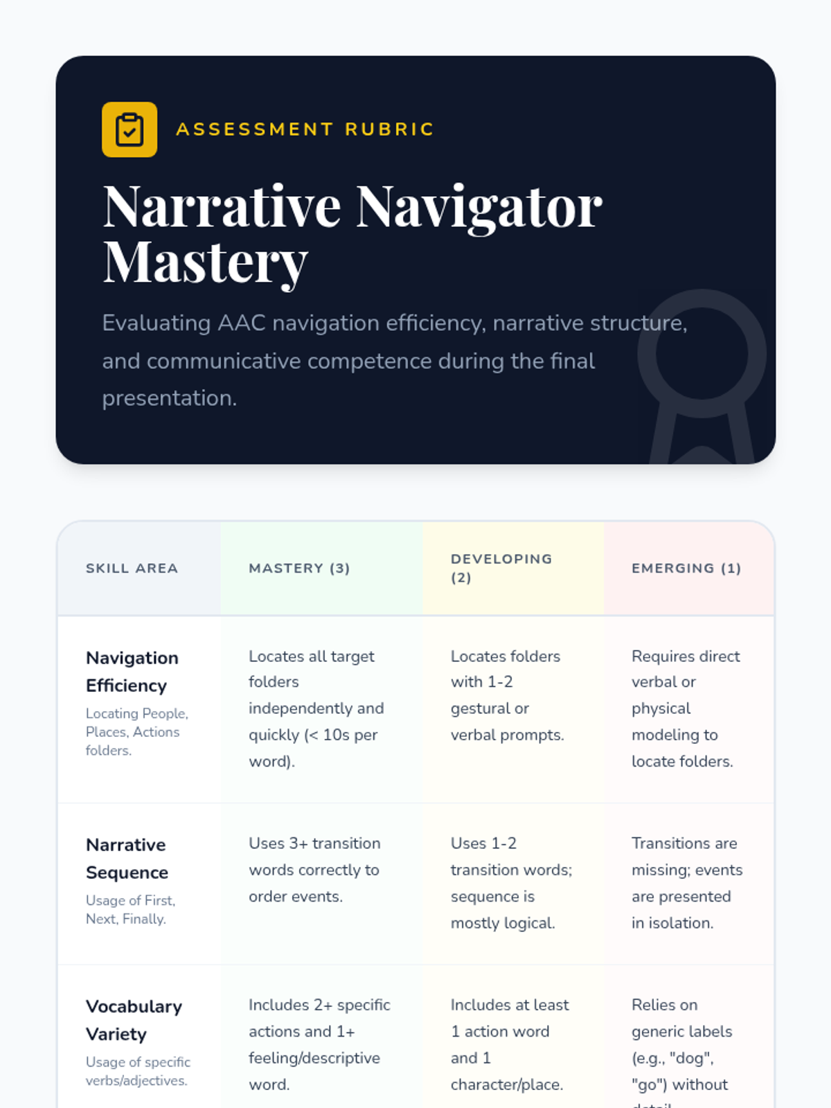 A project-based sequence where 3rd-grade students use AAC device navigation to compose and present a personal or fictional narrative. Students progress from vocabulary selection to sequencing, drafting actions, and adding emotional depth, culminating in a public presentation.