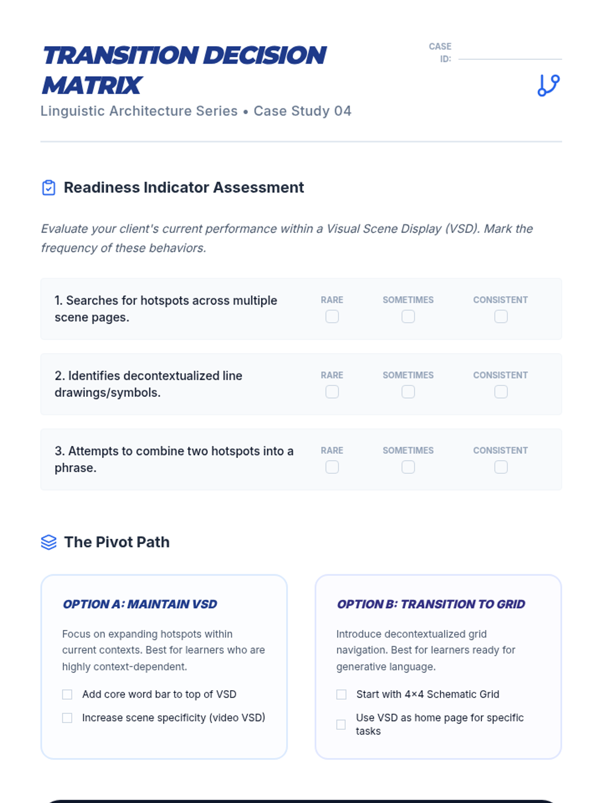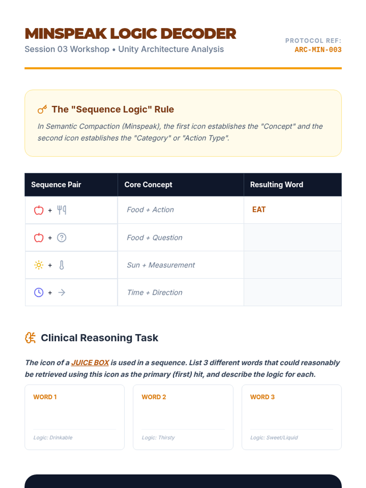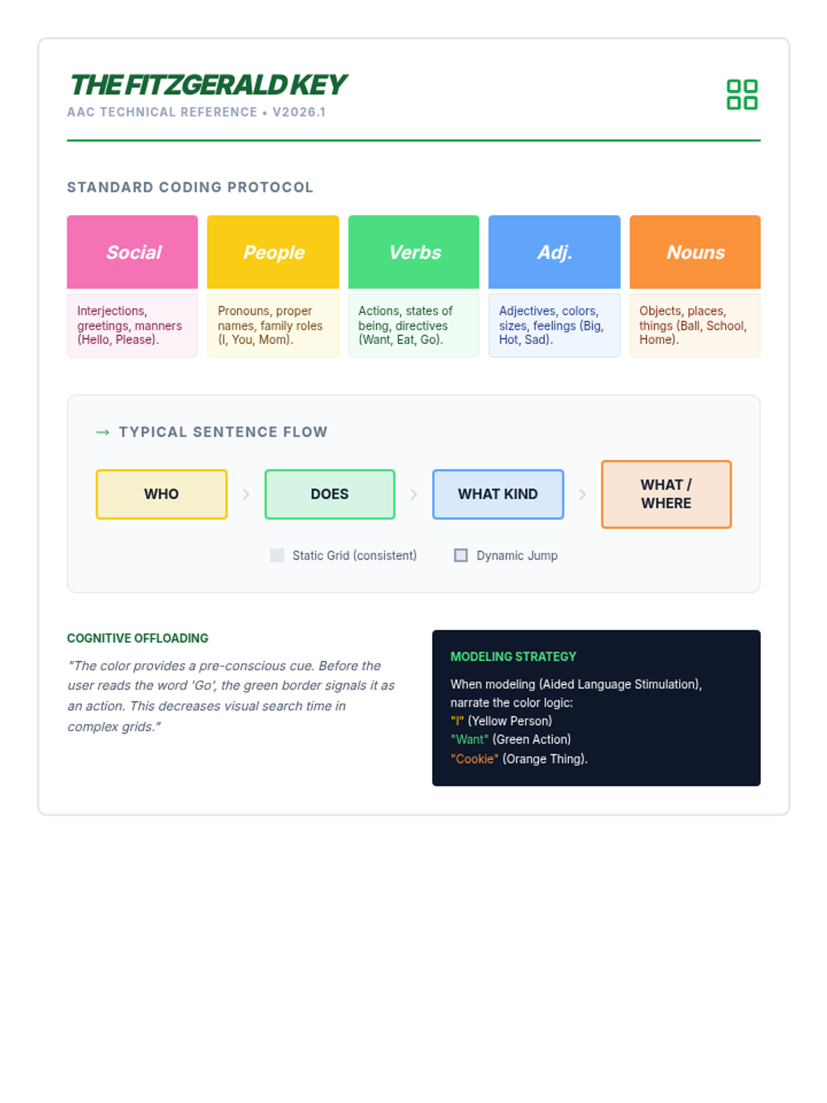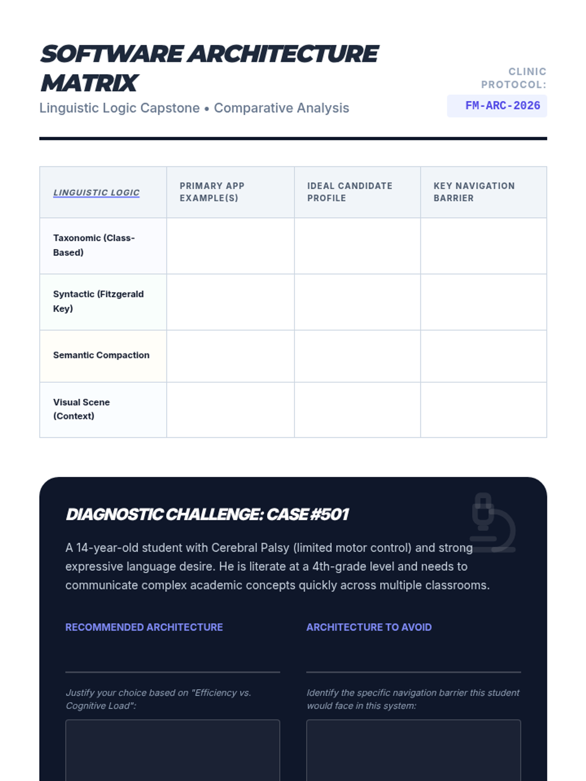 A graduate-level exploration of the linguistic and cognitive logic underlying AAC navigation systems. Students analyze semantic, syntactic, and taxonomic organizations to match communication architectures with diverse learner needs.