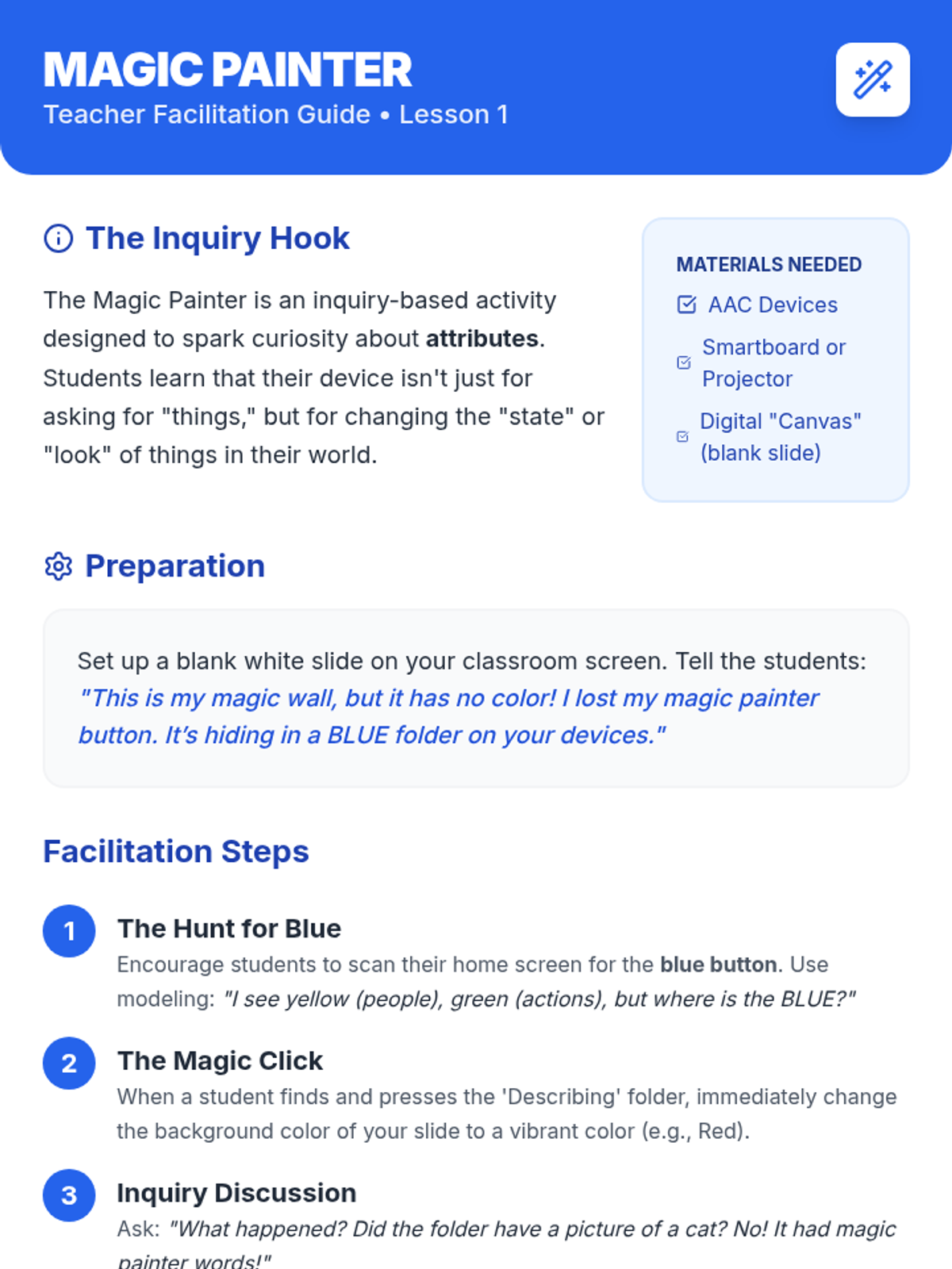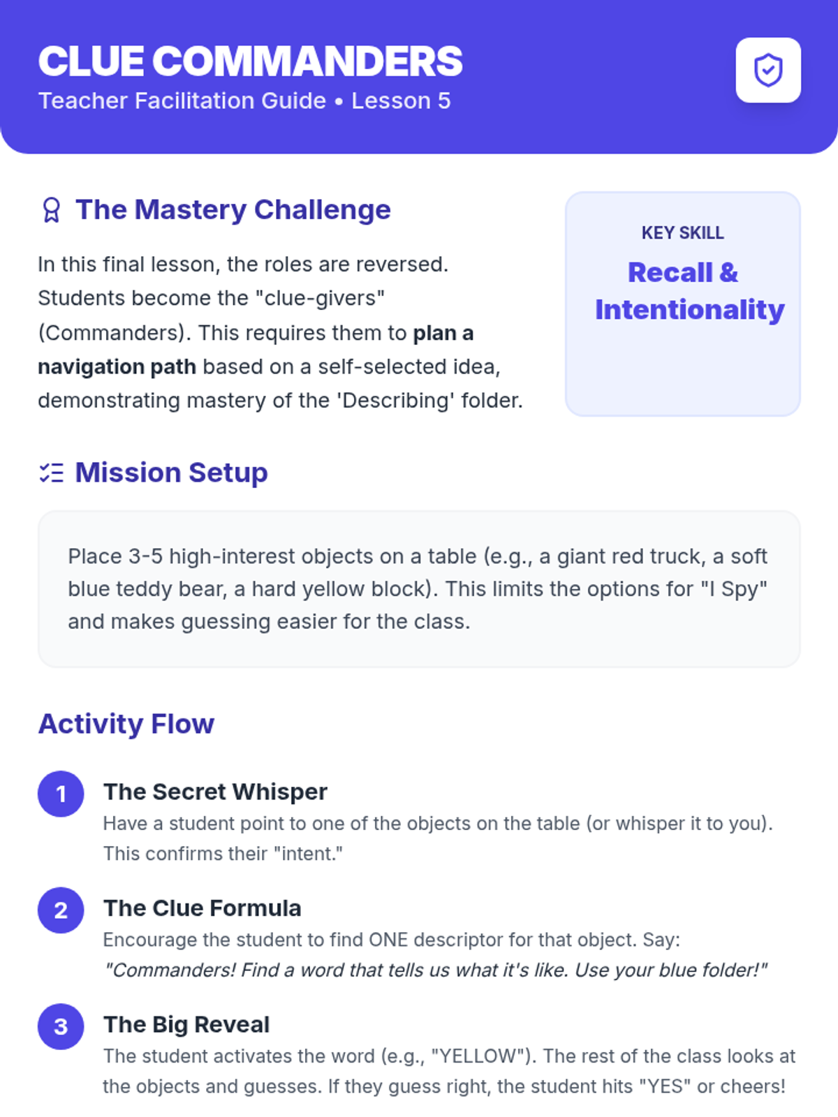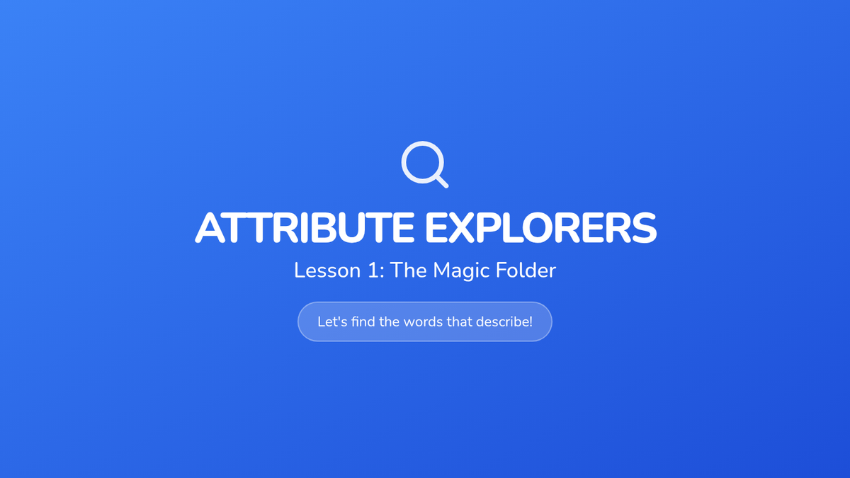 This sequence teaches Kindergarten students how to navigate their AAC devices to find descriptive words (adjectives). Using an inquiry-based 'Detective' theme, students move from finding the main 'Describing' folder to specific sub-folders for colors, sizes, and textures, culminating in a game of 'I Spy' using their devices.
