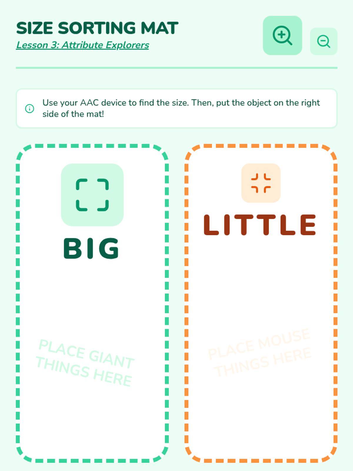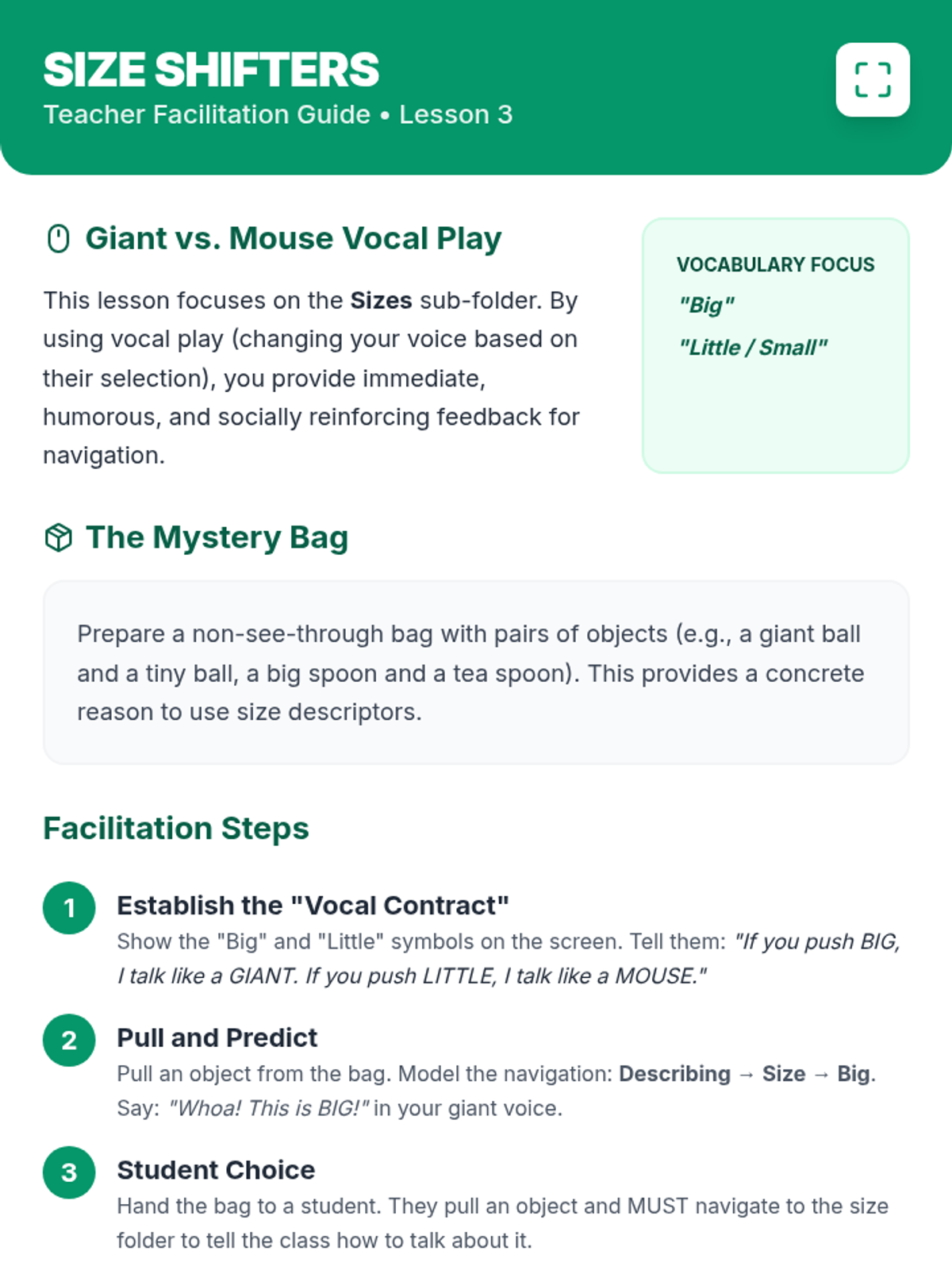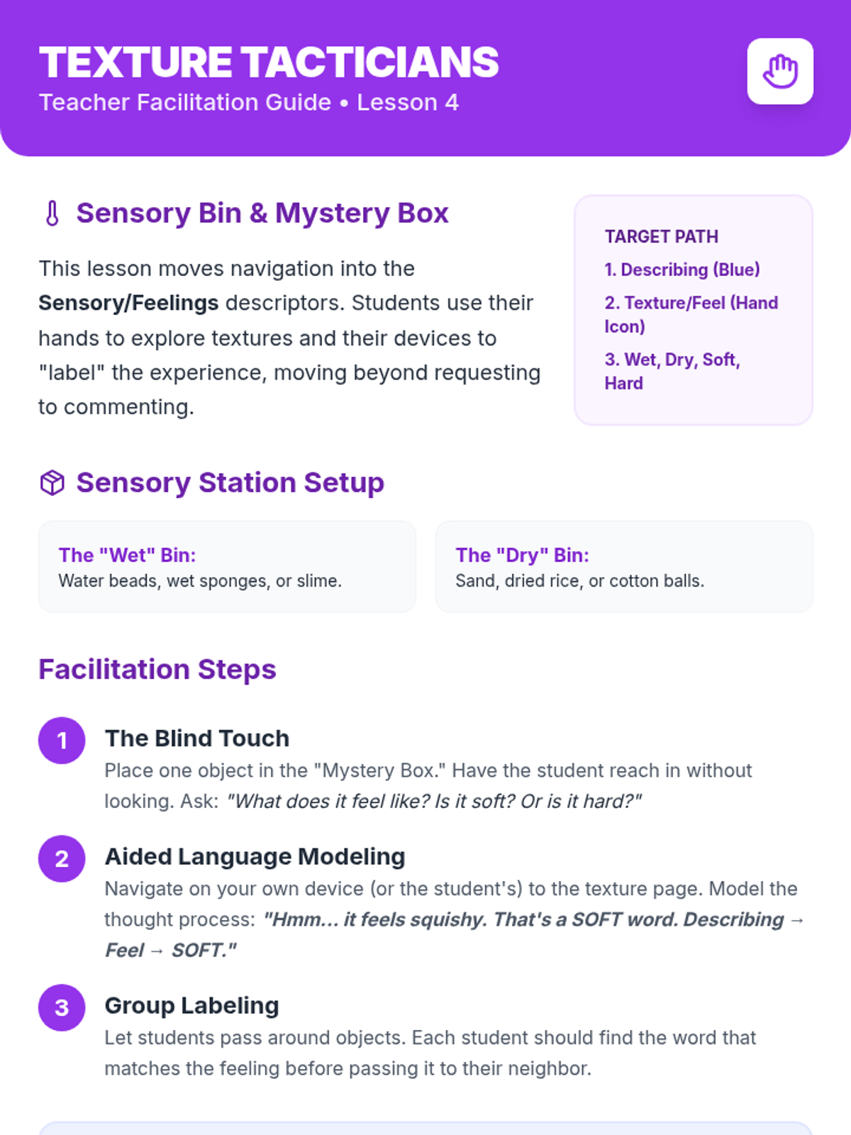 This sequence teaches Kindergarten students how to navigate their AAC devices to find descriptive words (adjectives). Using an inquiry-based 'Detective' theme, students move from finding the main 'Describing' folder to specific sub-folders for colors, sizes, and textures, culminating in a game of 'I Spy' using their devices.
