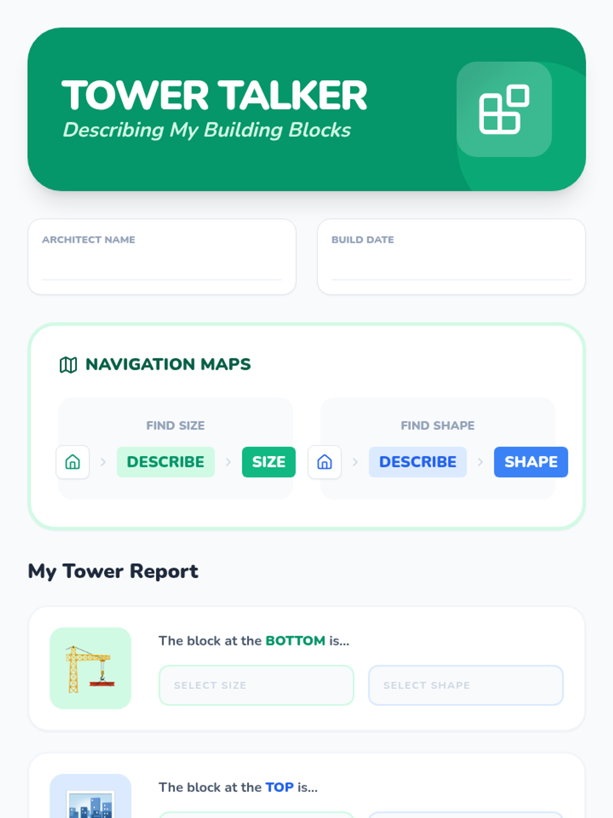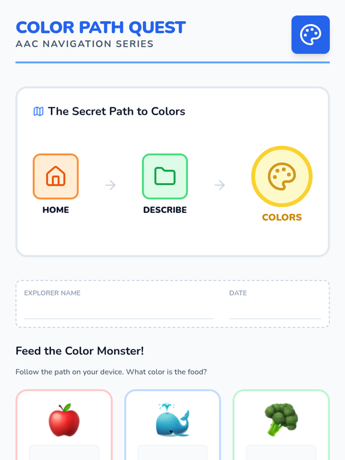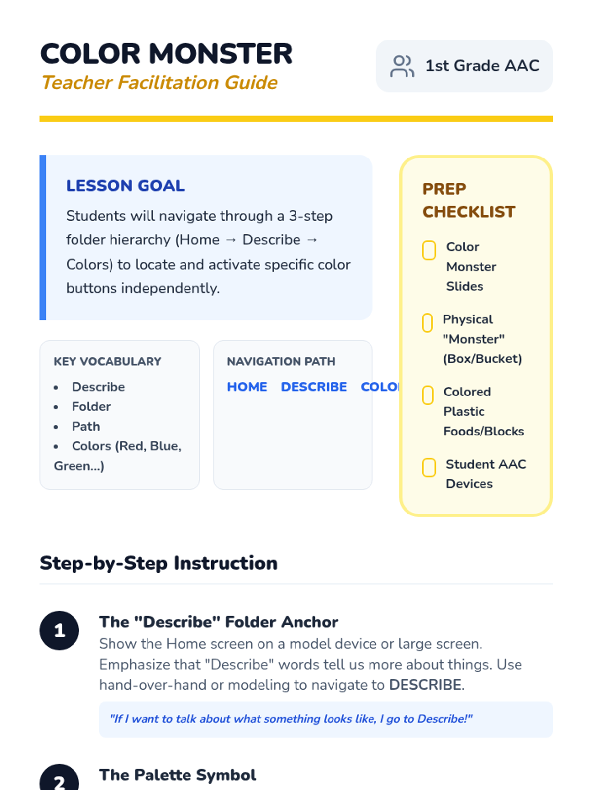 This sequence teaches 1st-grade AAC users how to navigate to descriptive and attribute vocabulary. Students learn to find colors, sizes, shapes, feelings, and sensory words, culminating in building multi-word descriptive phrases.
