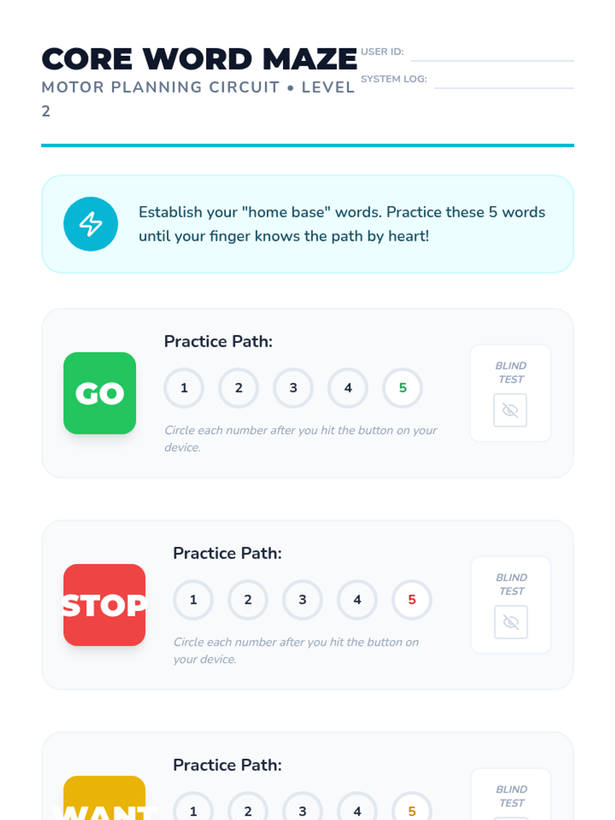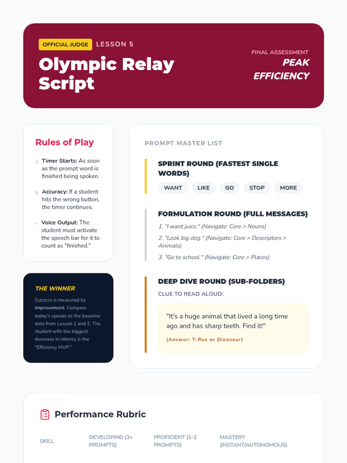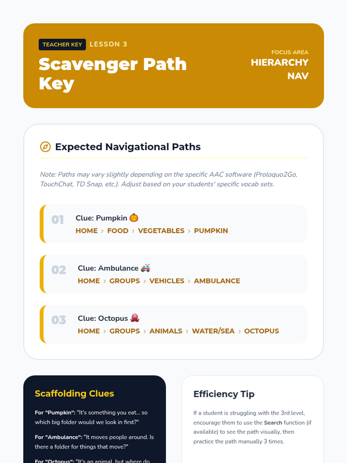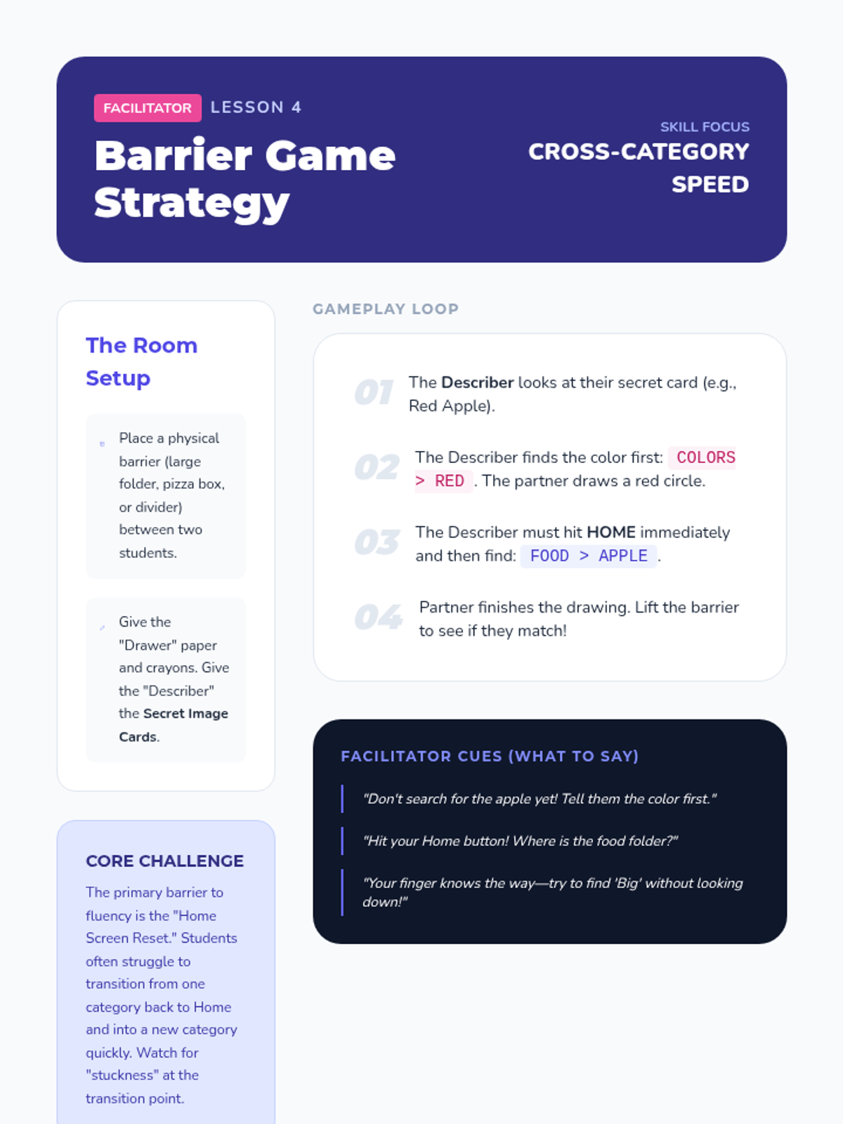 A gamified series of lessons designed to improve the motor automaticity and navigational speed of students using high-tech AAC devices. Students progress from simple category sorting to complex, multi-step message formulation through interactive challenges.