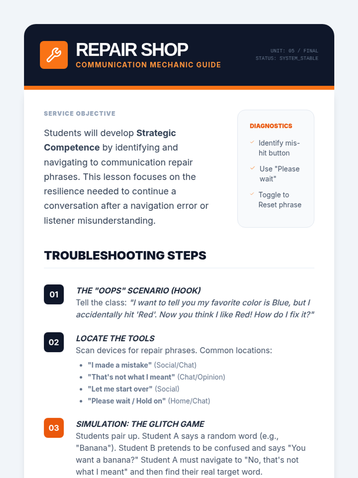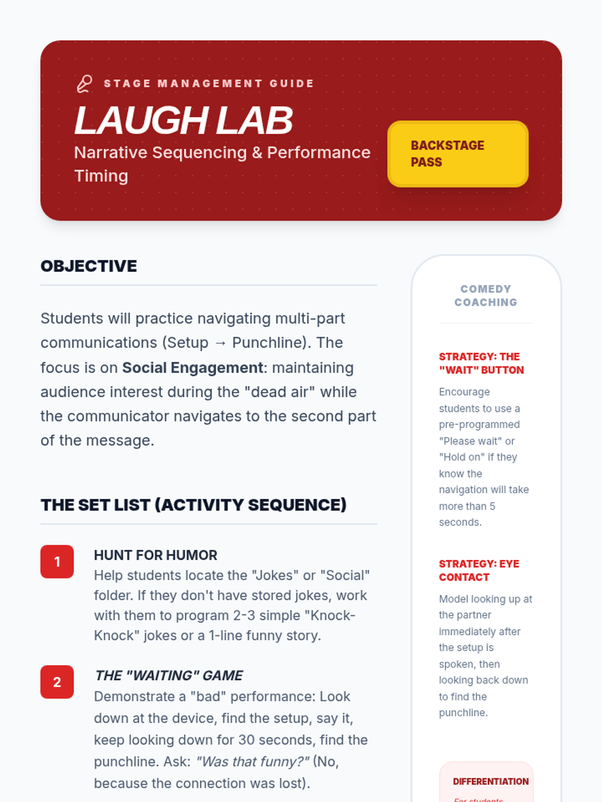 A 5th-grade sequence focused on developing AAC device navigation skills for fluid social interaction. Students learn to navigate 'Social', 'Question', 'Comment', and 'Joke' folders to maintain conversational flow and repair communication breakdowns.