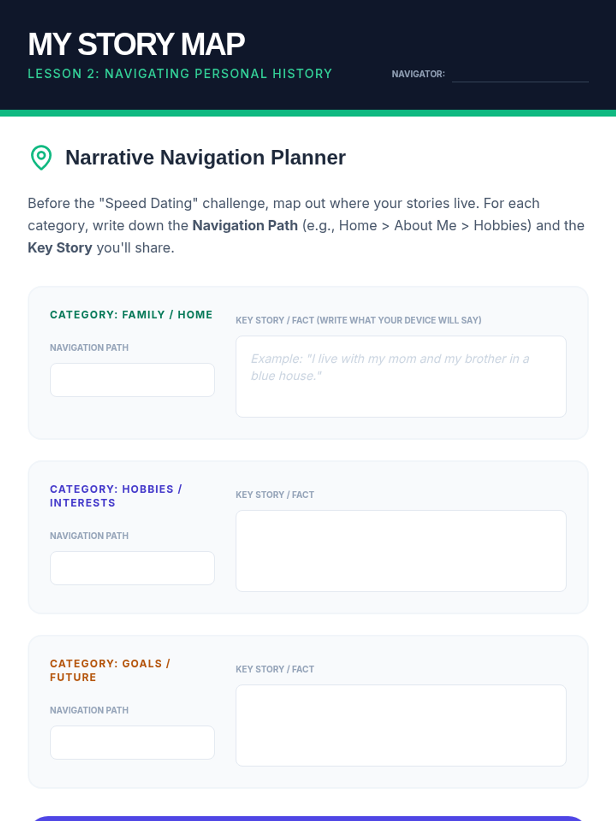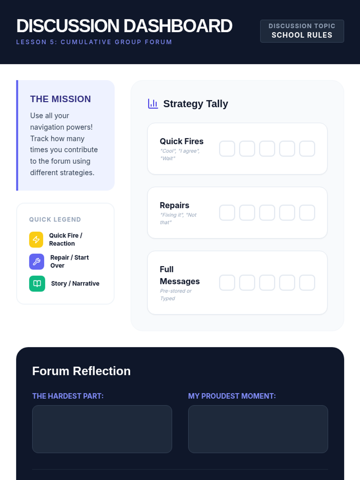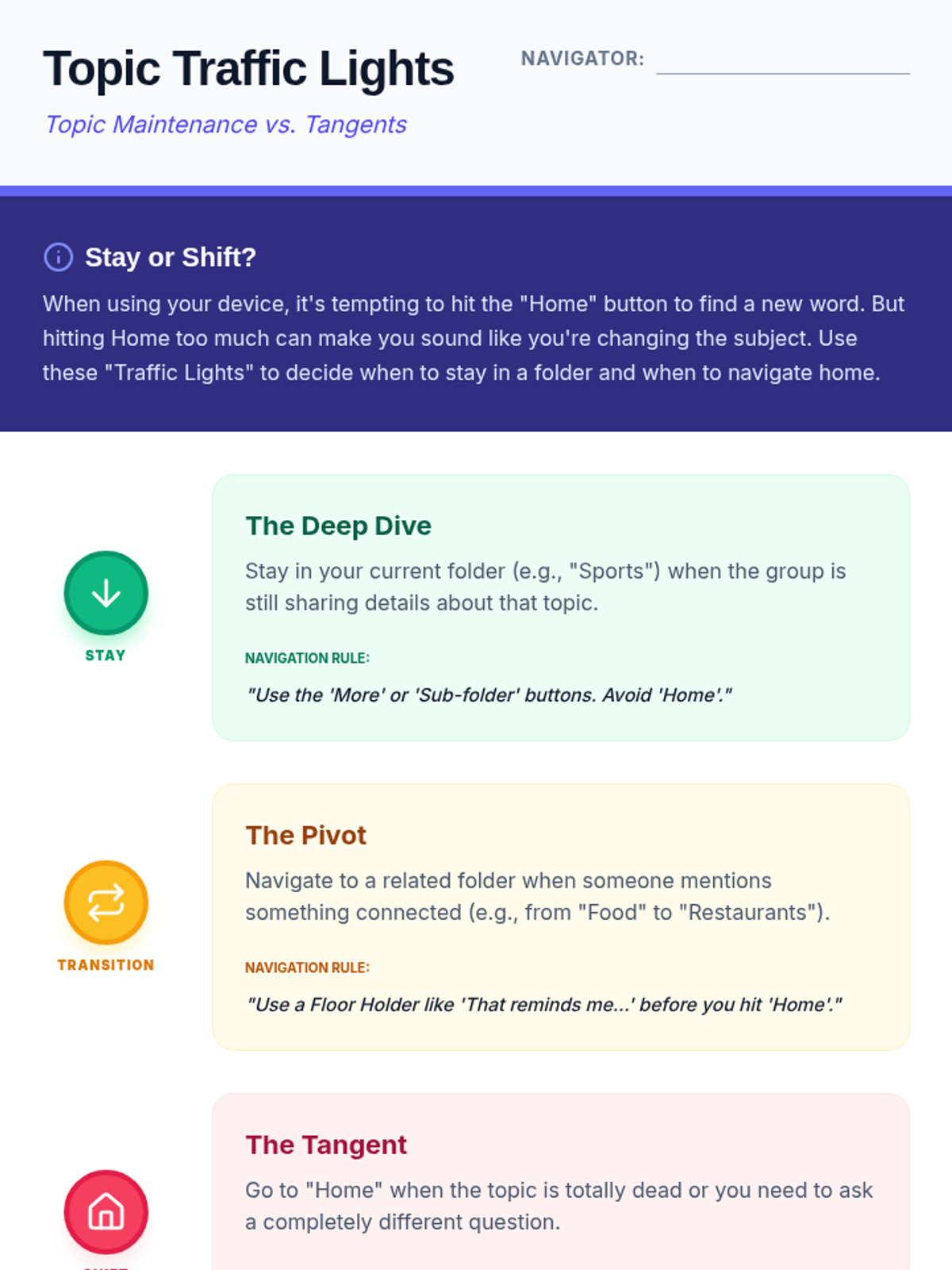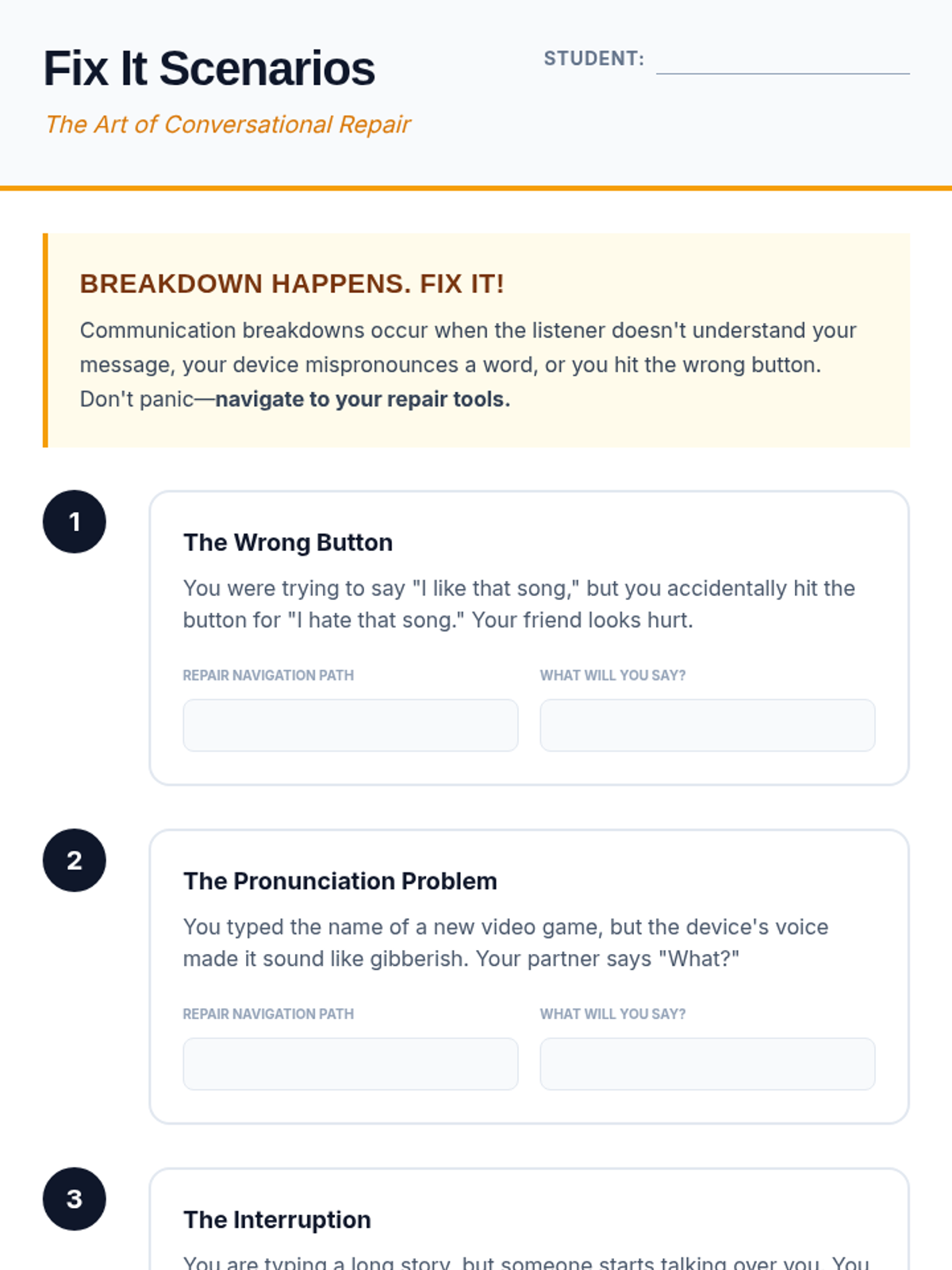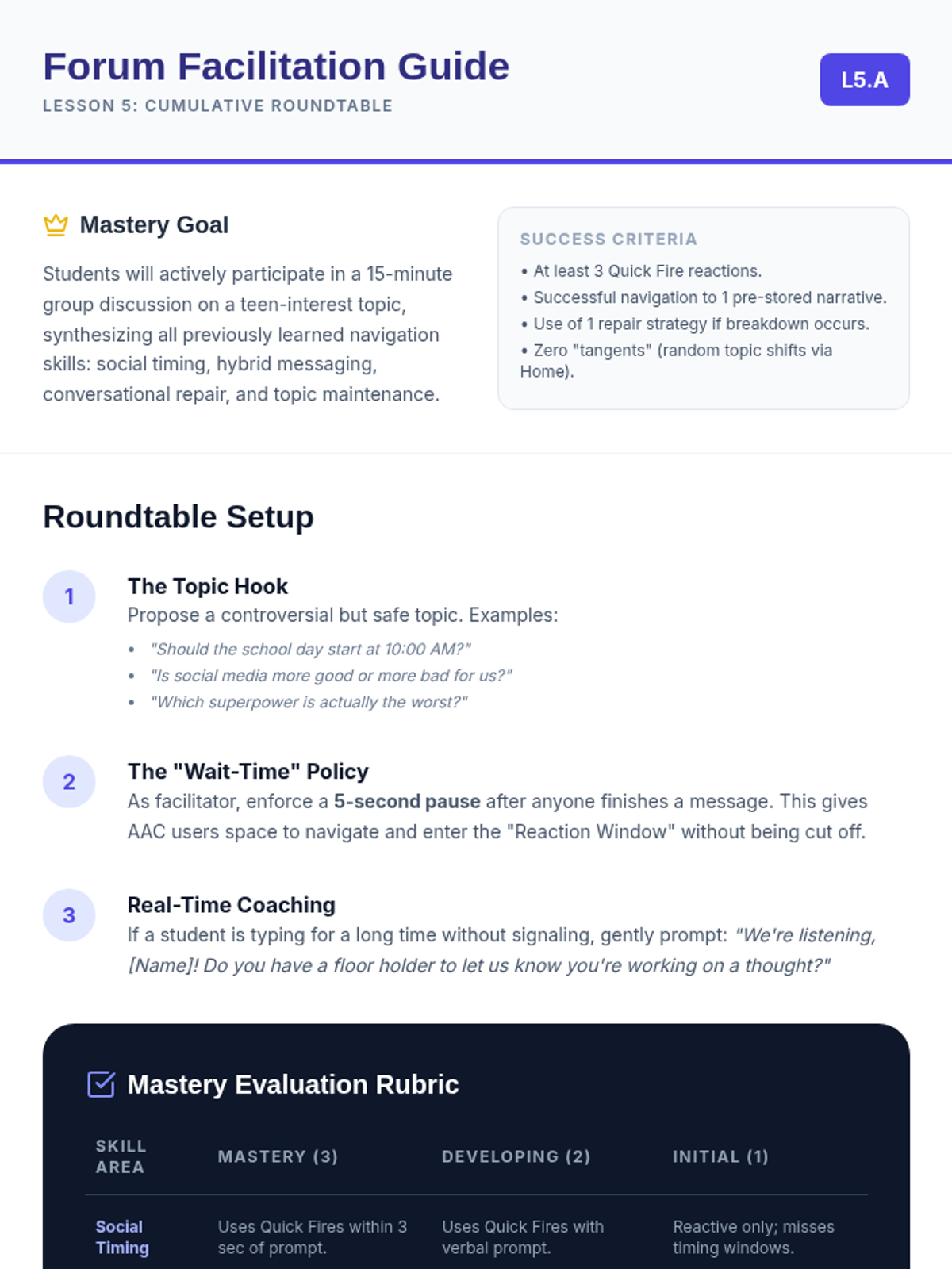 A 10th-grade AAC navigation sequence focused on social timing, conversational repair, and managing cognitive load during rapid peer interactions. Students learn to use quick-fire responses, share personal narratives, and maintain topic flow.