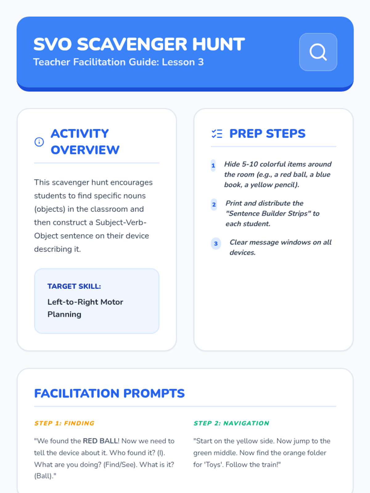 A comprehensive 6-week social skills and problem-solving program designed specifically for 2nd-grade students with ASD. The sequence uses a 'Social Detective' theme to teach self-regulation, perspective taking, empathy, and social problem-solving through visual supports and concrete activities.