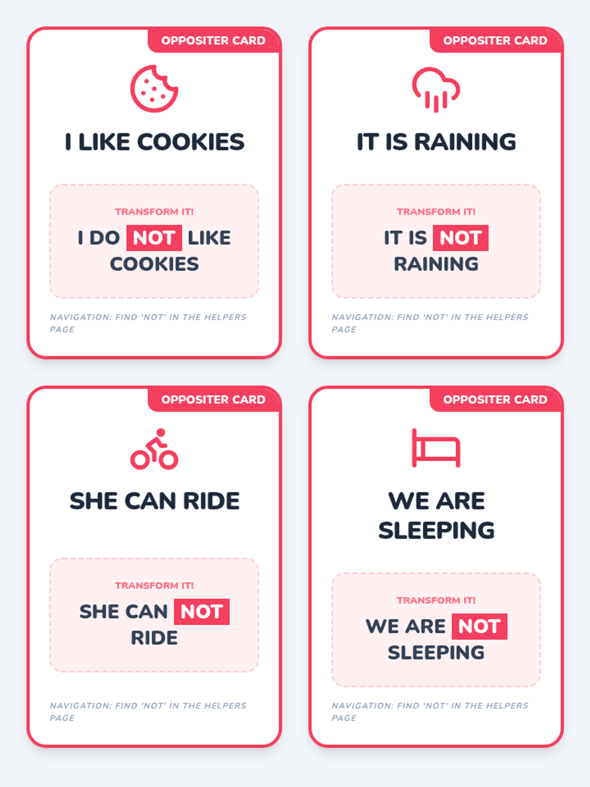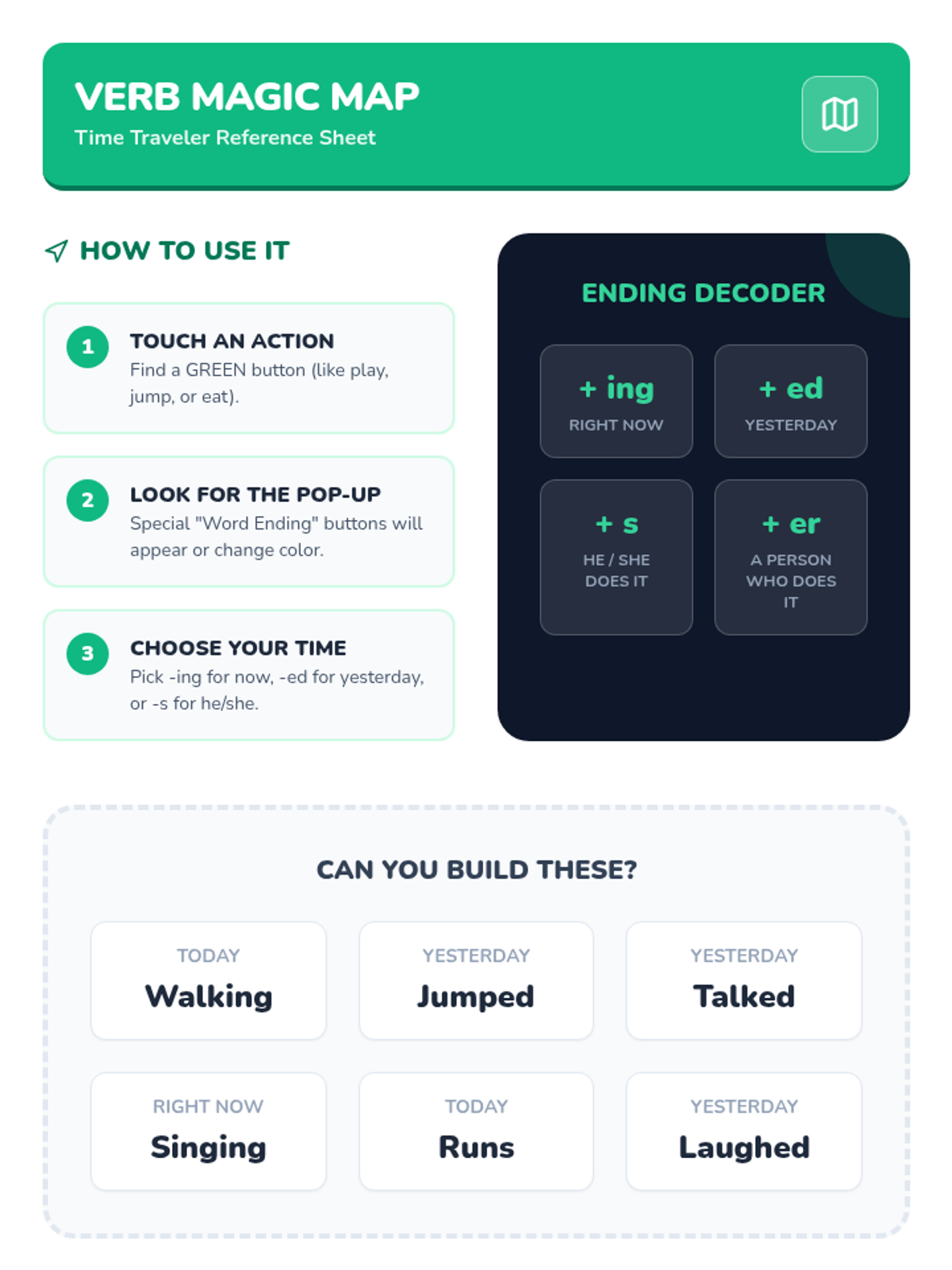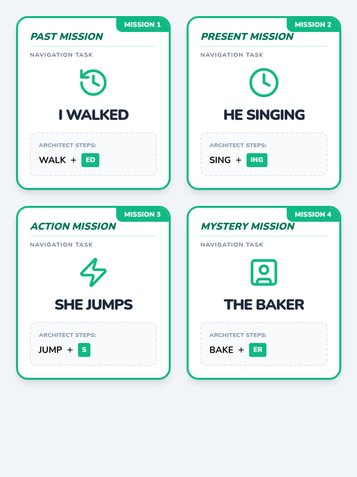 A sequence focused on teaching AAC users how to navigate their devices to build grammatically complex sentences, moving from basic pronoun selection to complex tense marking and negation.