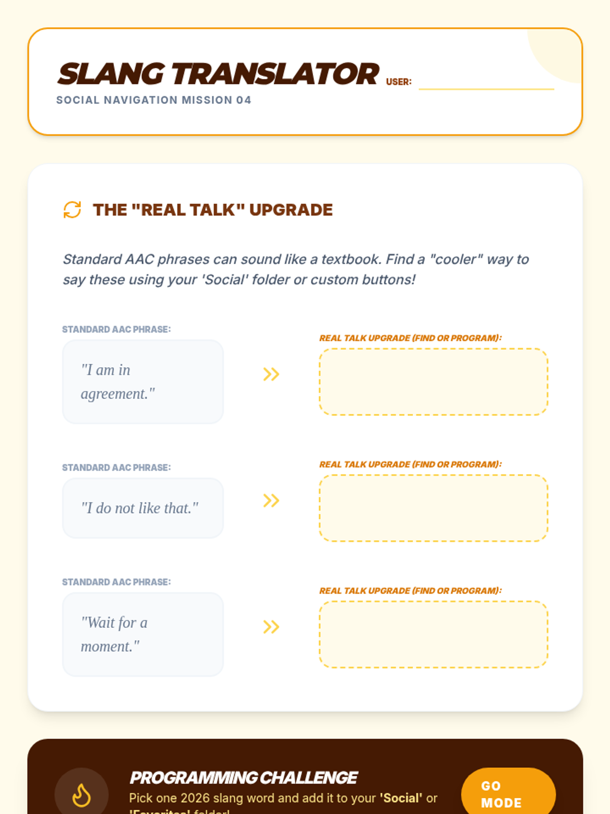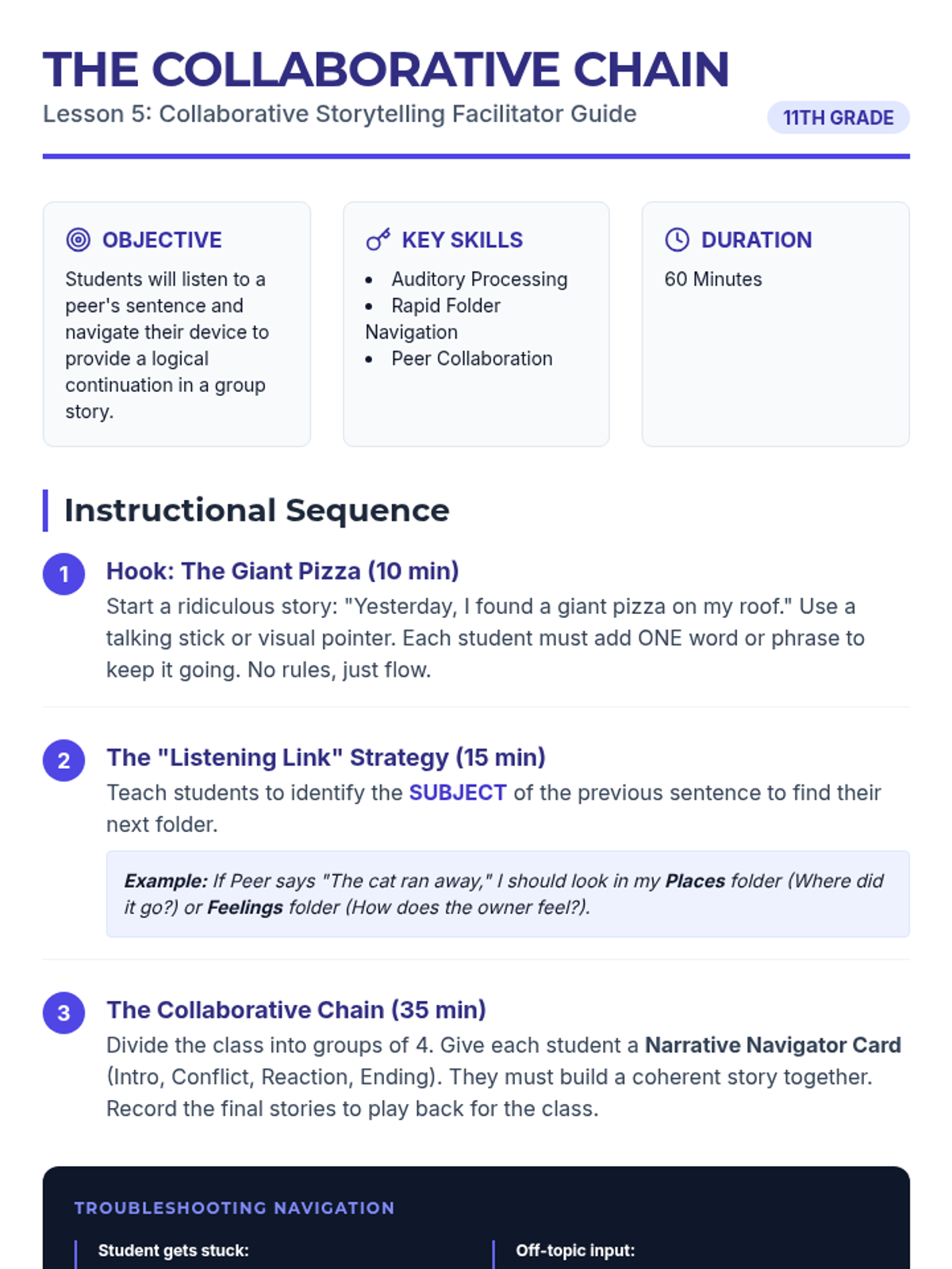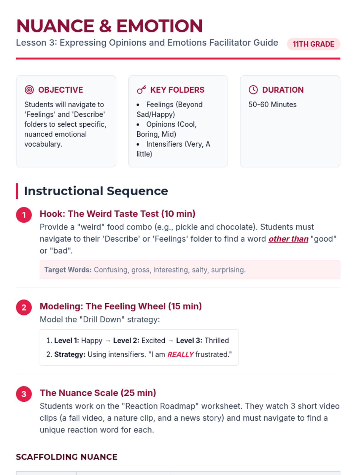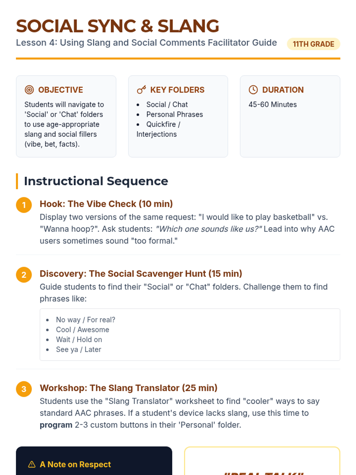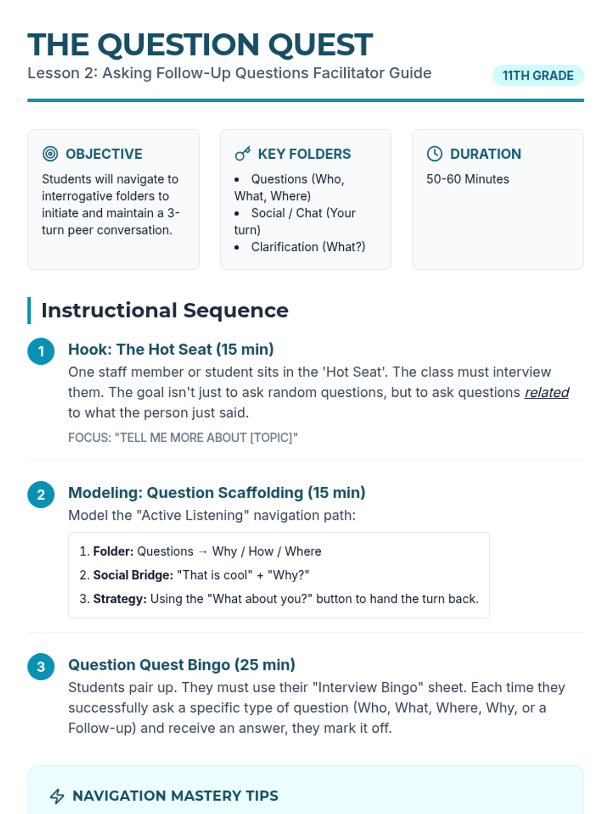 A specialized sequence for 11th-grade AAC users focused on transitioning from basic needs-based communication to complex social interaction, storytelling, and peer connection through advanced device navigation.