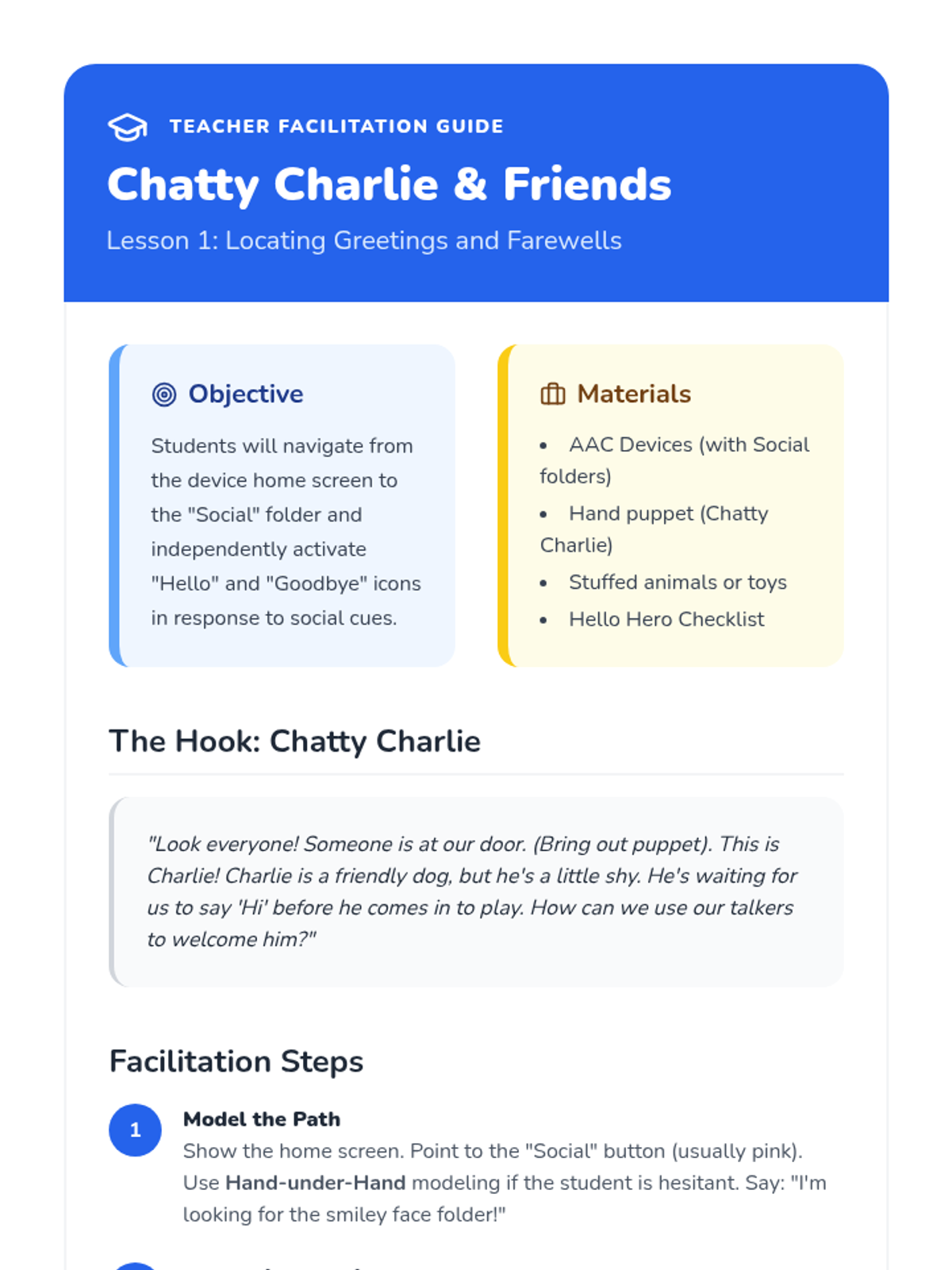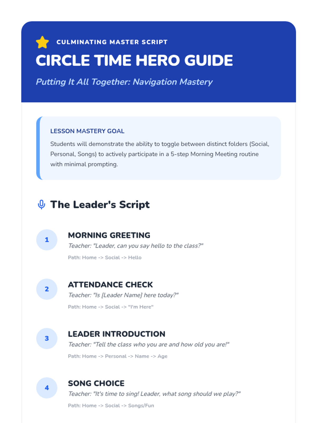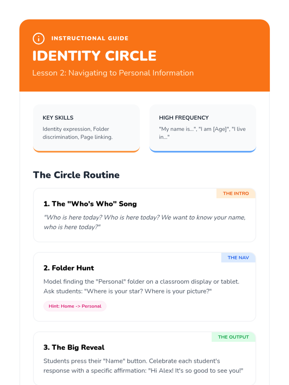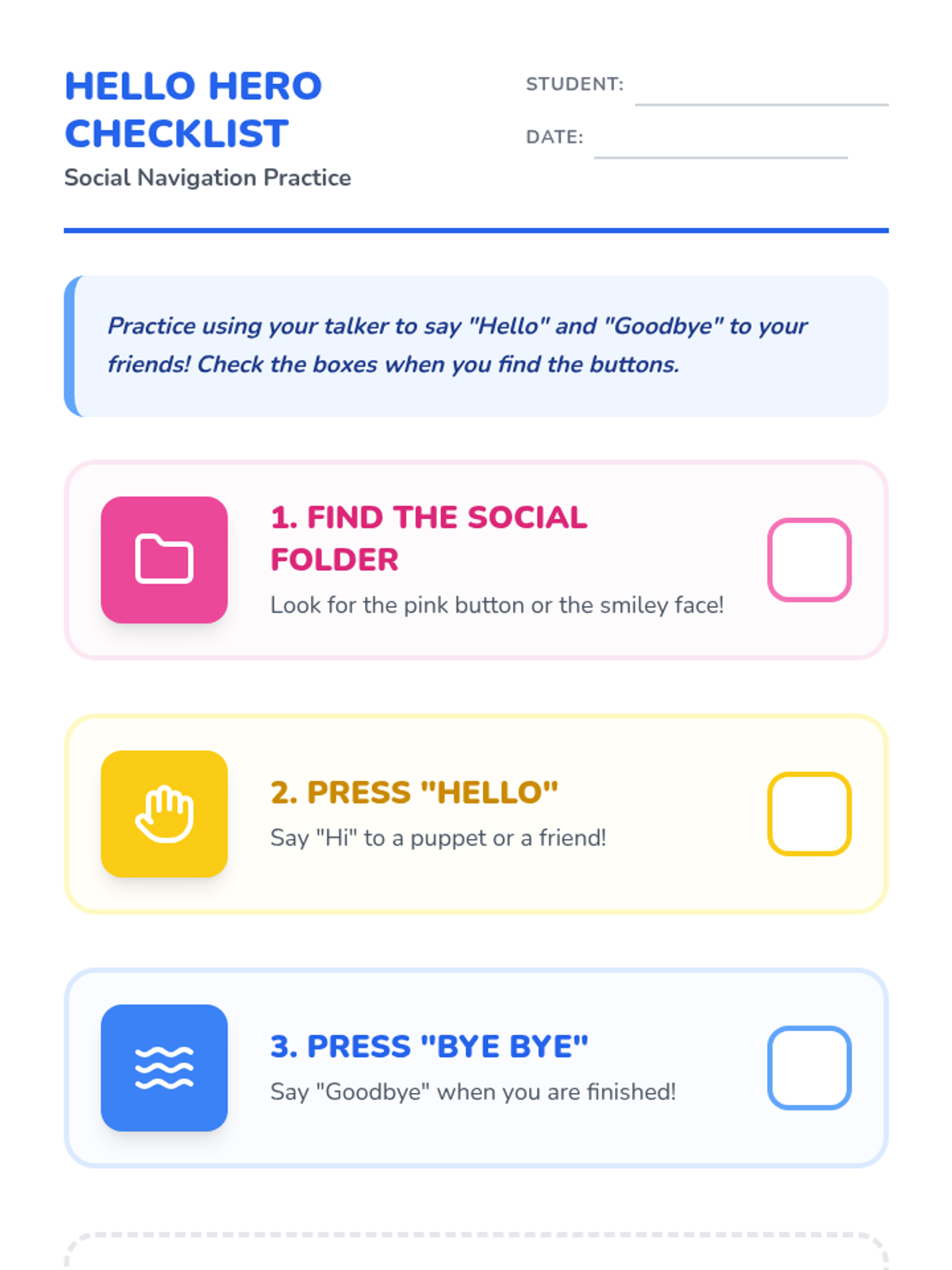 This sequence helps Pre-K students using AAC devices master the navigation of social folders to engage in greetings, share personal info, use manners, and participate in peer play. Through play-based simulations and circle time routines, students build the speed and independence needed for meaningful social connection.