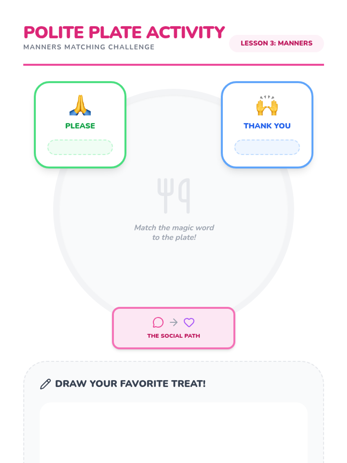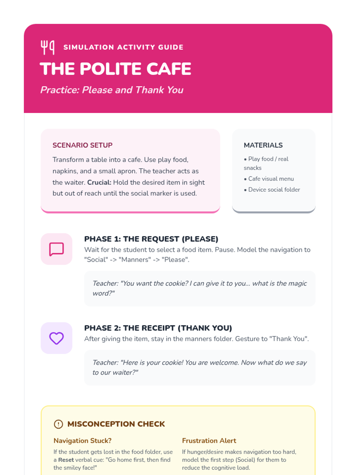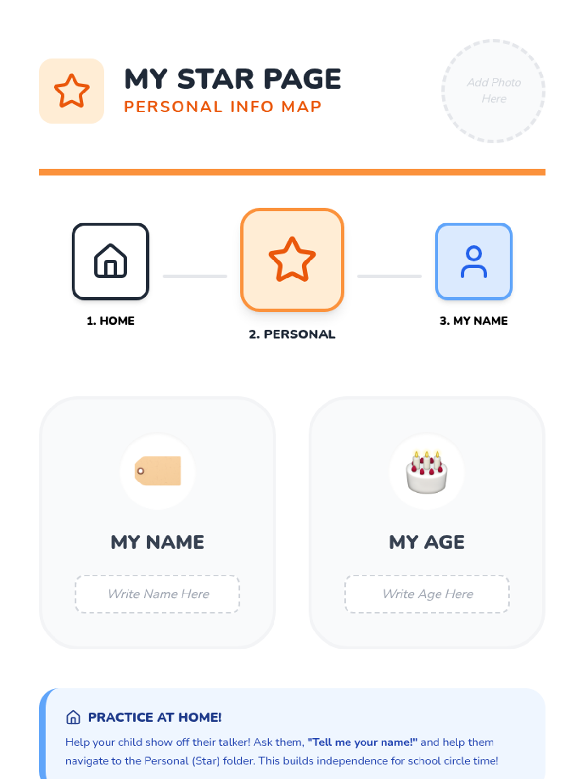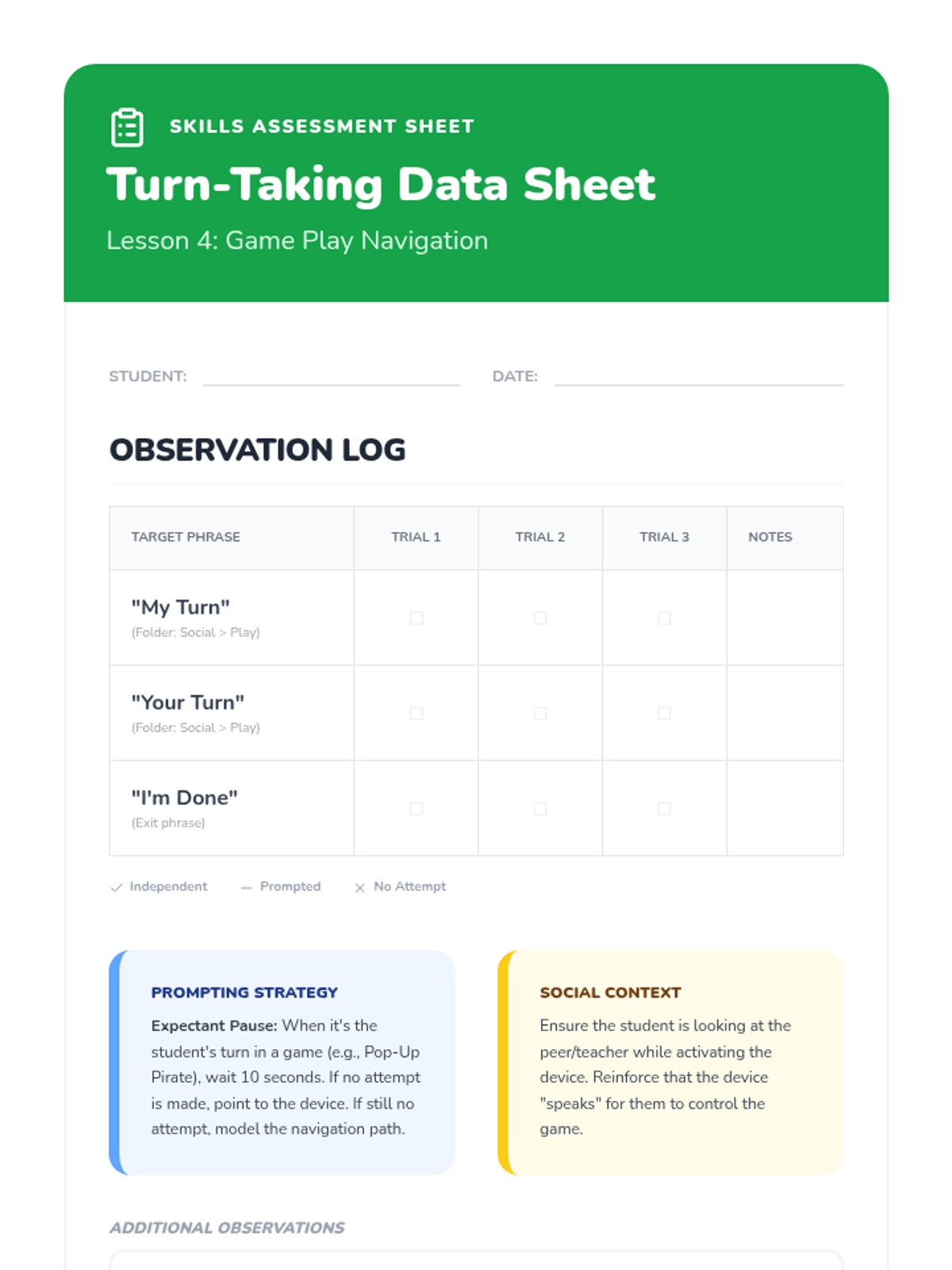 This sequence helps Pre-K students using AAC devices master the navigation of social folders to engage in greetings, share personal info, use manners, and participate in peer play. Through play-based simulations and circle time routines, students build the speed and independence needed for meaningful social connection.